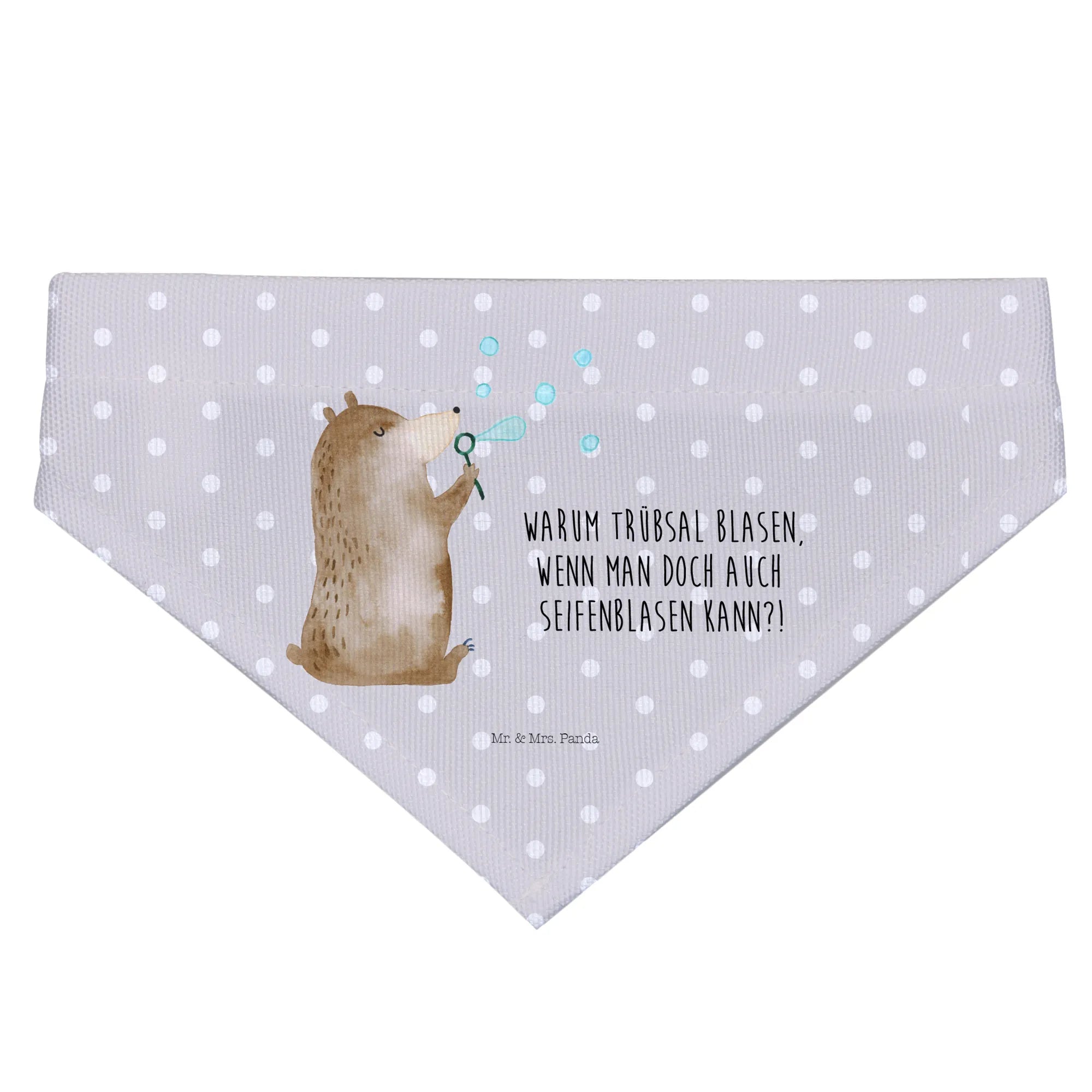 Ob zur Feier eines besonderen Anlasses oder einfach nur als kleine Freude zwischendurch – das Hundehalstuch ist ein ganz besonderes Geschenk, das jedem Hund und seinem Menschen ein Lächeln ins Gesicht zaubert. Der fröhliche Spruch „Warum Trübsal blasen, wenn man doch auch Seifenblasen kann?!” bringt die fröhliche Lebenshaltung von Mr. & Mrs. Panda perfekt zur Ausdruck.