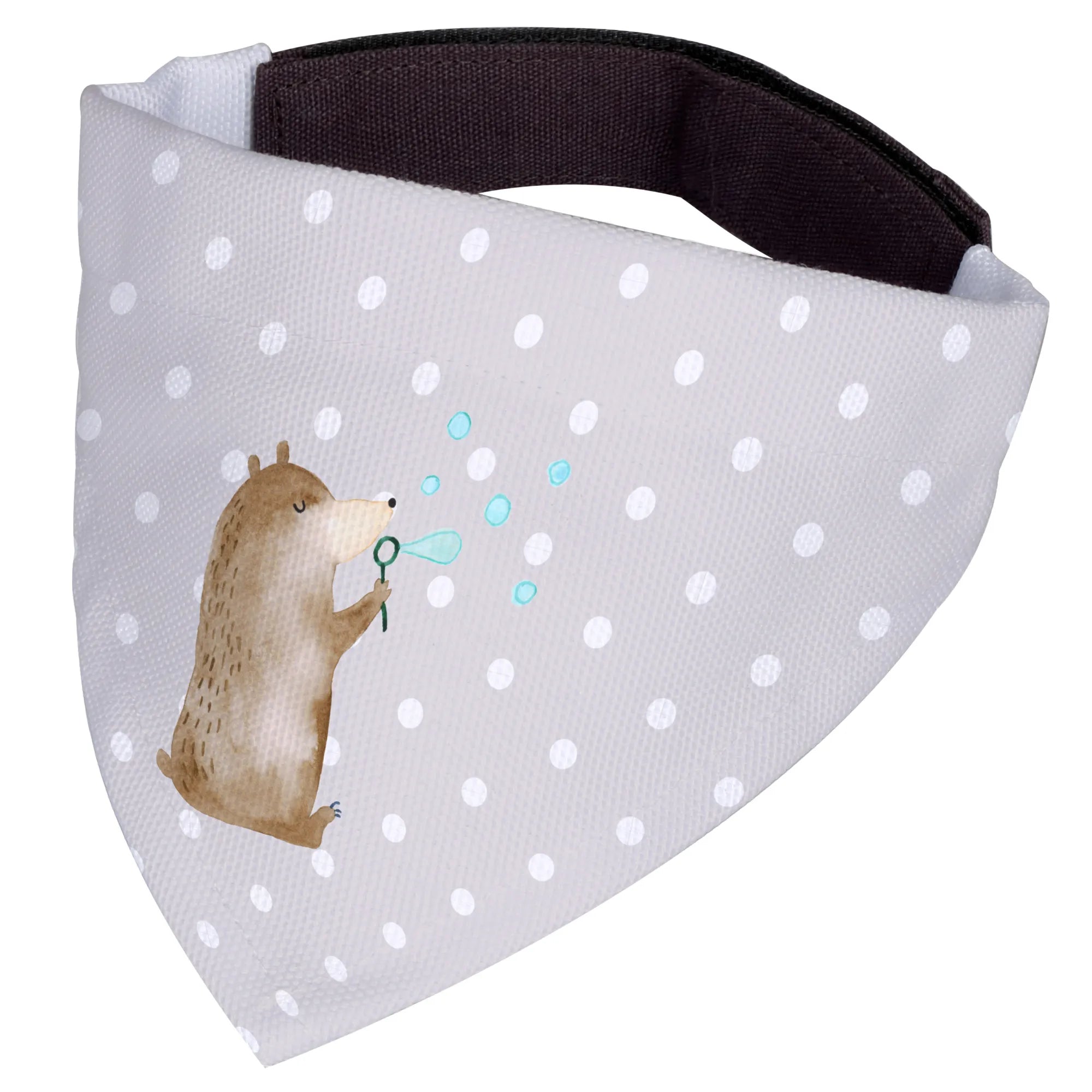 Das verspielte Design zeigt einen niedlichen Bären, der mit seinen großen, glitzernden Augen fröhlich Seifenblasen in die Luft pustet. Die liebevolle Gestaltung vermittelt eine positive Stimmung, die sowohl Hund als auch Mensch glücklich macht. Egal, ob beim Spaziergang, im Hundecafé oder bei einem Treffen mit Freunden – dein Hund wird der Star in diesem einzigartigen Halstuch!