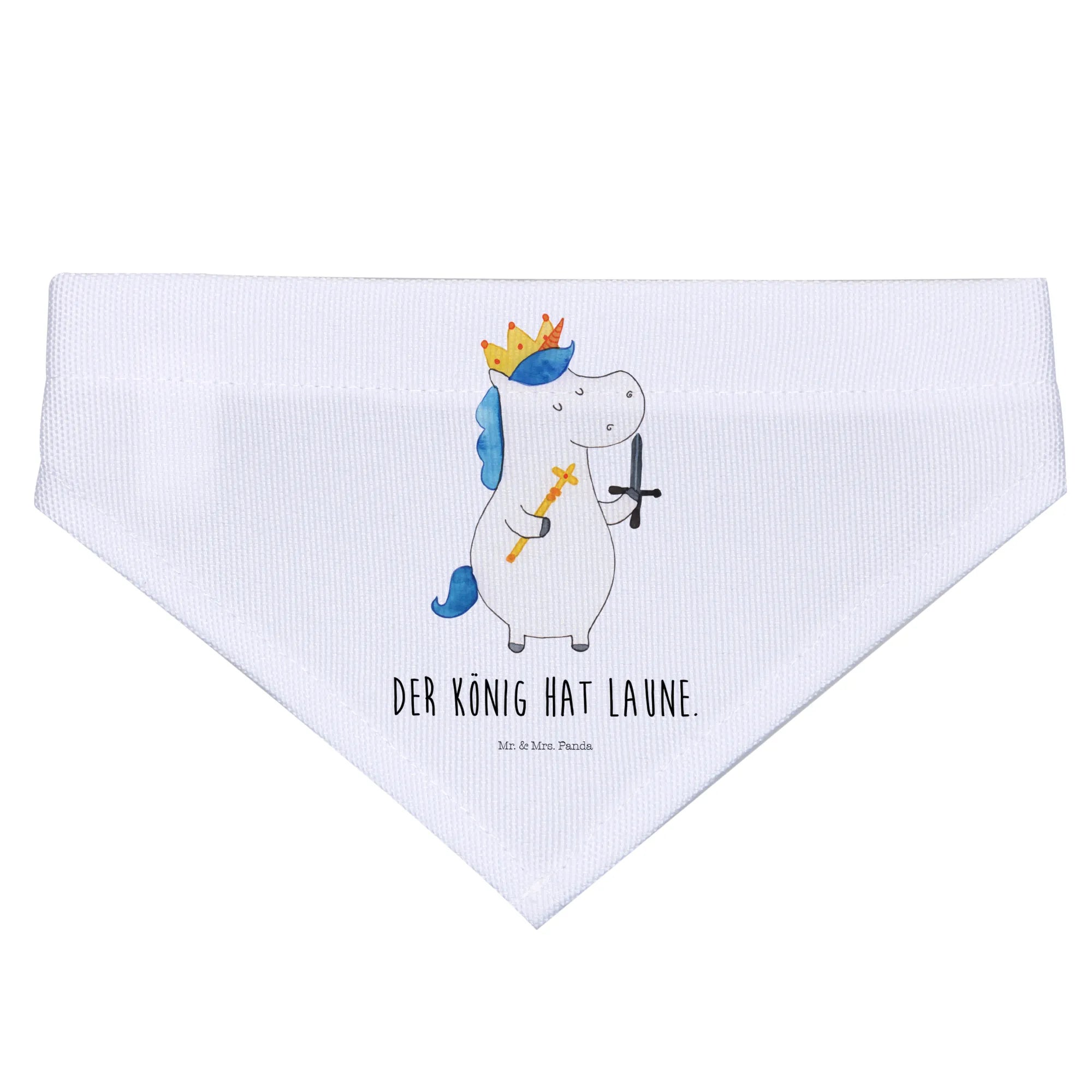 Das Hundehalstuch M Einhorn König mit Schwert aus der zauberhaften Einhorn-Kollektion von Mr. & Mrs. Panda ist das perfekte Accessoire für mittelgroße Hunde und deren Besitzer, die die magische Welt der Einhörner lieben. Das süße Design zeigt ein liebevoll handgezeichnetes Einhorn mit einer Krone auf dem Kopf und einem Schwert in der Hand, das den Spruch "Der König hat Laune" trägt.