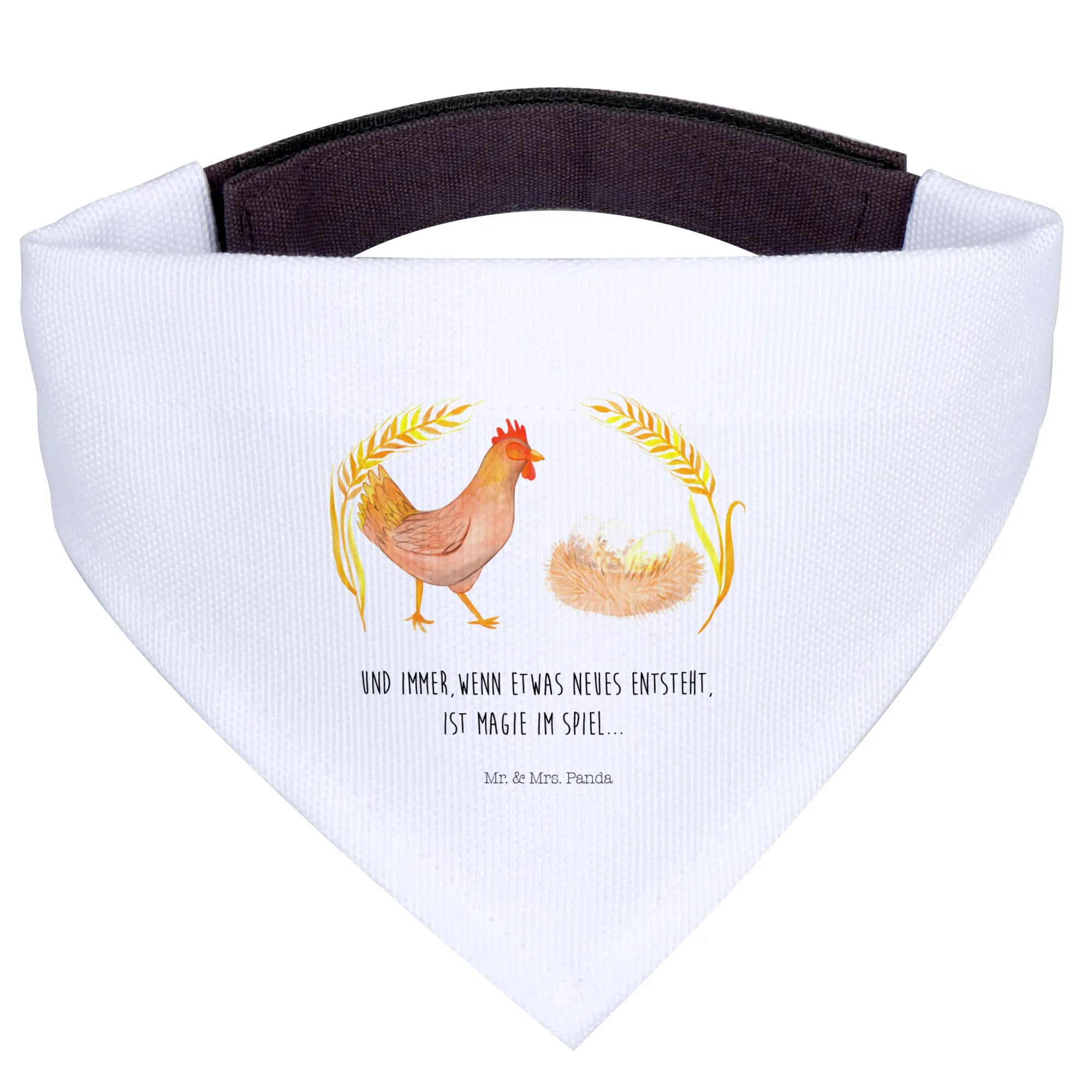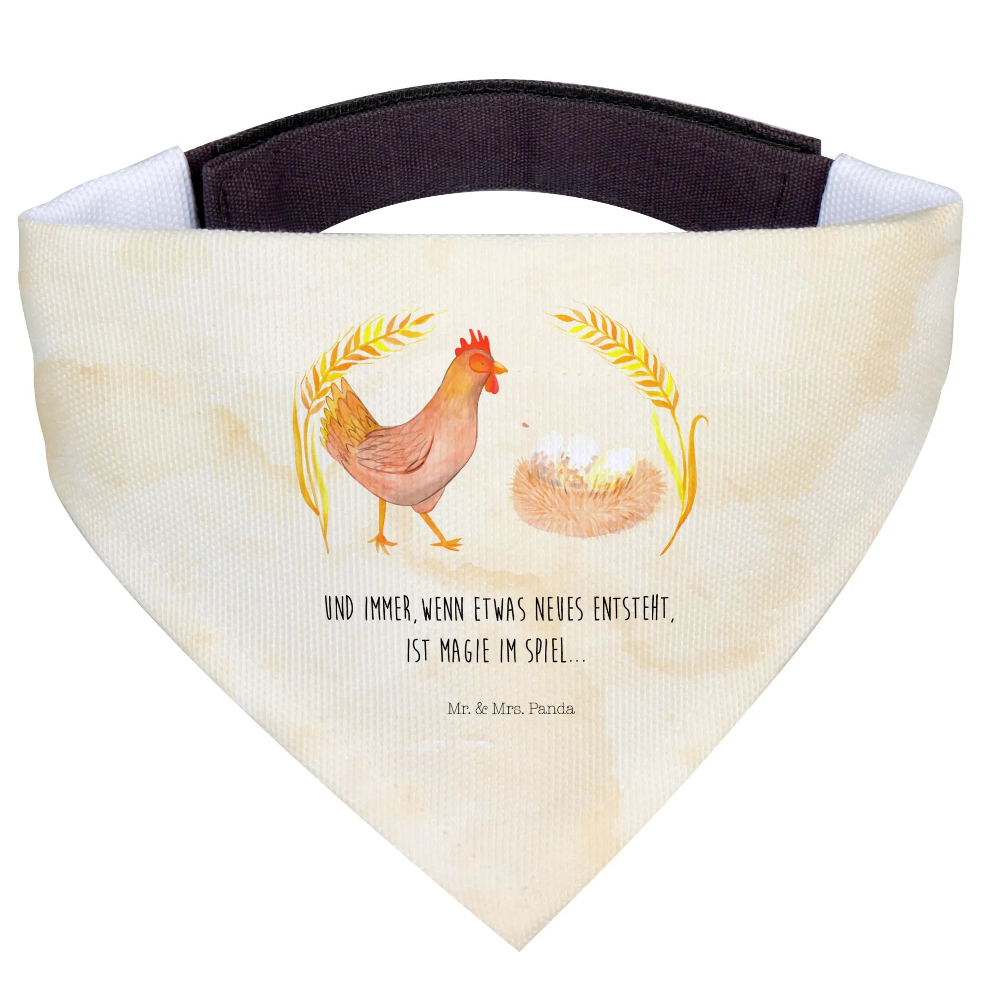 Das Motiv zeigt Berta das Huhn, die mit ihrem stolzen Gang und dem Spruch 'Und immer, wenn etwas neues entsteht, ist Magie im Spiel.' die Freude an neuen Abenteuern und Lebensabschnitten verbreitet. Dies macht das Halstuch auch zum idealen Geschenk für besondere Anlässe wie Geburtstage, Welpengeburt, oder einfach als kleine Aufmerksamkeit für einen tierlieben Freund.
