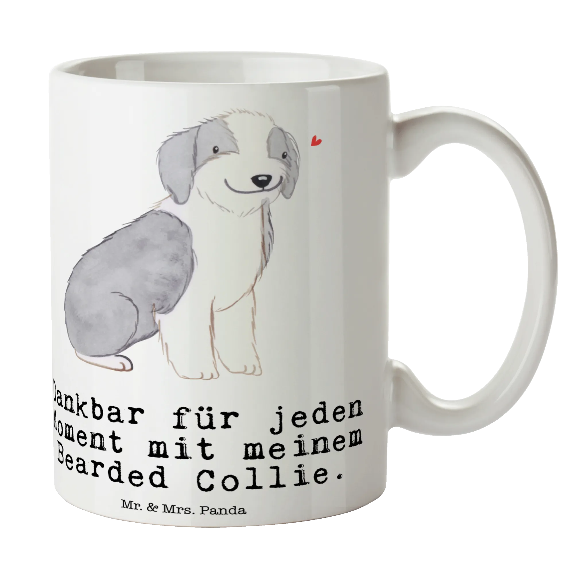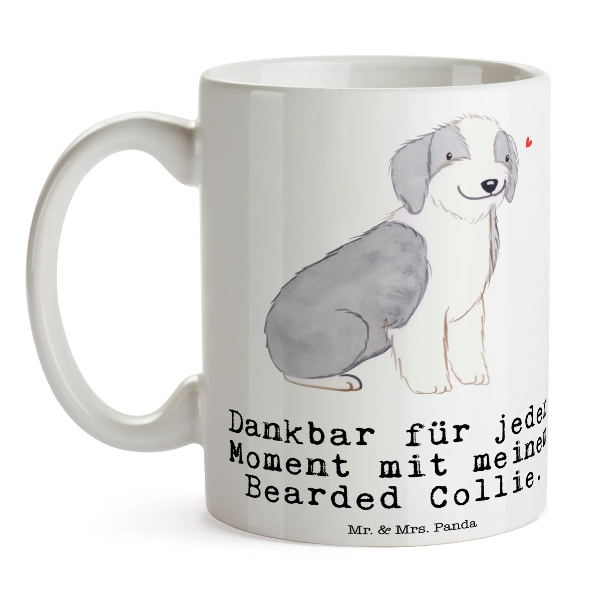 Das zarte, flauschige Fell des Bearded Collie in harmonischen Grautönen sorgt für eine einladende Ausstrahlung und macht die Tasse zu einem echten Hingucker.