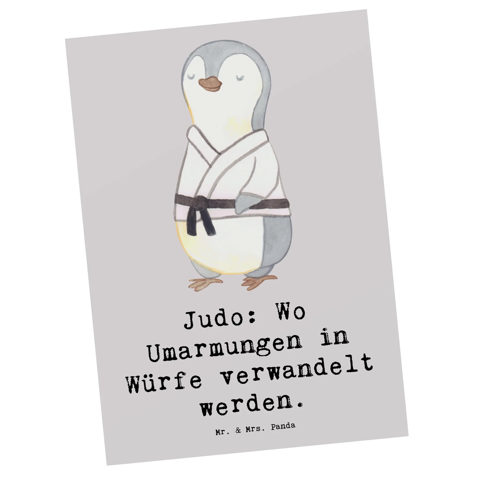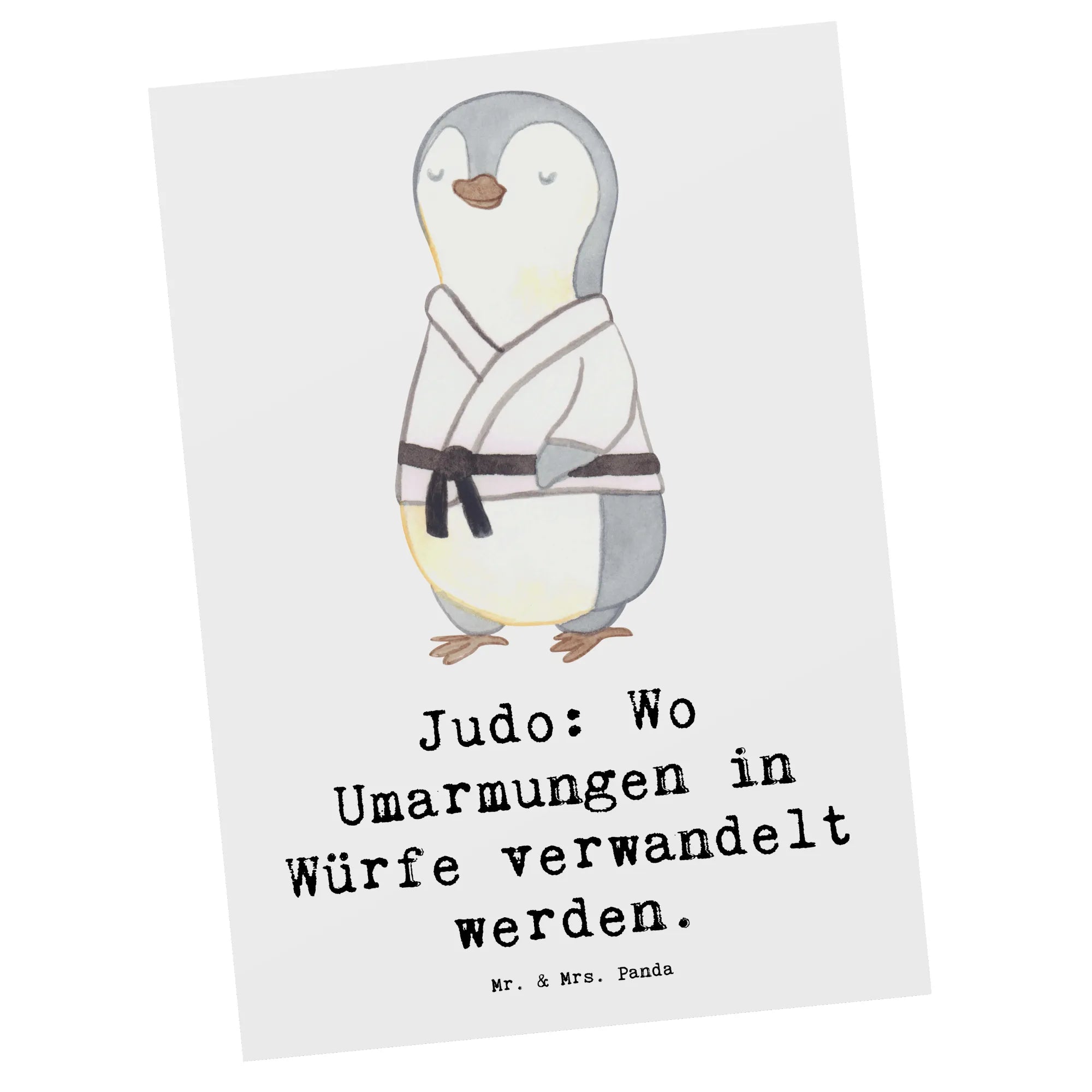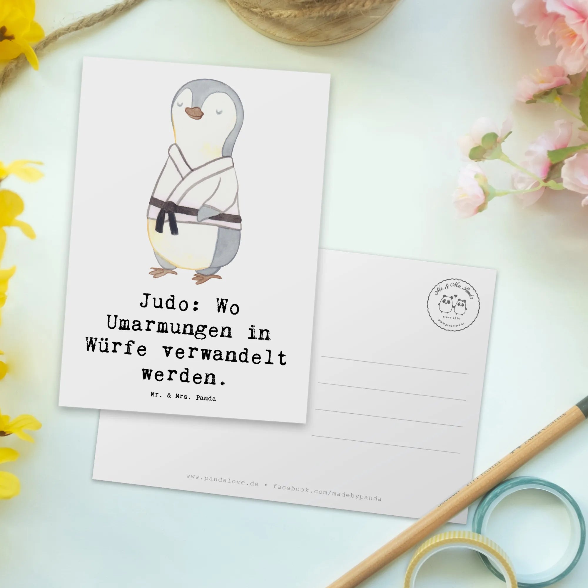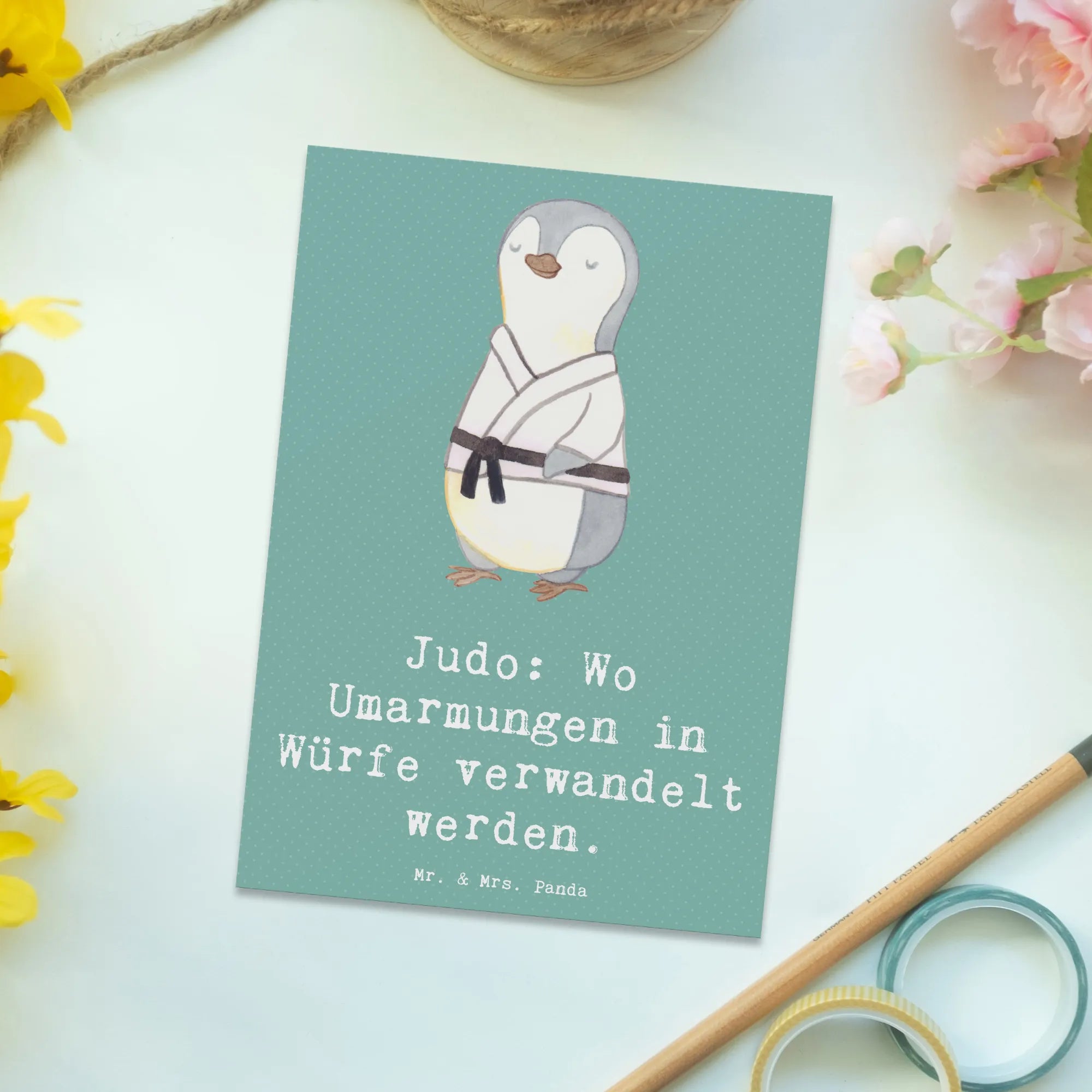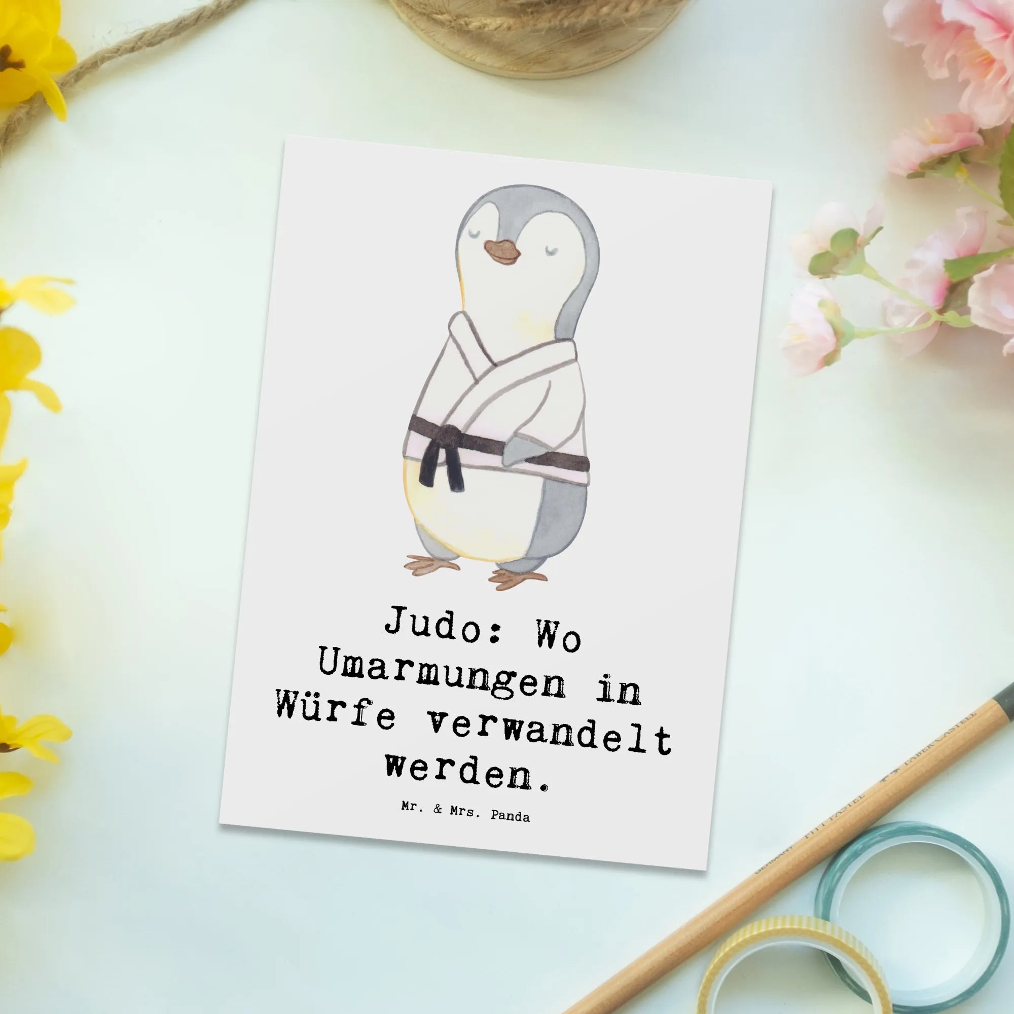Die einzigartige Postkarte von Mr. & Mrs. Panda mit dem liebevollen Judo-Motiv ist das perfekte Geschenk für alle Sportbegeisterten und Judo-Fans. Egal, ob du selbst leidenschaftlich Judoka bist oder jemandem eine Freude machen möchtest, diese Karte ist genau das Richtige. Mit dem zuckersüßen Spruch 'Judo: Wo Umarmungen in Würfe verwandelt werden.' bringt sie gleich gute Laune und die richtige Portion Motivation.