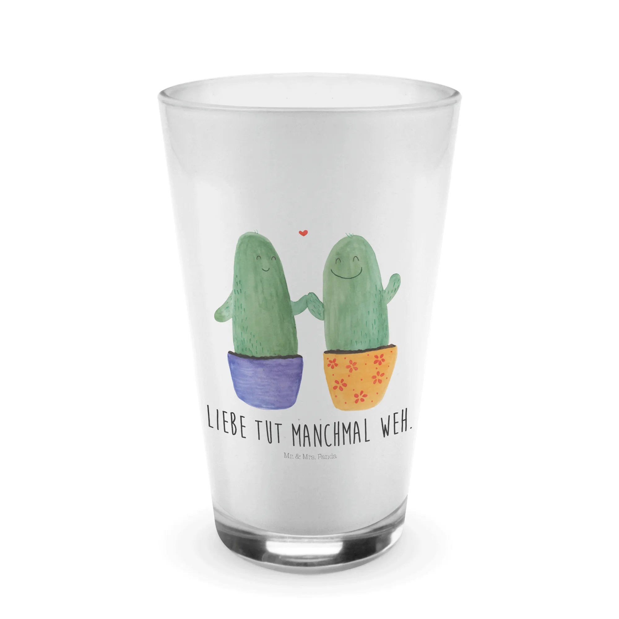Das edle Kaktus Liebe Glas von Mr. & Mrs. Panda ist einfach der perfekte Begleiter für Kaffeeliebhaber! Mit seinem ansprechenden Design und dem charmanten Kaktus-Motiv zaubert es jedem ein Lächeln ins Gesicht. Das liebevoll handgezeichnete Aquarellmotiv mit zwei fröhlichen Kakteen, die einander voller Zuneigung anschauen, ist nicht nur ein echter Hingucker, sondern auch ein Ausdruck von Freundschaft und Liebe.
