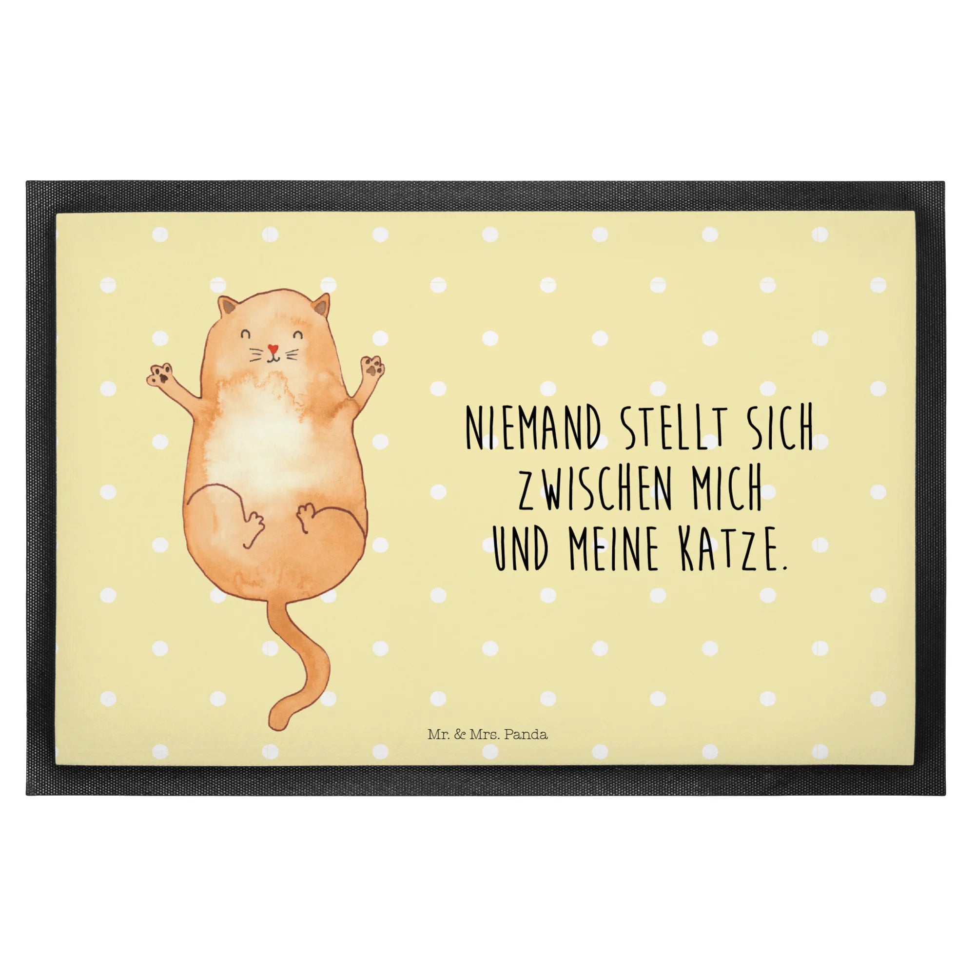 Die handgezeichneten Motive von Mr. & Mrs. Panda verleihen dieser Fußmatte einen einzigartigen Charme. Die süße Katze, die auf dem Rücken liegt und ihre Arme ausbreitet, ist nicht nur ein hübsches Deko-Element, sondern sagt auch viel über die Zuneigung von Katzenbesitzern aus.