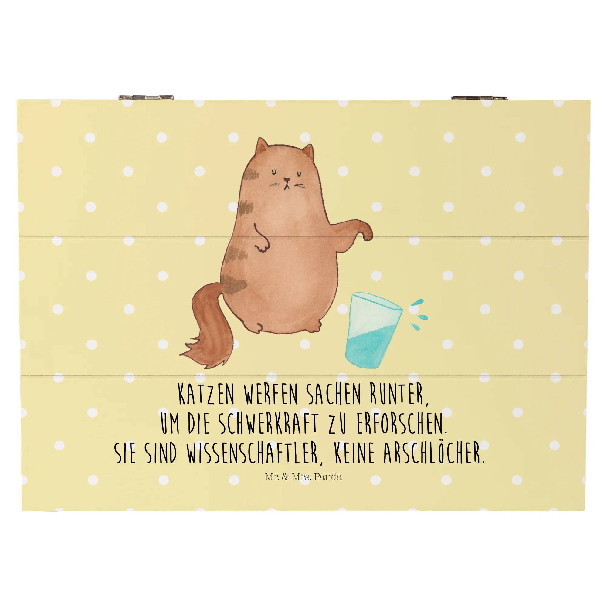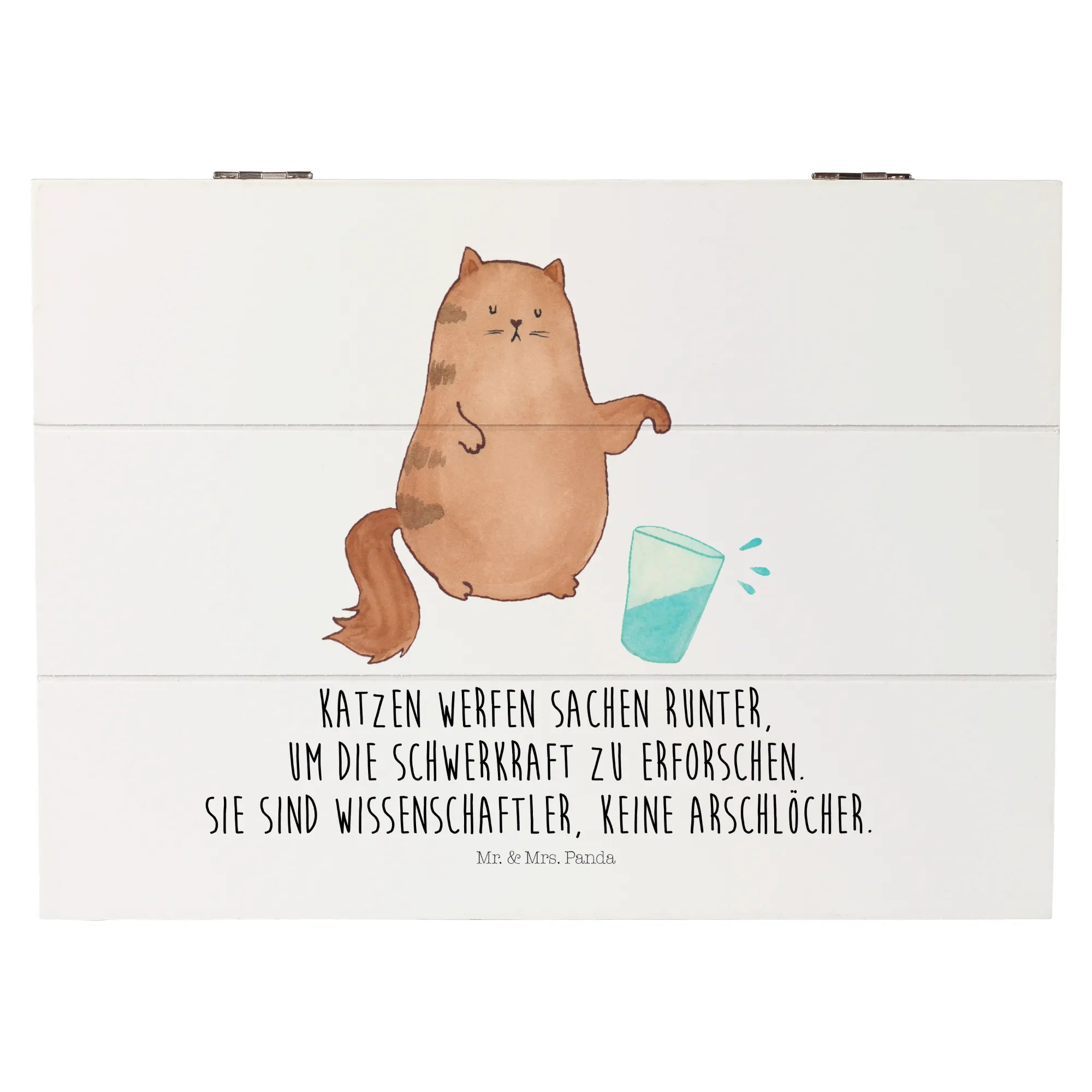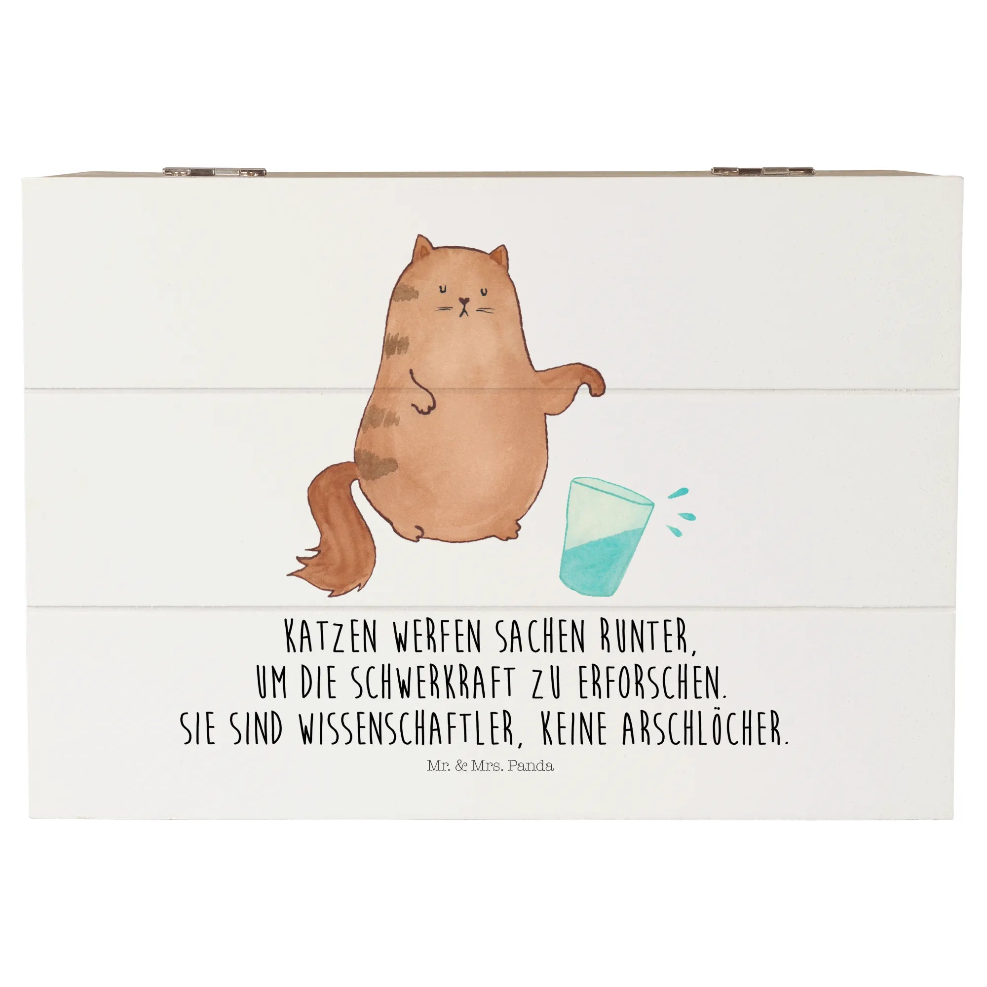 Die Kiste ist mit dem süßen Katzenmotiv "Katze Wasserglas" bedruckt, das von Mrs. Panda liebevoll handgezeichnet wurde. Das Design spiegelt den charmanten Charakter jeder Katze wider und bringt ein Lächeln in dein Gesicht. Der Spruch "Katzen werfen Sachen runter, um die Schwerkraft zu erforschen. Sie sind Wissenschaftler, keine Arschlöcher." ist nicht nur witzig, sondern auch ein kleiner Hinweis darauf, wie verspielt Katzen wirklich sind.