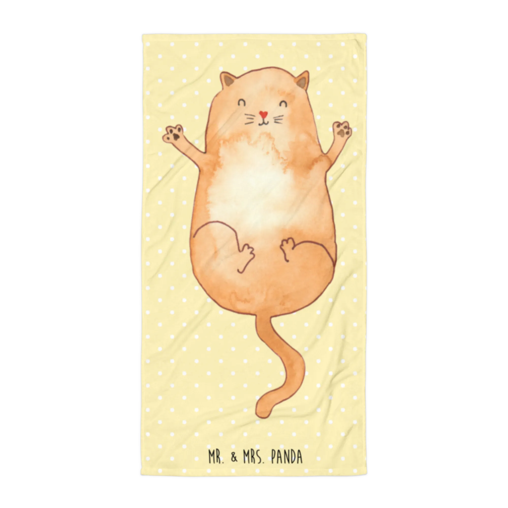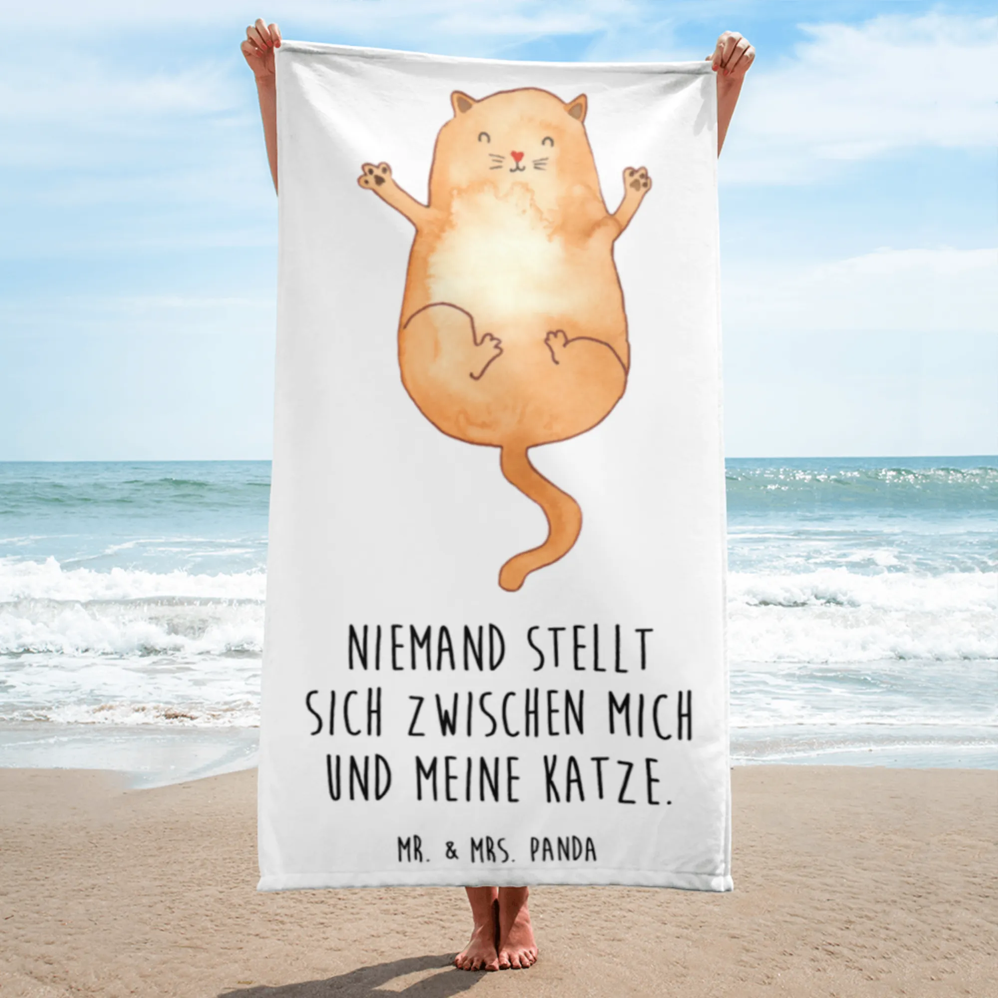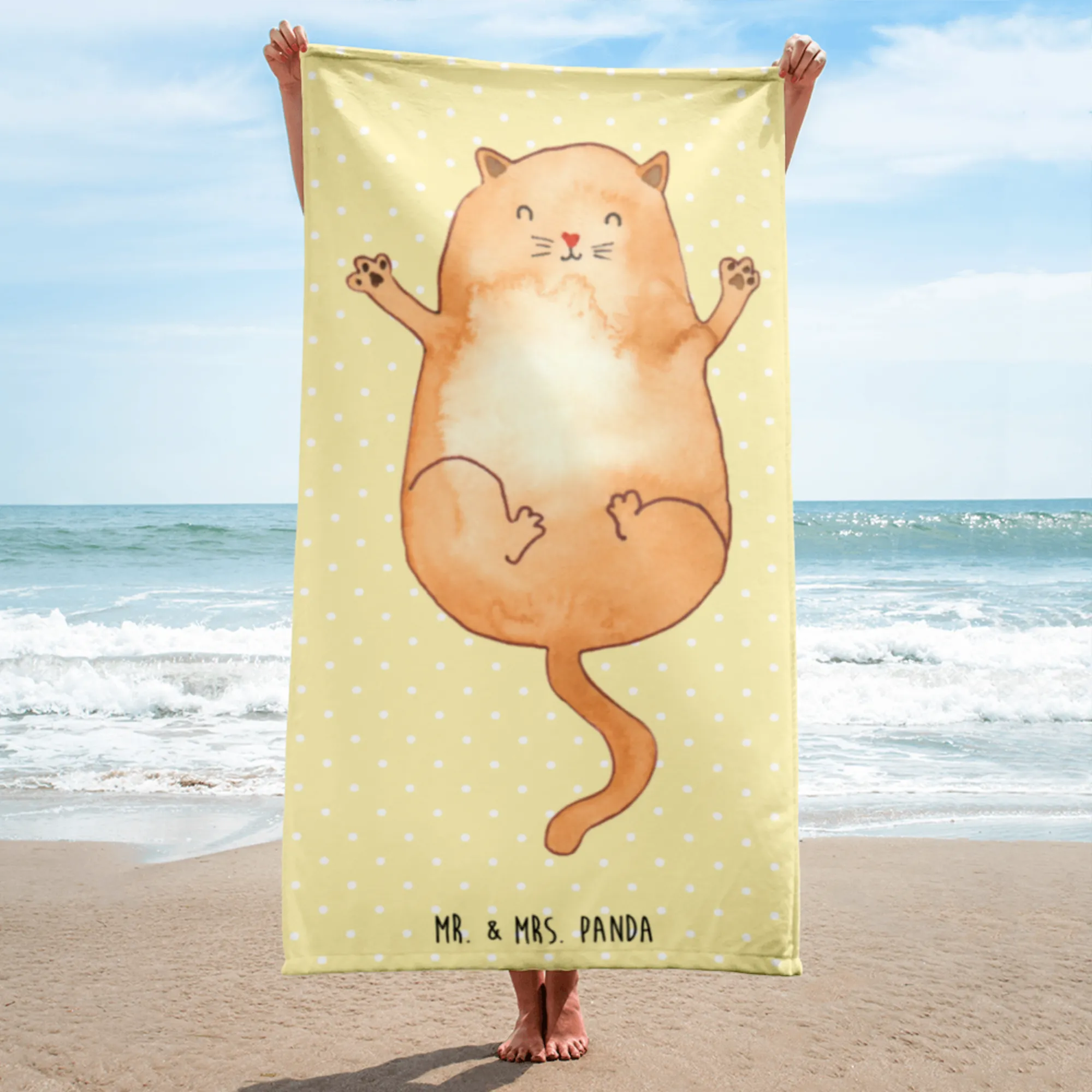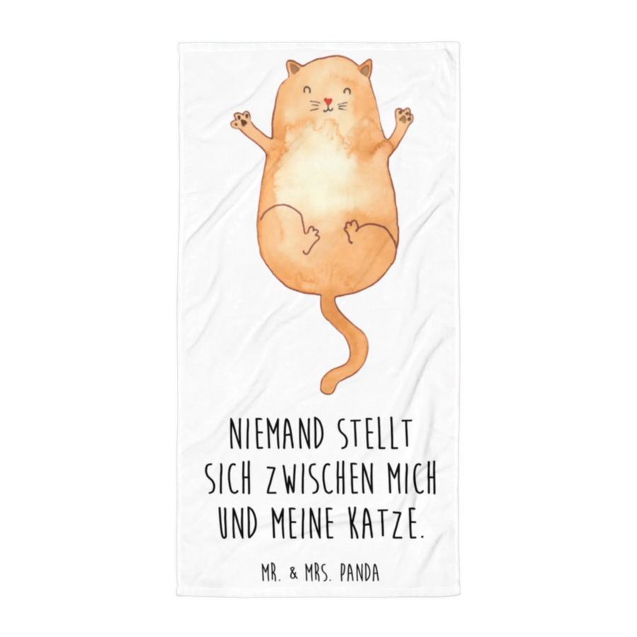Hergestellt aus hochwertigem Baumwollfrottee, fühlt sich das Handtuch unglaublich weich an und ist gleichzeitig ultra saugfähig. Die Rückseite besteht aus feinster Baumwolle, die dafür sorgt, dass Du nach dem Baden oder Schwimmen schnell wieder trocken wirst. Die Vorderseite begeistert mit einem strahlenden Katzenmotiv, das liebevoll von Hand gezeichnet wurde – eine süße Katze, die auf dem Rücken liegt und ihre Arme ausbreitet.