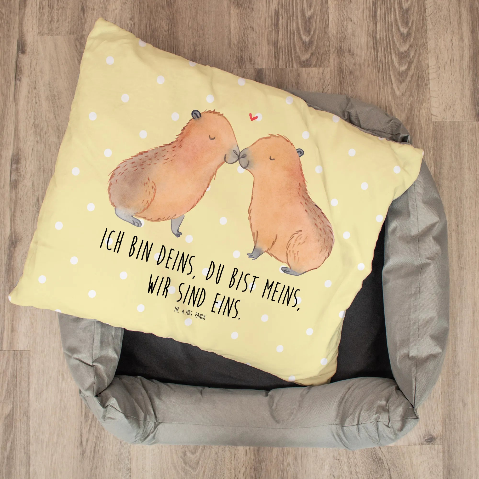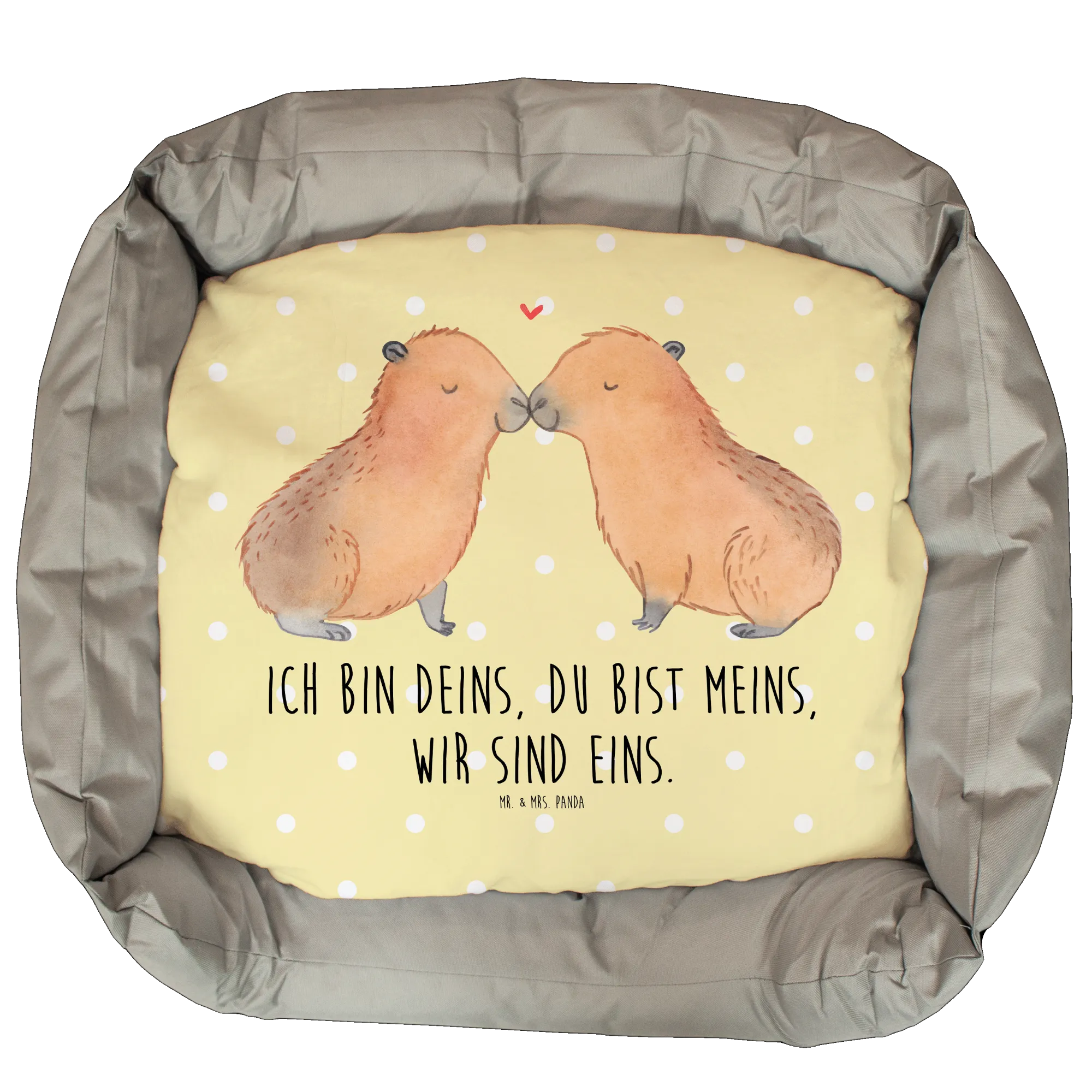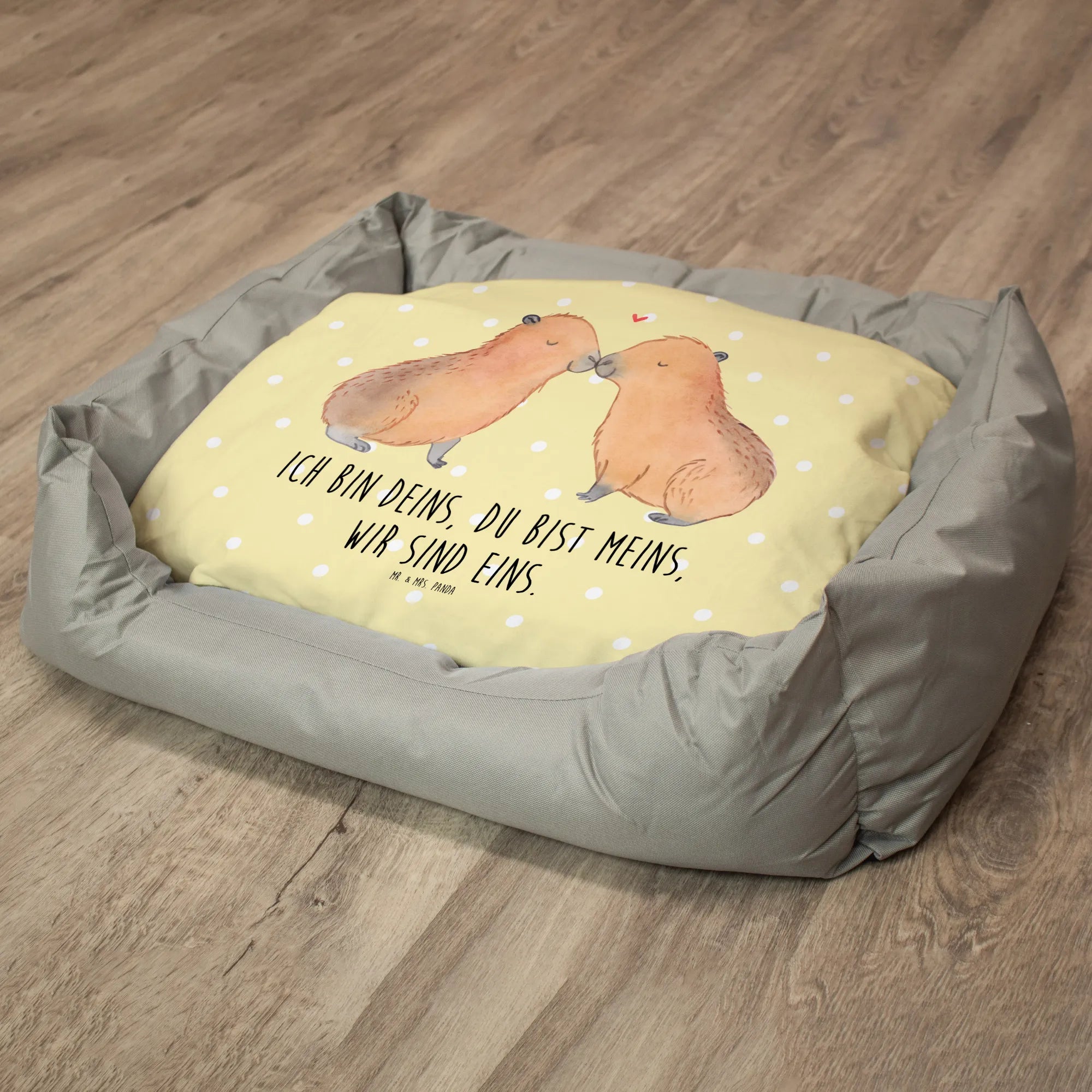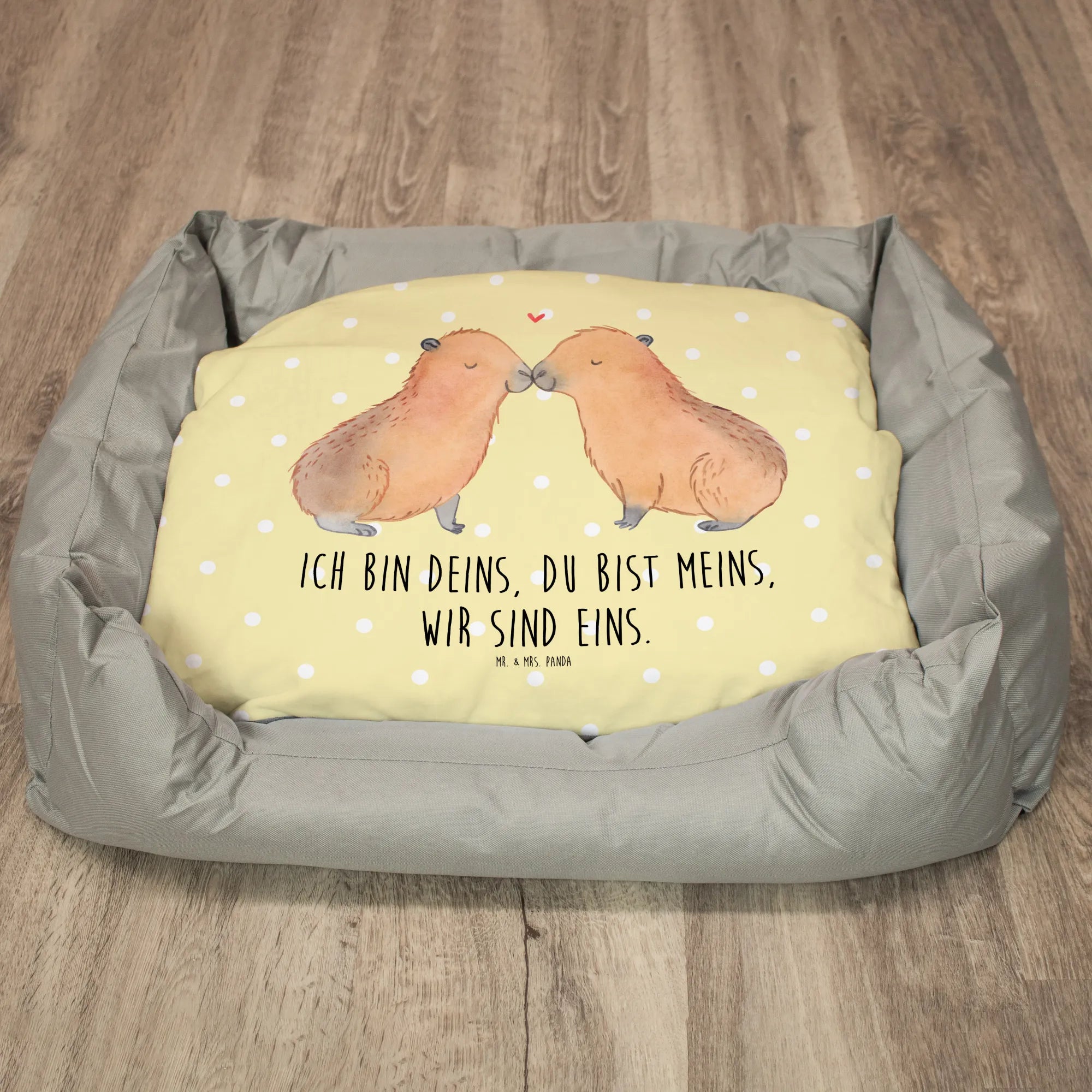 Das Katzenbett Capybara Liebe von Mr. & Mrs. Panda ist das perfekte Geschenk für Katzenfreunde, die ihren geliebten Vierbeiner mit einem besonders gemütlichen Rückzugsort verwöhnen möchten. Mit seinem süßen Motiv von zwei verliebten Capybaras, die sich liebevoll an den Schnauzen berühren, sorgt dieses Bett für ein wohliges Gefühl der Geborgenheit. Das handgezeichnete Design zeigt die Capybaras in sanften Brauntönen, harmonisch begleitet von einem schwebenden kleinen Herzchen, das die unendliche Tierliebe symbolisiert.