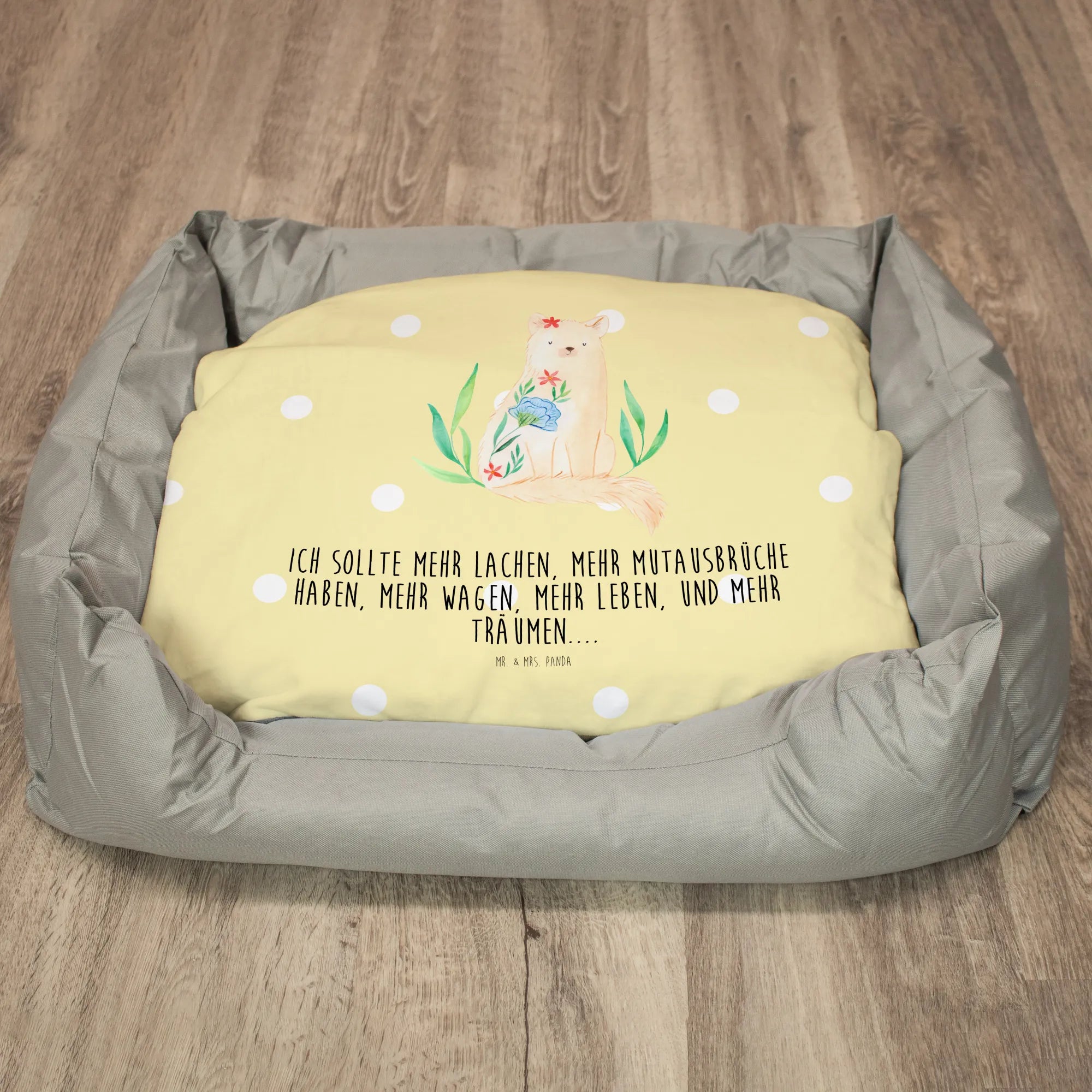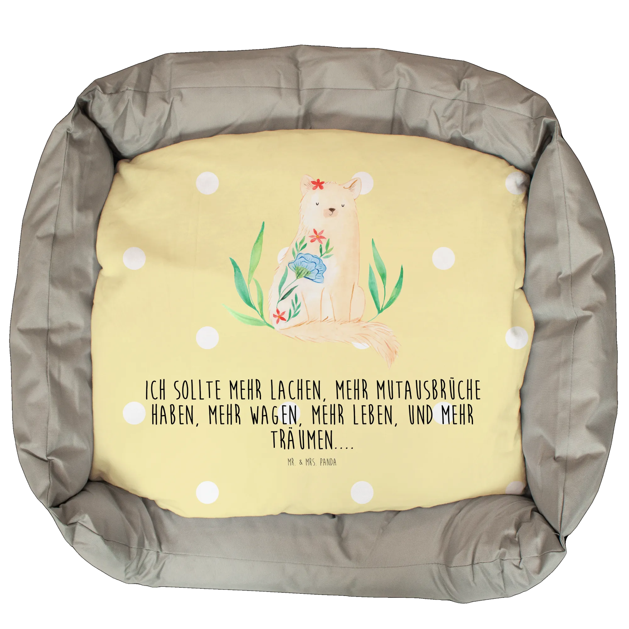 Das Katzenbett Katze Blumen von Mr. & Mrs. Panda ist der perfekte Ort für deine geliebte Katze, um sich zurückzuziehen und zu entspannen. Mit einem bezaubernden Motiv, das eine süße Katze umgeben von bunten Blumen zeigt, zieht es jeden Katzenliebhaber in seinen Bann.