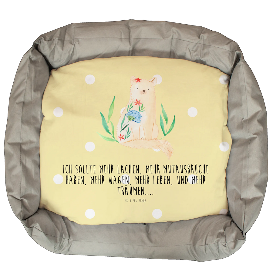 Egal ob als Geschenk zum Geburtstag, zu Weihnachten oder einfach als kleine Aufmerksamkeit zwischendurch – mit dem Katzenbett ‚Katze Blumen‘ zauberst du jedem Katzenfreund ein Lächeln ins Gesicht! Darüber hinaus stärkt der eingestickte Slogan „Ich sollte mehr lachen, mehr Mutausbrüche haben, mehr wagen, mehr leben, und mehr träumen…“ die Botschaft von Selbstliebe und Mut.