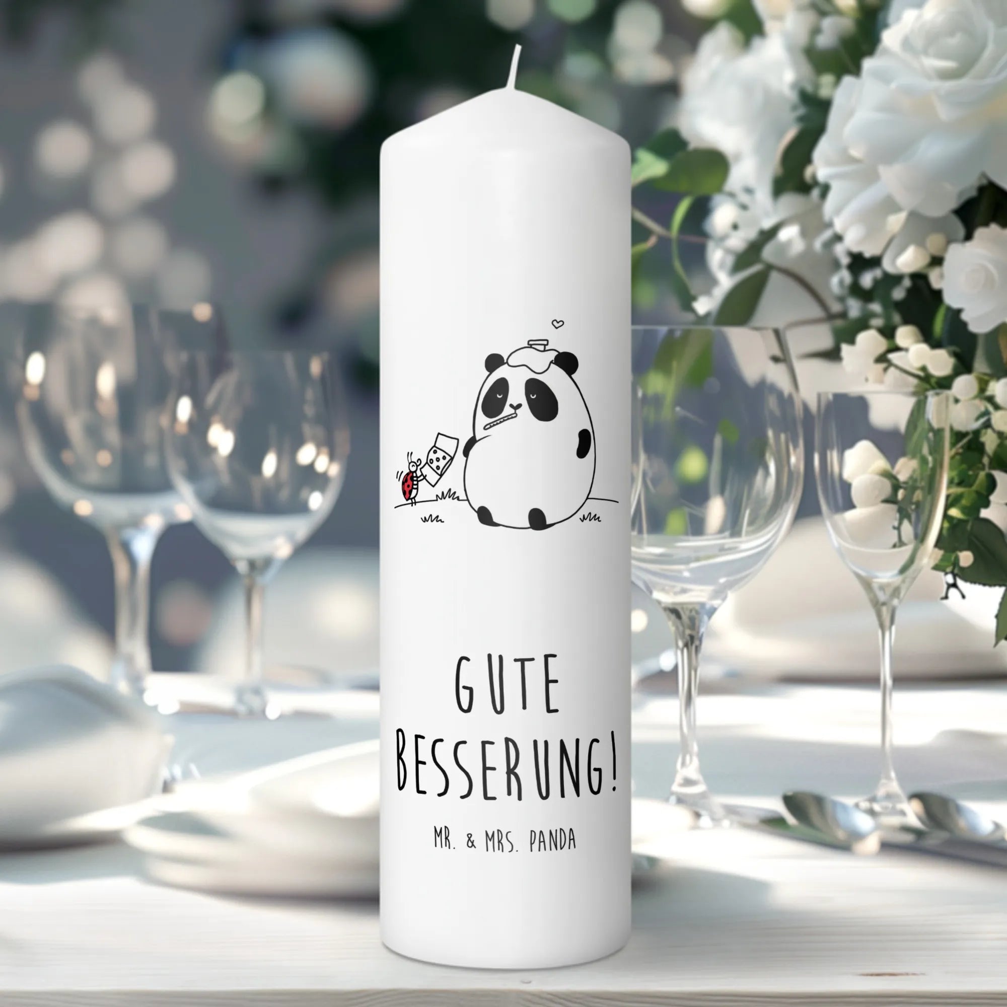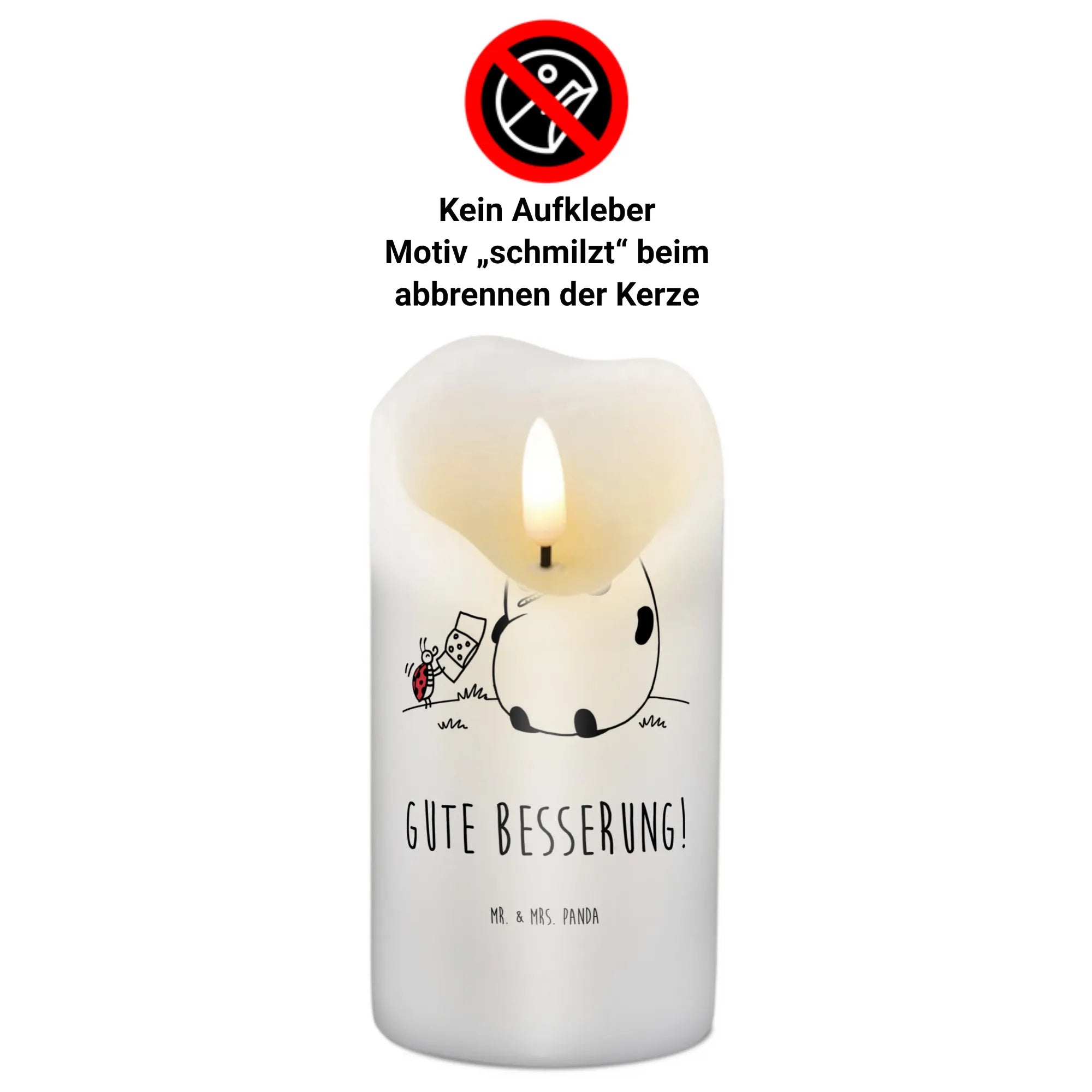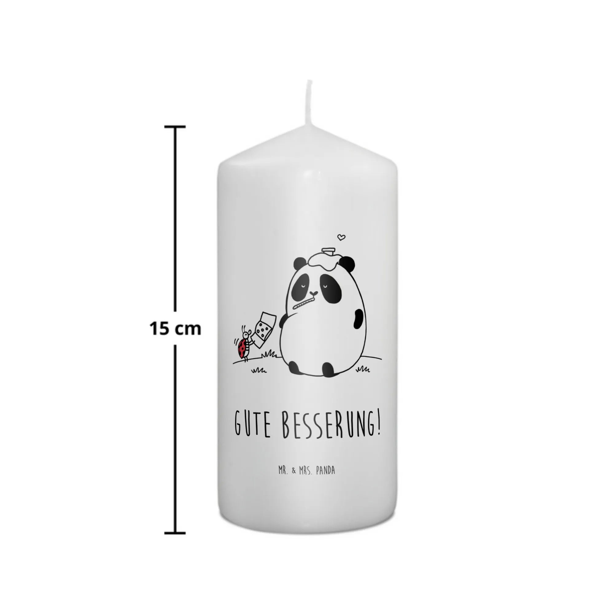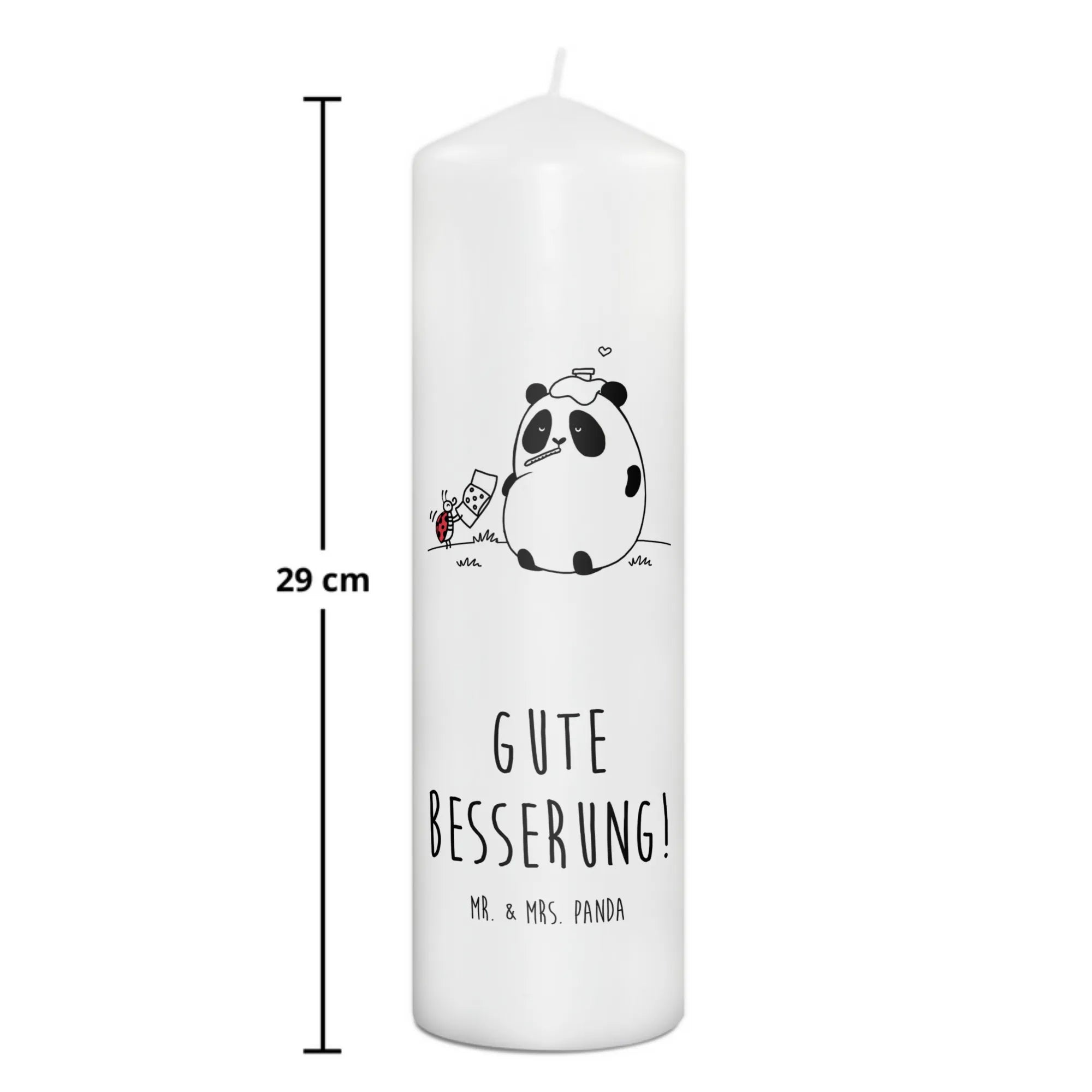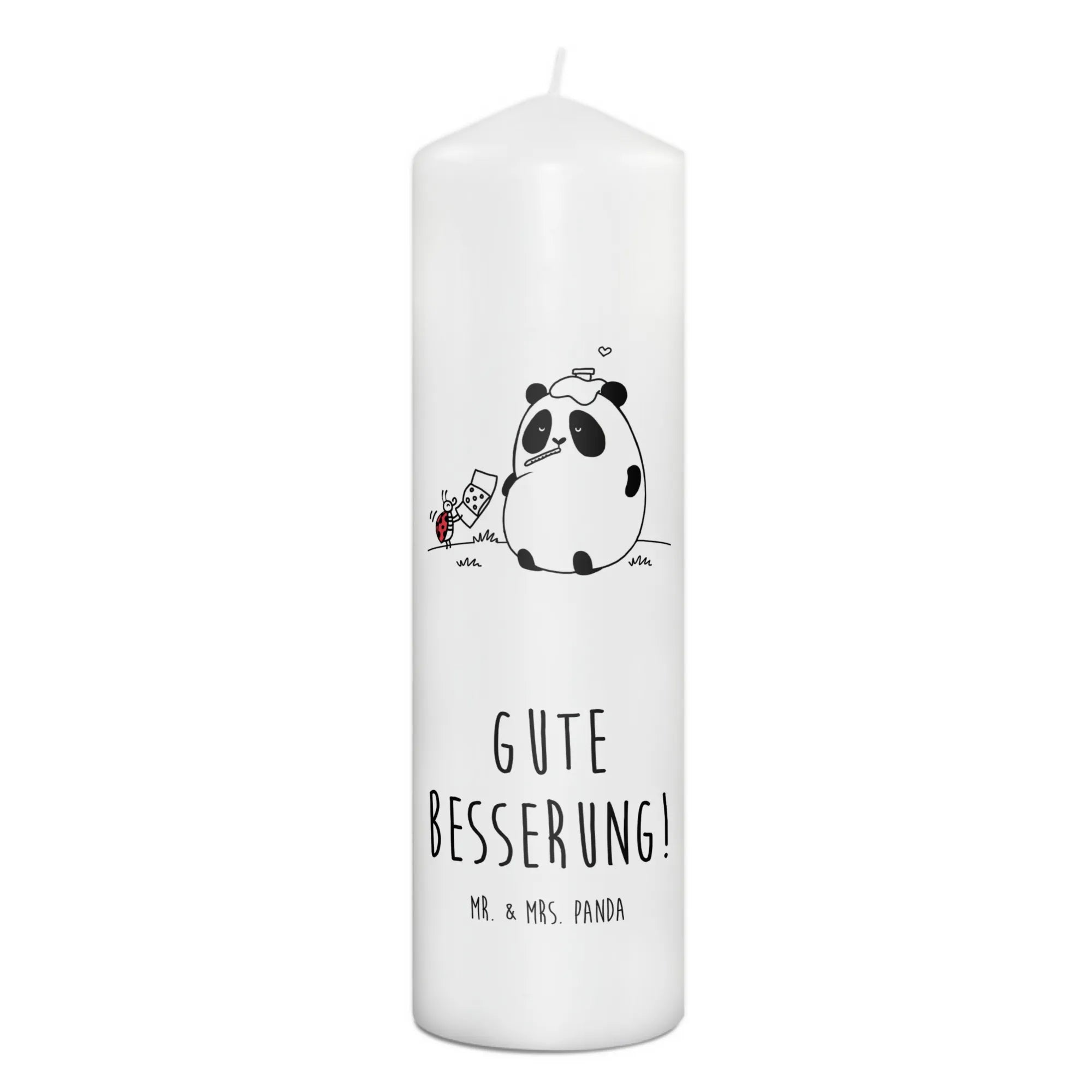 Das liebevolle Motiv zeigt einen kleinen Panda, der erkältet mit einem Thermometer im Mund auf einer Wiese sitzt. Sein treuer Freund, der Marienkäfer, hilft ihm mit einem Pflaster. Dieses niedliche Bild zaubert ein Lächeln auf die Lippen und vermittelt die Botschaft „Gute Besserung!“. Dies macht die Kerze perfekt als Taufkerze, Kommunionskerze oder einfach als Geburtstagskerze.