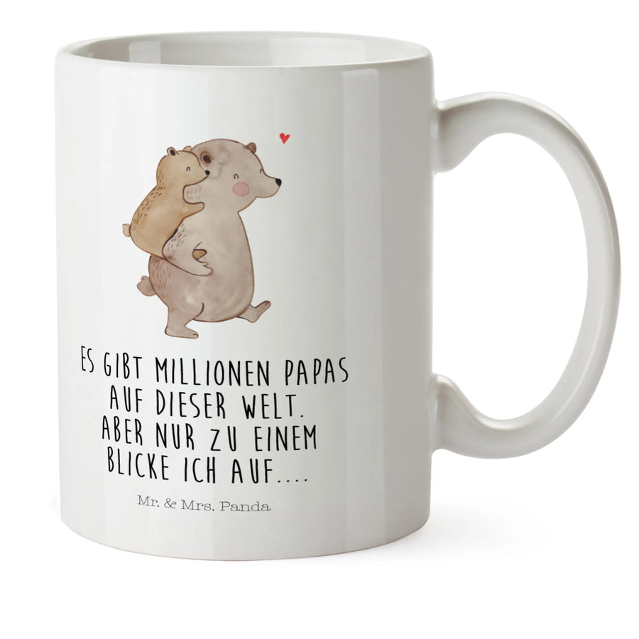 Gekonnt kombiniert sie liebevolle Motive mit einem herzlichen Spruch: „Es gibt Millionen Papas auf dieser Welt. Aber nur zu einem blicke ich auf....". Die Tasse zeigt einen großen Bären, der einen kleineren Bären auf dem Rücken trägt – eine wunderschöne Darstellung der familiären Bindung und Liebe.