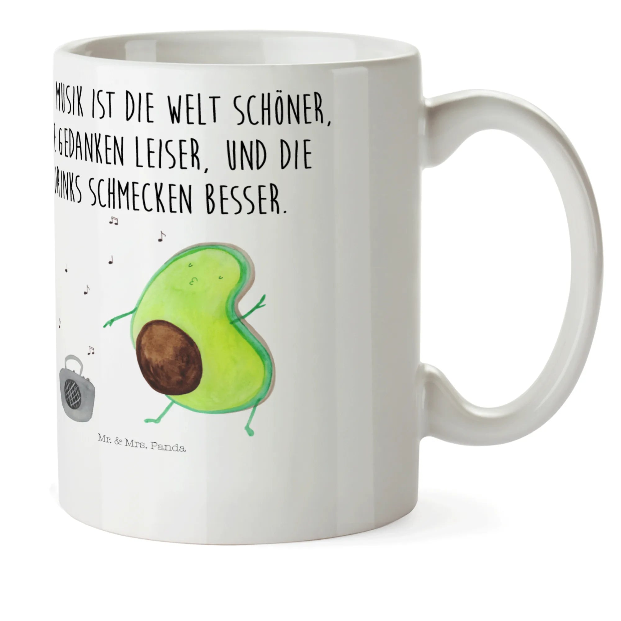 Mit ihrer Größe von 92 mm x 80 mm und einem Durchmesser von 80 mm passt sie perfekt in kleine Kinderhände und hat ein Fassungsvermögen von 300 ml. Das fröhliche Motiv zeigt eine niedliche Avocado, die vor einem Ghettoblaster zur Musik tanzt, und kommt mit dem liebevollen Spruch: "Mit Musik ist die Welt schöner, die Gedanken leiser, und die Drinks schmecken besser."