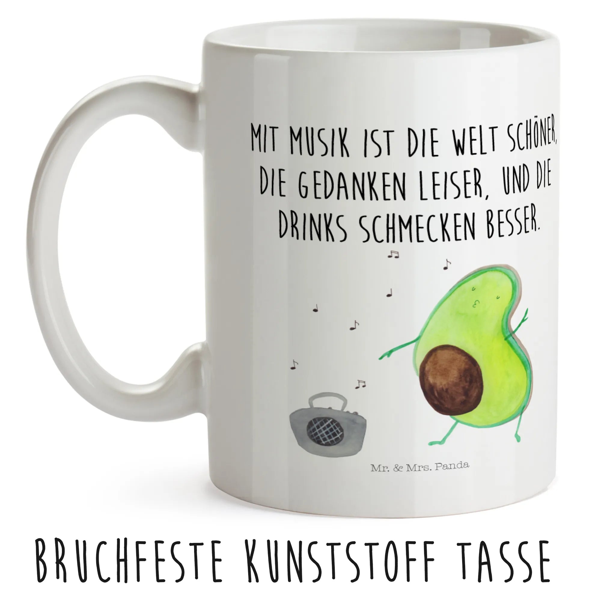 Egal ob im Kindergarten, beim Camping oder beim Picknick, diese Tasse ist der ideale Begleiter. Sie hat eine Füllmenge von 300 ml und ist somit perfekt für Säfte, Wasser oder Milch geeignet. Das wunderschöne Motiv zeigt eine tanzende Avocado vor einem Ghettoblaster und inspiriert die Kleinen, die Welt mit Musik und Freude zu erleben. Der Slogan "Mit Musik ist die Welt schöner, die Gedanken leiser, und die Drinks schmecken besser." unterstreicht, wie wichtig Freude und Genuss im Leben sind.