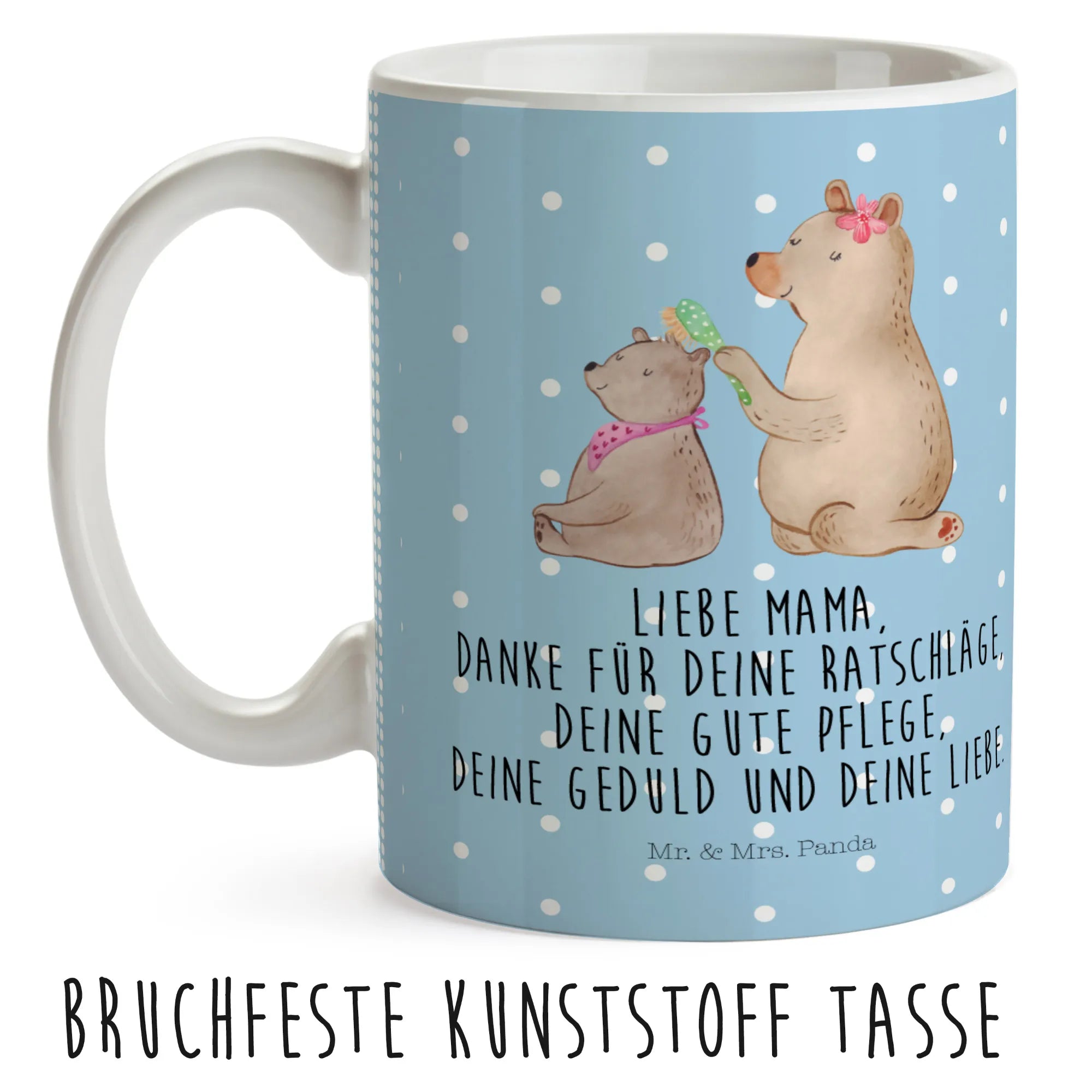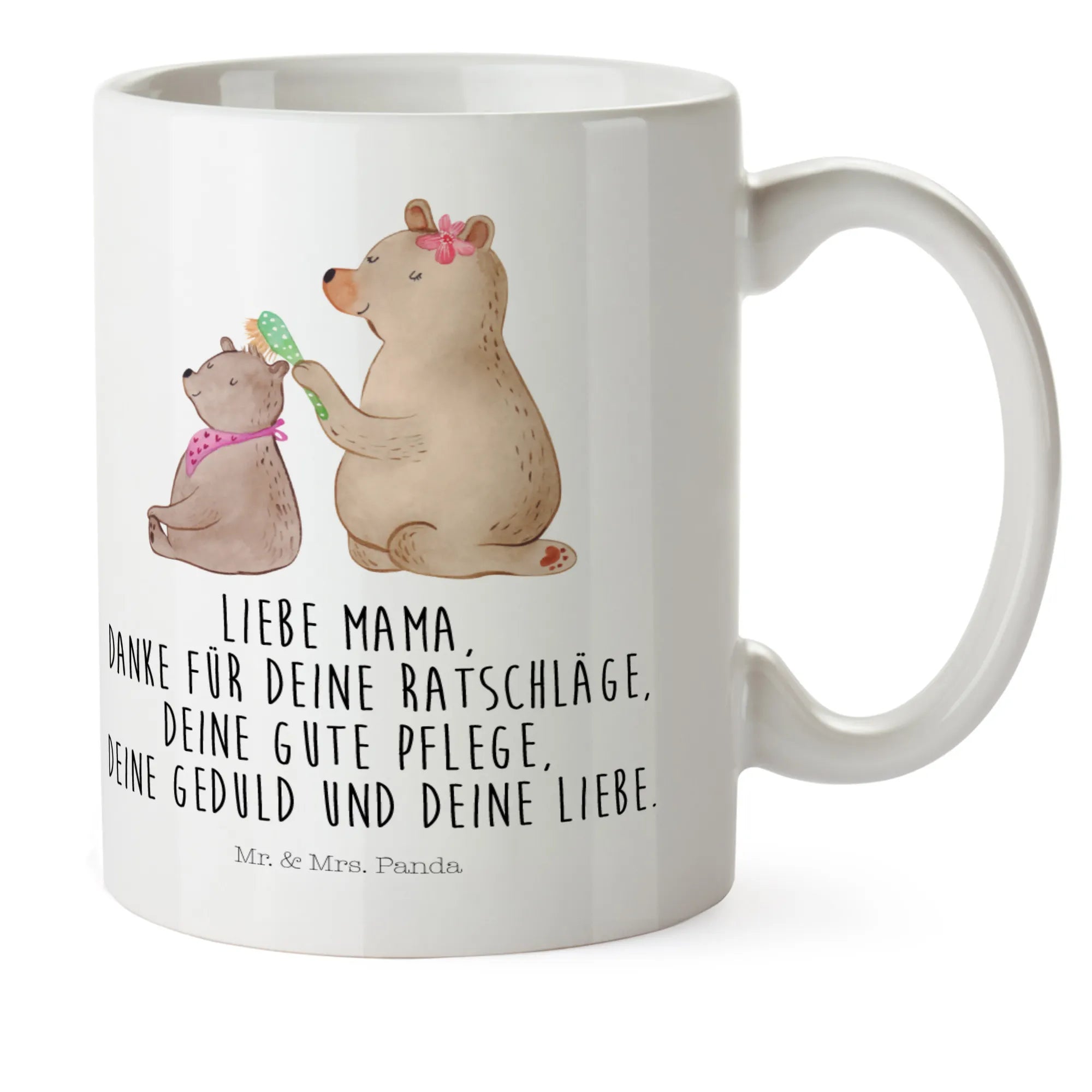 Ein wundervolles Design, das die liebevolle Beziehung zwischen Mutter und Kind wiederspiegelt. Zudem ist die Tasse bruchfest, was sie besonders kindgerecht macht. Bei Mr. & Mrs. Panda glauben wir, dass Familie das Wichtigste im Leben ist. Unser Motto "Liebe Mama, danke für deine Ratschläge, deine gute Pflege, deine Geduld und deine Liebe" macht diese Tasse zu einem hervorragenden Geschenk für den Muttertag, den Geburtstag oder einfach nur, um "Danke" zu sagen.