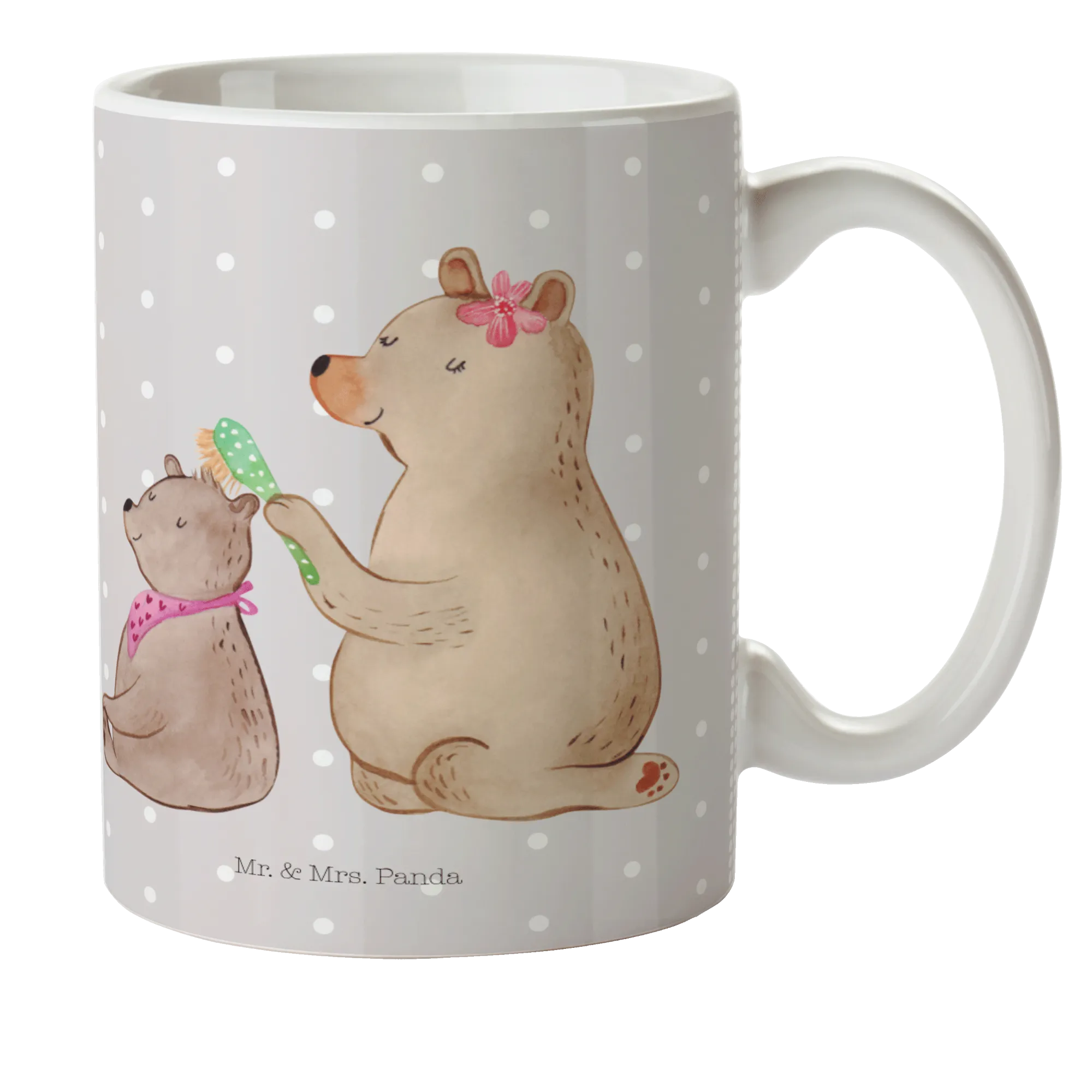 Das bezaubernde Motiv zeigt einen großen Bären, der mit einem sanften Gesichtsausdruck seinem kleinen Bärenkind beim Frisieren hilft. Diese harmonische Darstellung bringt die Familienbande zum Ausdruck und macht die Tasse zu einem wunderbaren Geschenk zum Muttertag oder Geburtstag für die Mama. Wenn du deiner Mutter danken möchtest – diese Tasse ist das perfekte Zeichen deiner Zuneigung!