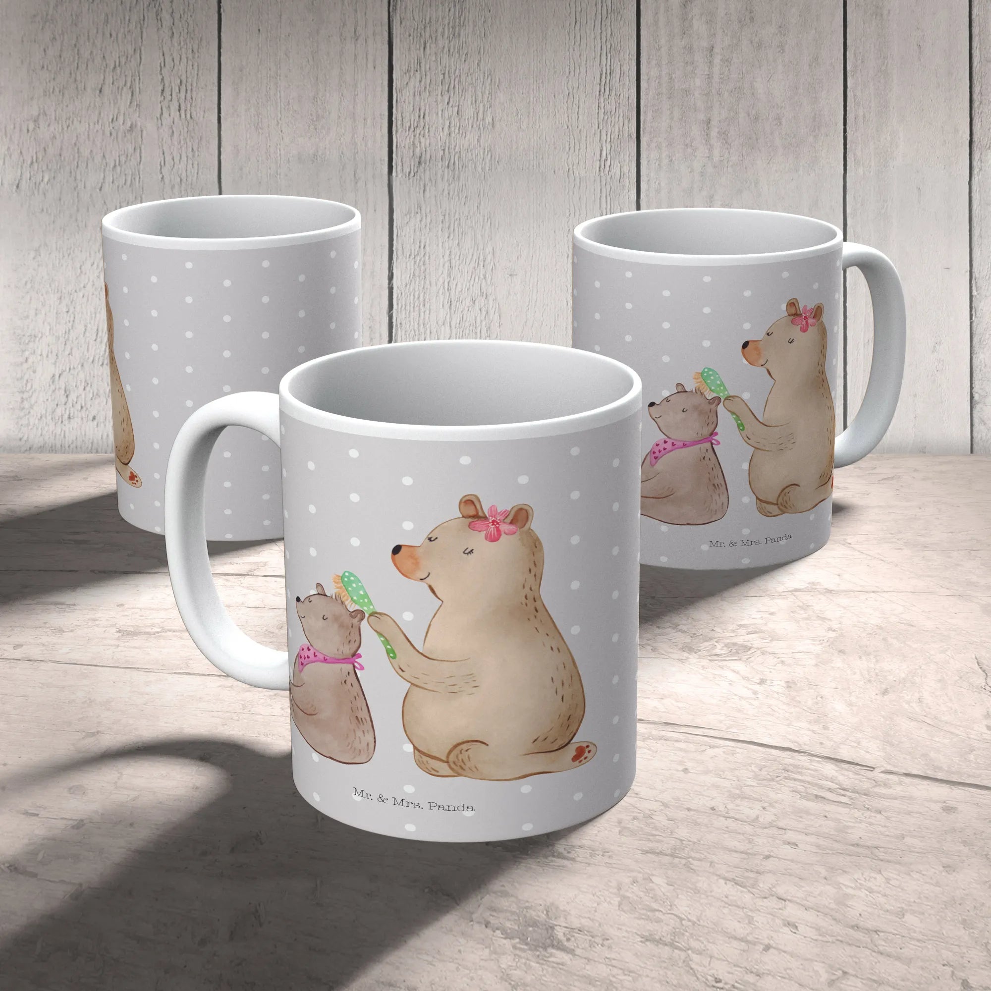 Das zauberhafte Design zeigt einen großen Bären, der in liebevoller Zuneigung das Fell seines kleinen Freundes bürstet. Beide Bären strahlen eine wunderbare Atmosphäre der Geborgenheit und Fürsorge aus – wie die Beziehung zwischen einer Mutter und ihrem Kind. Diese Tasse ist also nicht nur ein Trinkgefäß, sondern ein kleines Kunstwerk, das im Alltag für Freude sorgt.