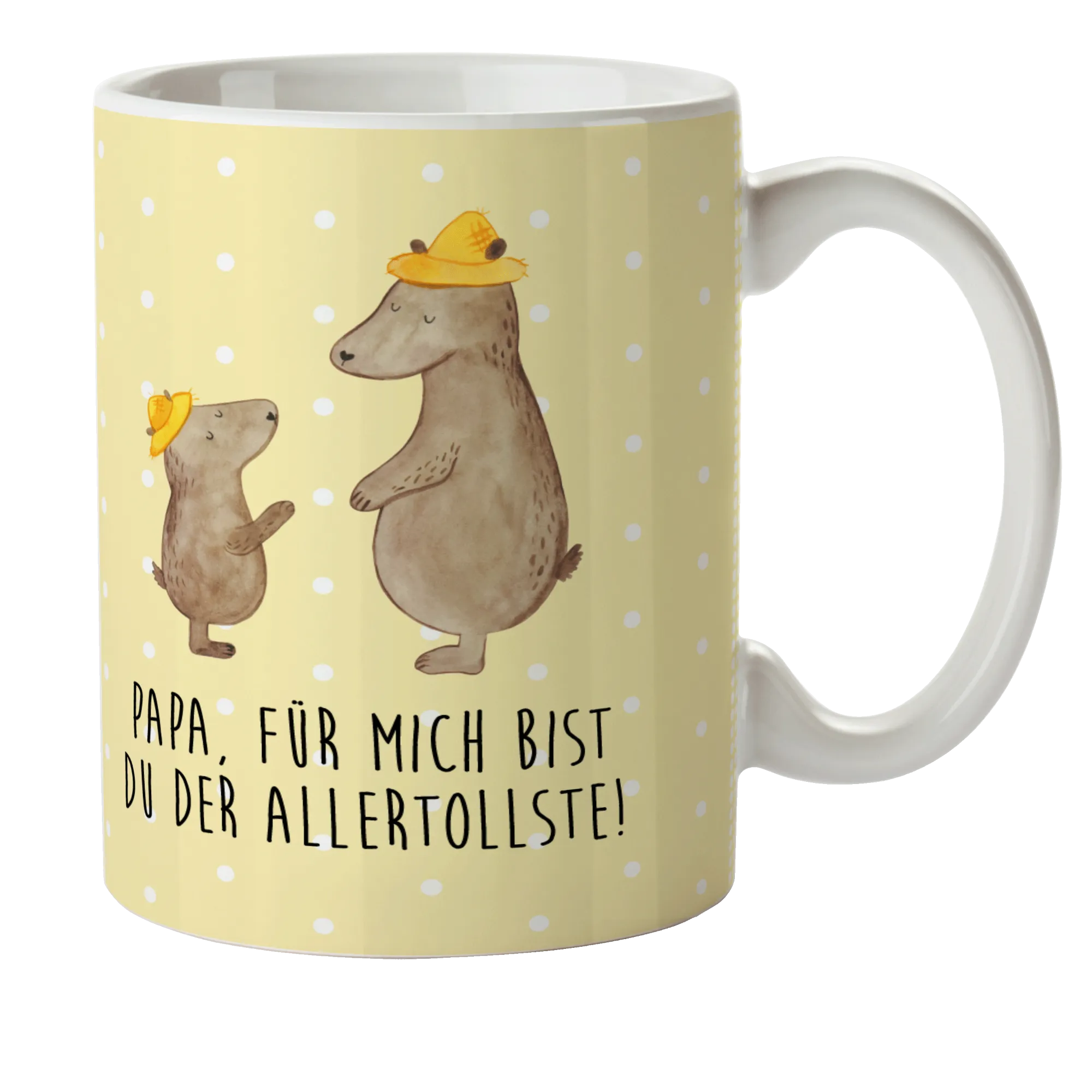 Das süße Motiv zeigt zwei Bären, die sich liebevoll anblicken. Der größere Bär trägt einen gelben Hut und steht aufrecht auf seinen Hinterbeinen, während der kleinere Bär ihm bewundernd zusieht. Diese Darstellung strahlt eine warme, familiäre Beziehung aus und macht die Tasse zu einem perfekten Geschenk für jeden Anlass.
