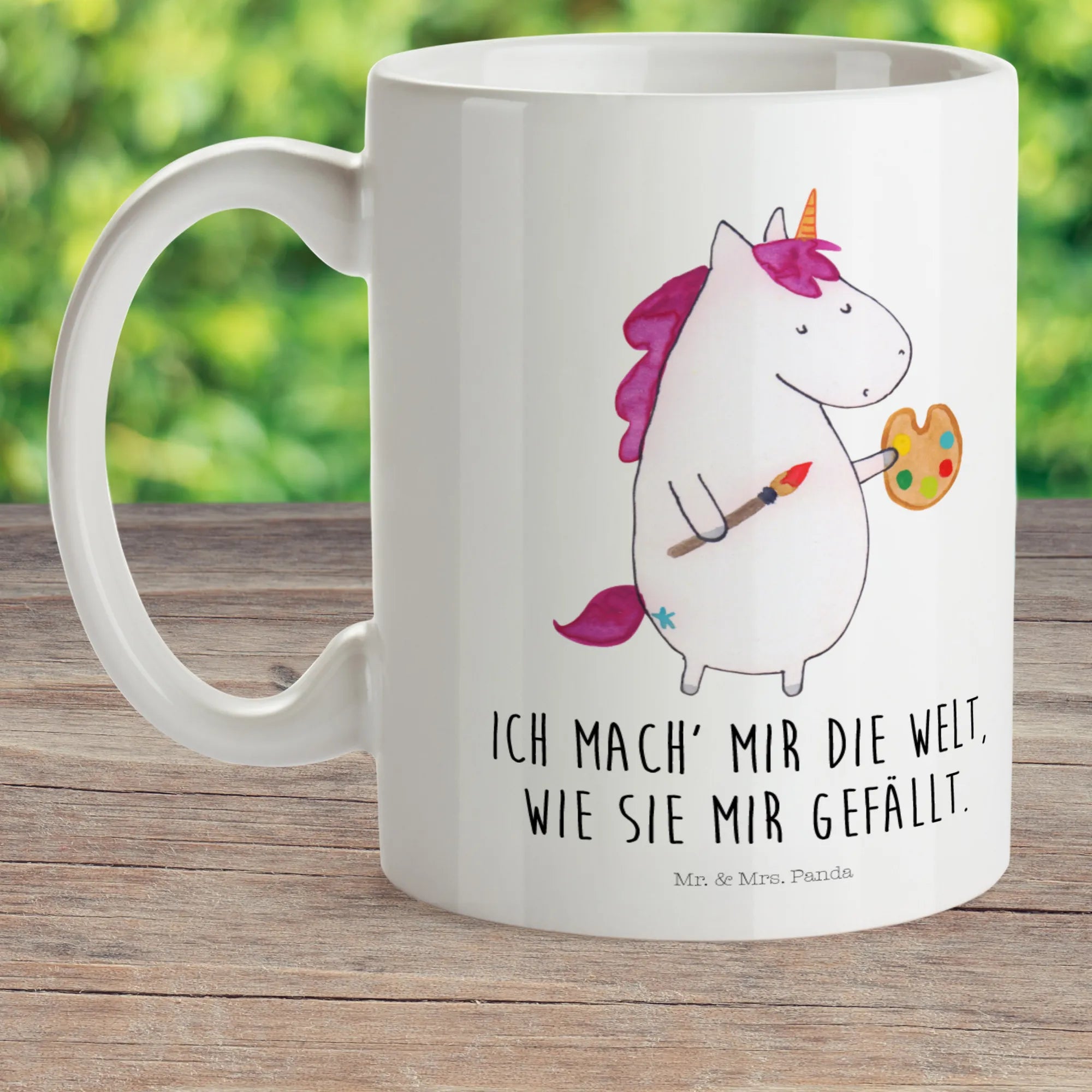 Die Kindertasse Einhorn Künstler von Mr. & Mrs. Panda ist das perfekte Geschenk für kleine kreative Köpfe! Mit einem zauberhaften Einhorn-Motiv, das an einer Staffelei malt, bringt diese farbenfrohe und robuste Kindertasse Freude in jeden Kindergartenalltag.