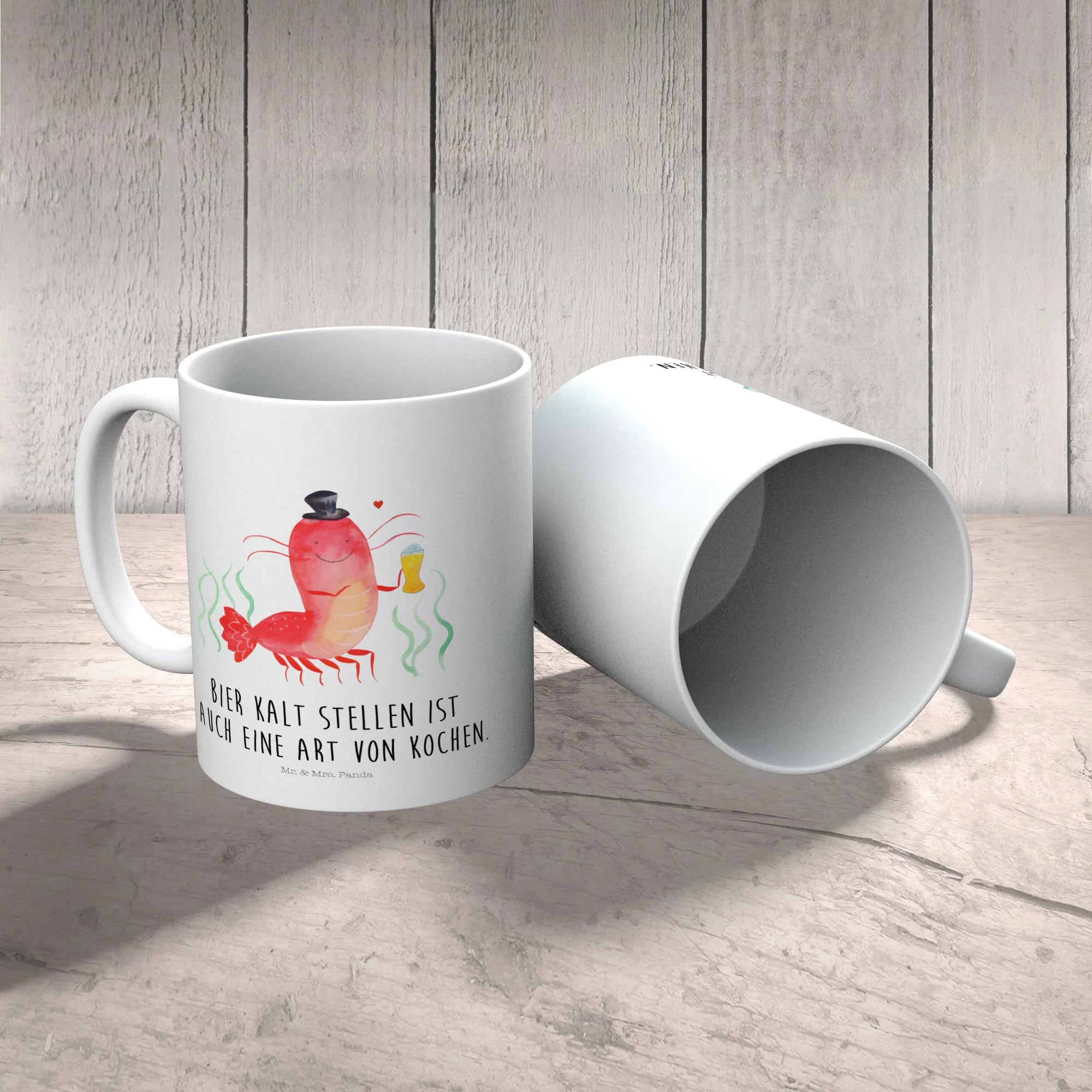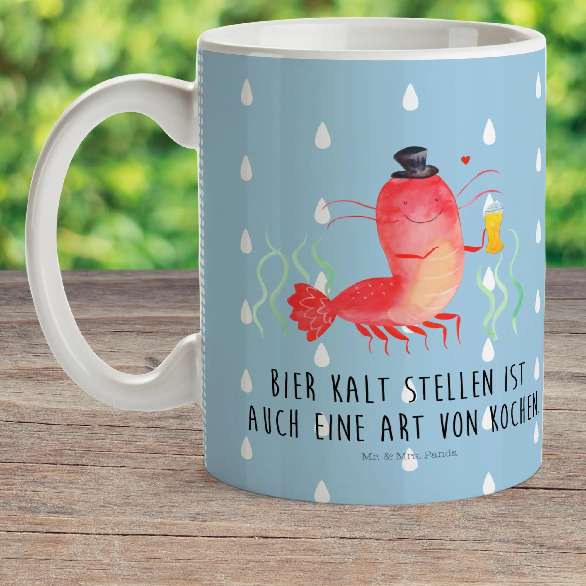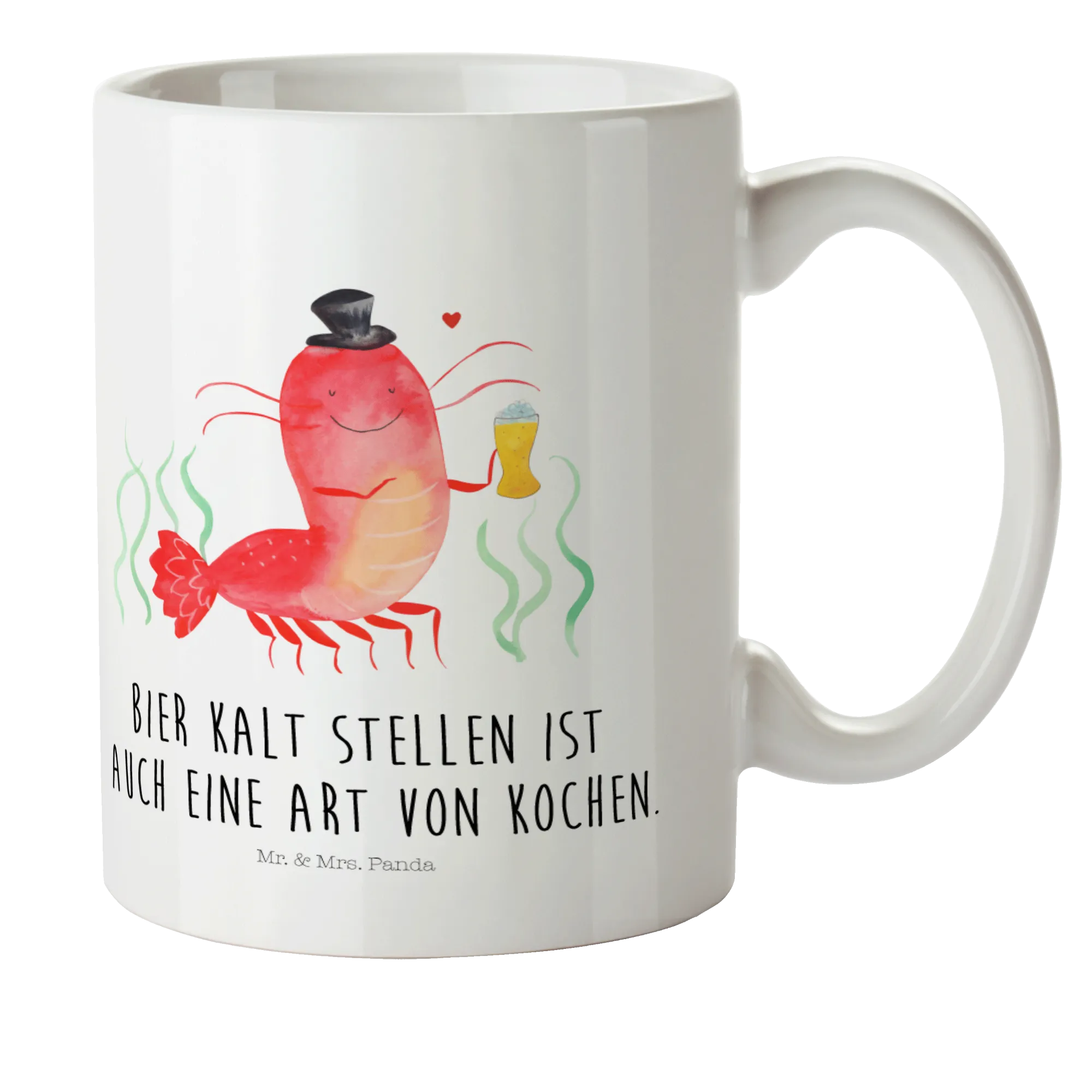 Der Hummer auf der Tasse trägt stolz eine goldene Krone und hält ein Glas mit einem schäumenden, gelben Getränk in seiner Schere. Umgeben von wogendem grünen Seegras und einem kleinen rotem Herz strahlt er Lebensfreude und Fröhlichkeit aus. Unter dem Motiv prangt der liebevolle Spruch "Bier kalt stellen ist auch eine Art von Kochen", der sicher für einige Schmunzler sorgt. Es ist die perfekte Geschenkidee für Kindergeburtstage, als Mitbringsel zur nächsten Einladung oder einfach als kleine Freude für den eigenen Nachwuchs.
