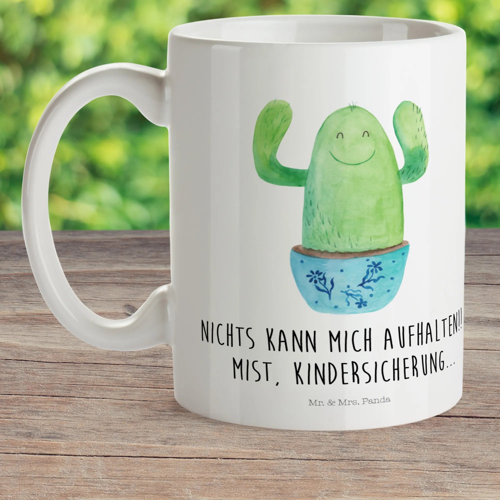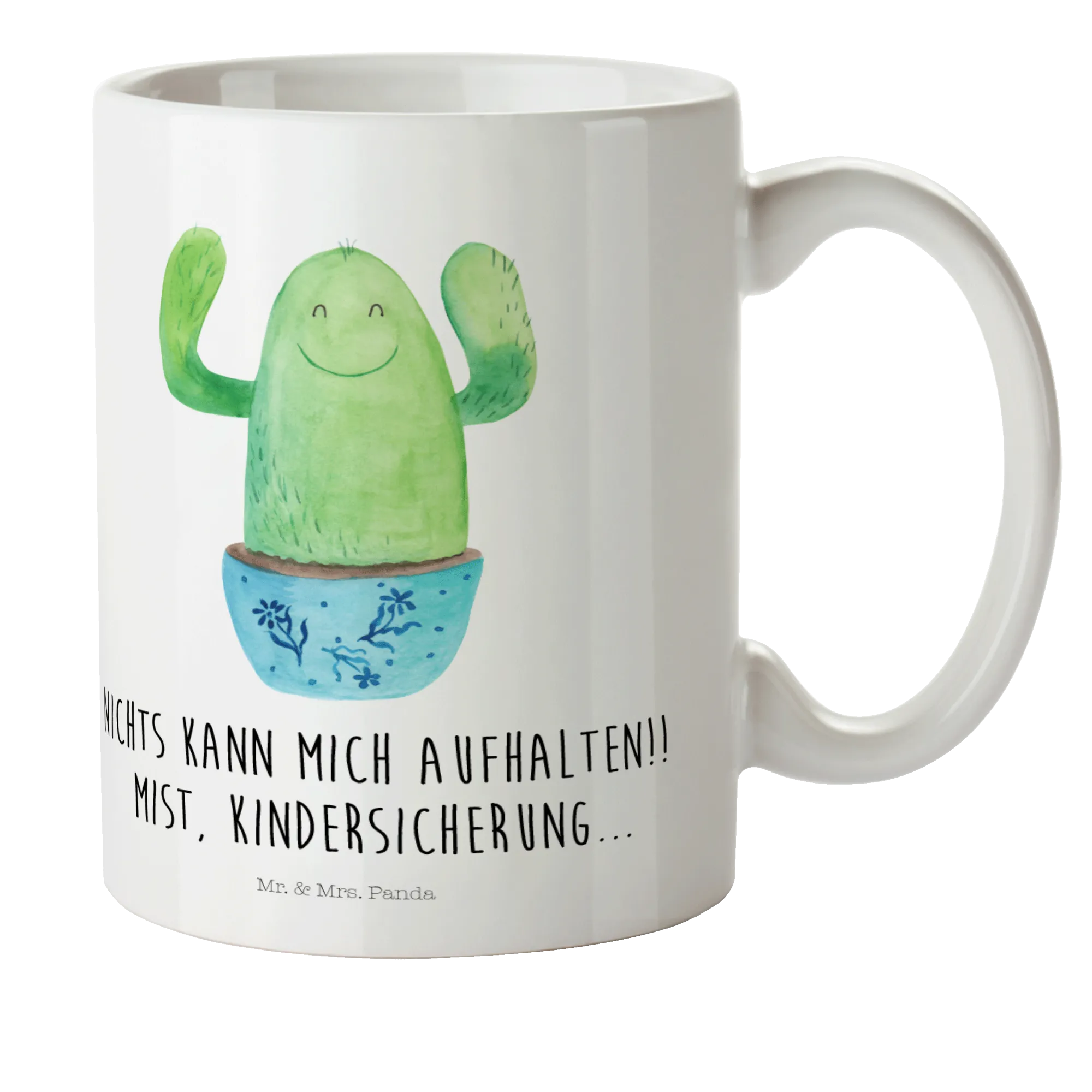 Die Kaktus Happy Kindertasse von Mr. & Mrs. Panda ist das perfekte Geschenk für lebhafte Kinder und fröhliche Erwachsene! Egal ob als Kindertasse für den Kindergarten, als Trinkbecher für die nächste Campingreise oder als schlichte Kaffeetasse für das Büro – dieser bunte Kunststoffbecher bringt jedem ein Lächeln ins Gesicht. Mit seinem fröhlichen Kaktus-Motiv und dem motivierenden Spruch "Nichts kann mich aufhalten!! Mist, Kindersicherung..." sorgt die Tasse für gute Laune, wo immer sie auch eingesetzt wird.