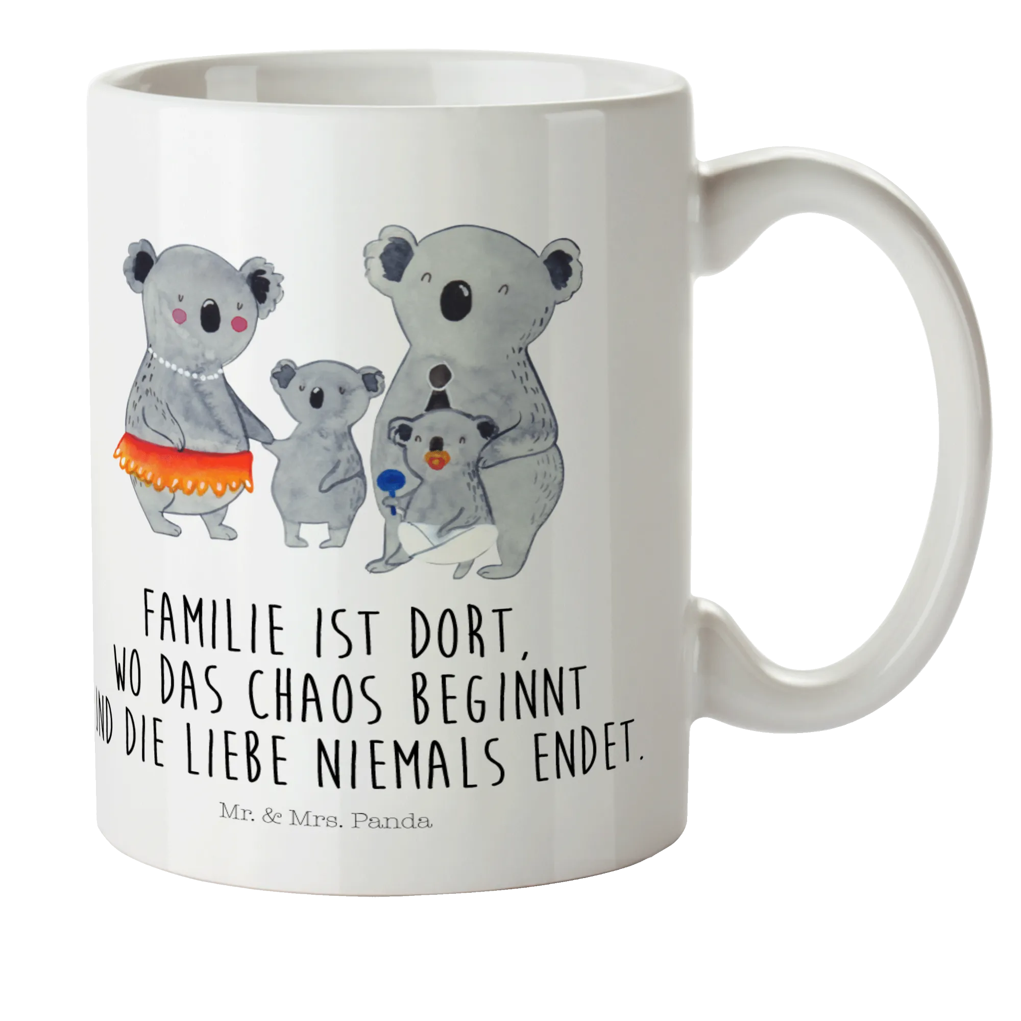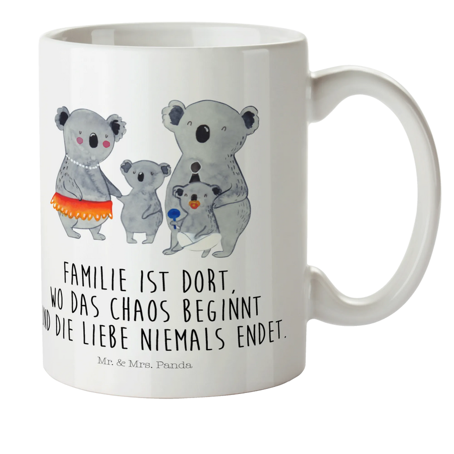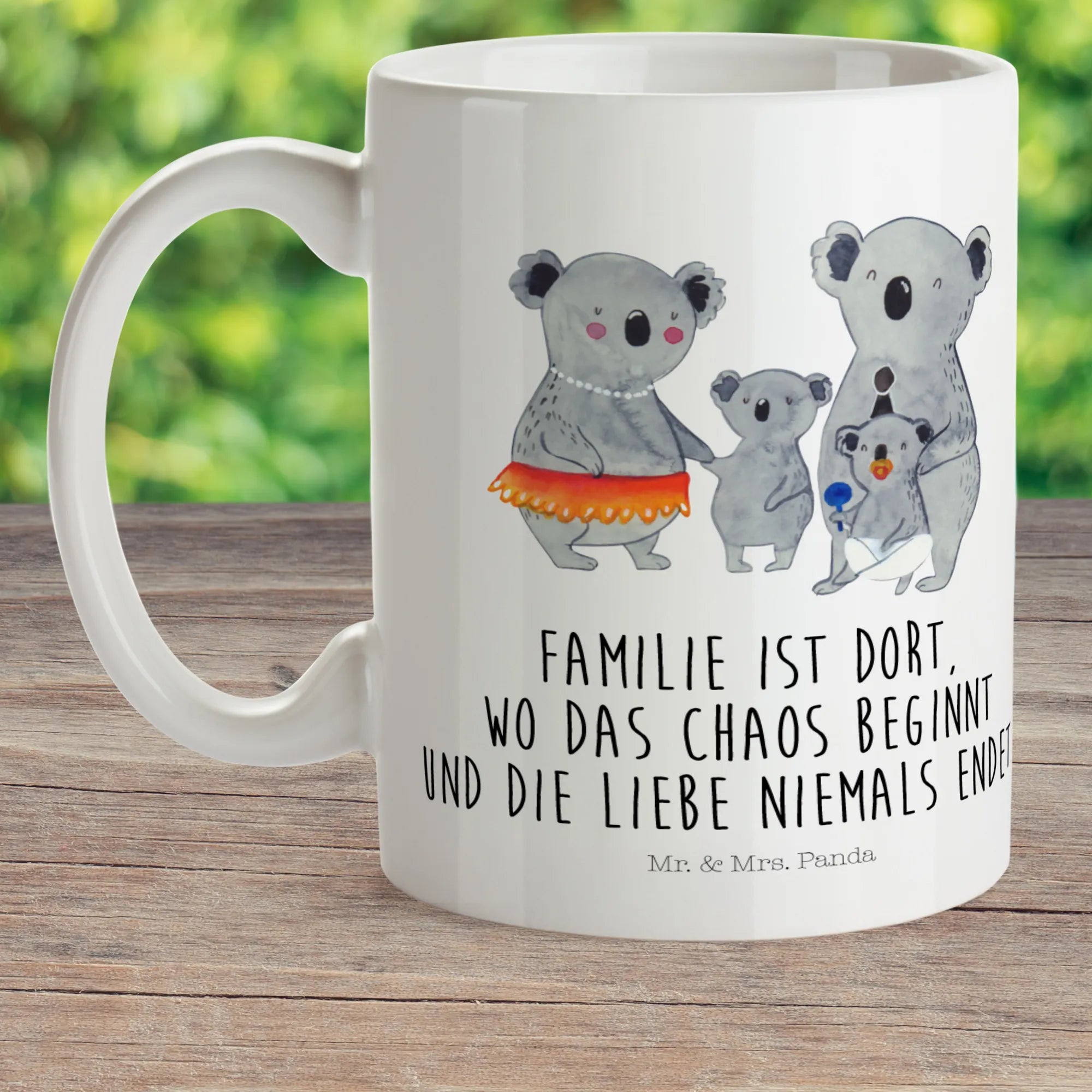 Das Design zeigt zwei große und zwei kleine Koalas, die menschliche Züge haben, eine herzliche Ausstrahlung haben und perfekt das Gefühl von familiärer Verbundenheit widerspiegeln. Die Tasse trägt den einladenden Slogan: "Familie ist dort, wo das Chaos beginnt und die Liebe niemals endet", was sie zu einem besonderen Geschenk für viele Anlässe macht. Ob für den Vatertag, den Muttertag oder einfach nur so als liebevolles Geschenk an Geschwister, die Oma oder den Opa - diese Tasse wird sicher ein Hit.