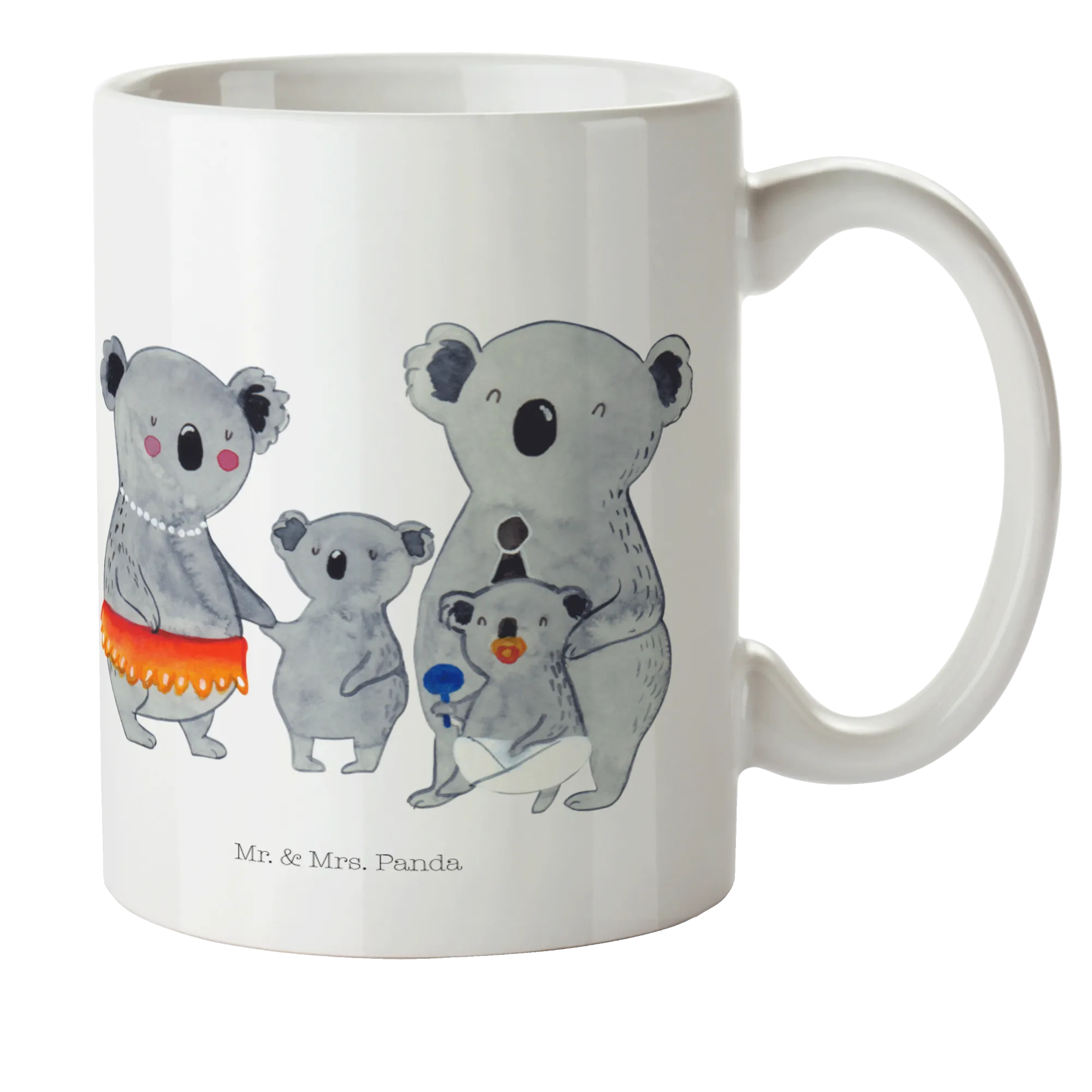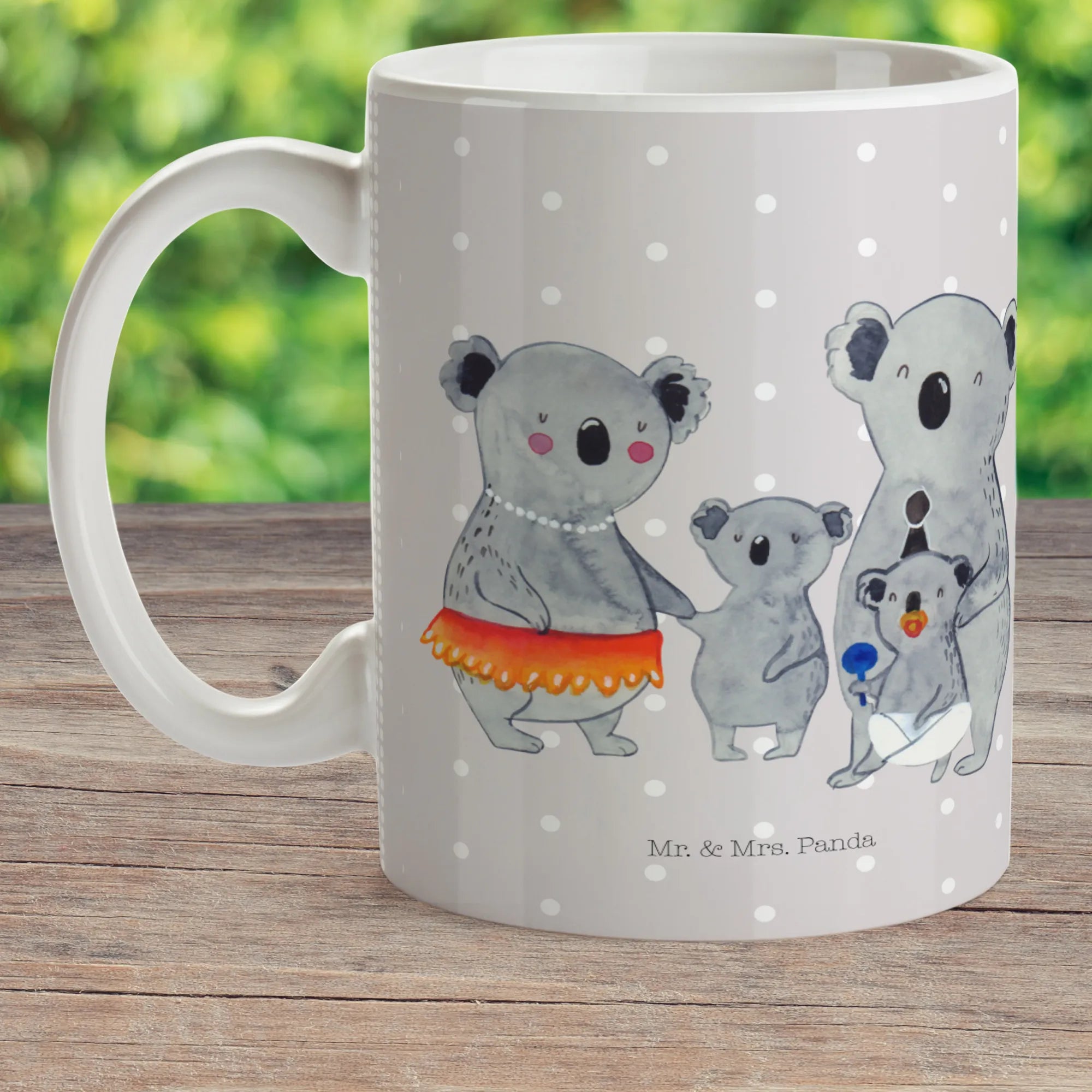Was diese Tasse so besonders macht, ist das bezaubernde Design. Auf der Tasse ist eine fröhliche Koala-Familie abgebildet, die ganz viel Liebe und Freude ausstrahlt. Die größeren Koalas stehen aufrecht, einer trägt eine Perlenkette und der andere einen Partyhut, während die kleineren Koalas mit einem Lätzchen und einem Spielzeug für liebevolle Kindheitserinnerungen sorgen. Hier wird deutlich: Familie bedeutet nicht nur Chaos, sondern vor allem auch Zuneigung und Unterstützung!