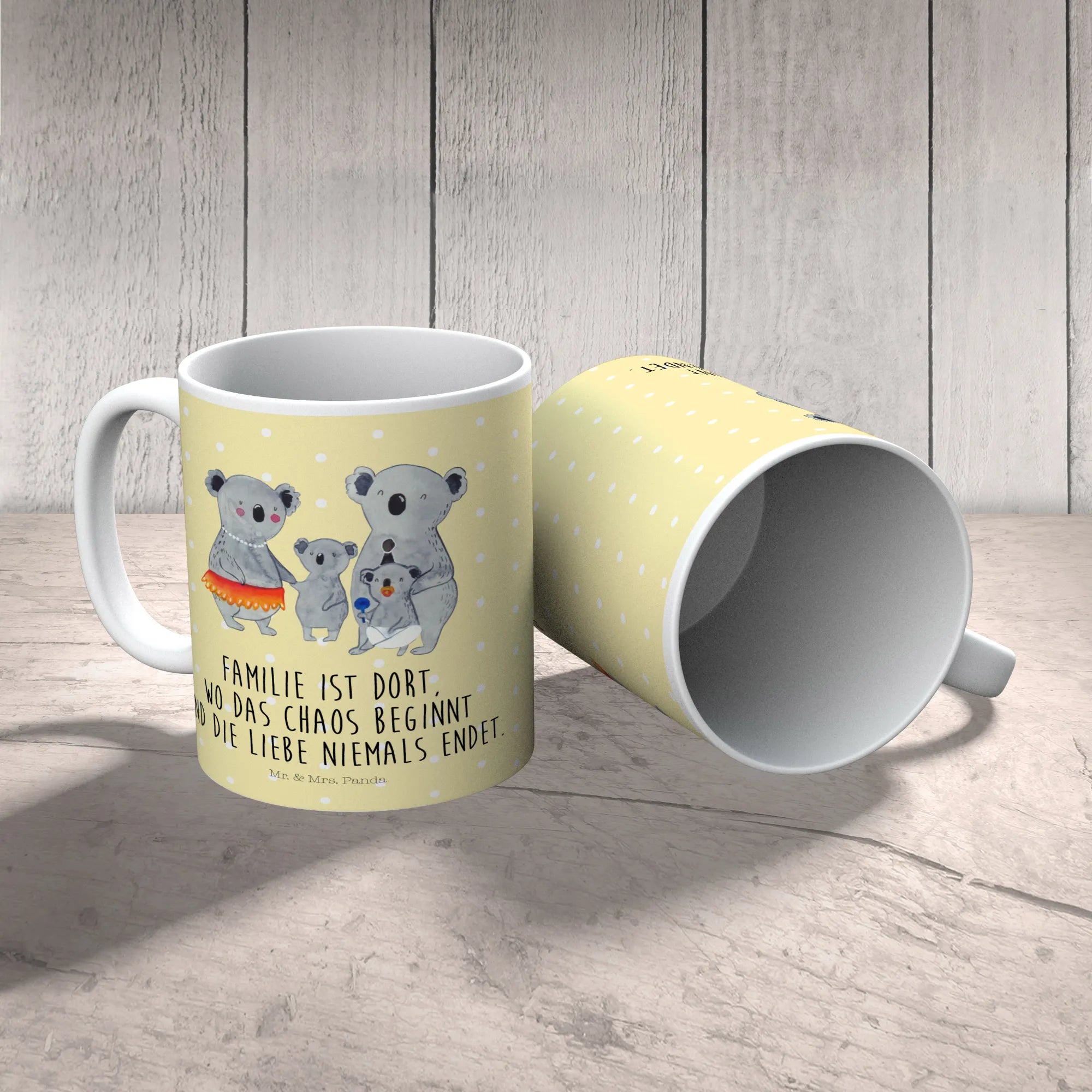 Der brillante Aufdruck zeigt eine liebevolle Koala Familie, die herzlich miteinander verbunden ist. Das Motiv strahlt eine warme, einladende Atmosphäre aus und erinnert uns daran, dass Familie dort beginnt, wo das Chaos beginnt und die Liebe niemals endet. Ob für das erste Geschirrstück oder als Geschenk zum Vatertag oder Muttertag, diese kindgerechte Tasse ist sowohl funktional als auch ästhetisch ansprechend.