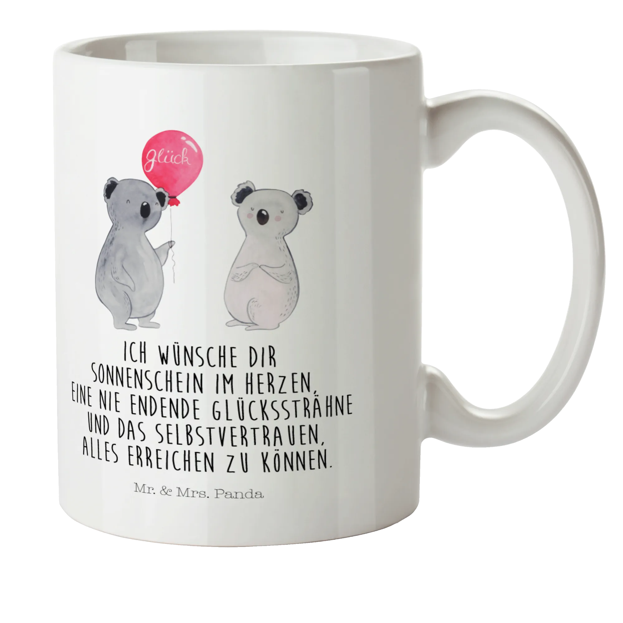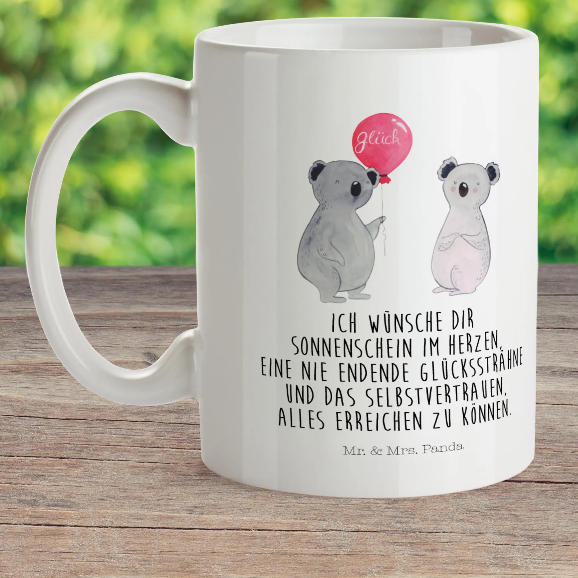 Die zwei niedlichen Koalas, die fröhlich einen Luftballon halten, verkörpern Freude, Spaß und die Unbeschwertheit der Kindheit. Zudem ziert die Tasse der inspirierende Spruch: 'Ich wünsche dir Sonnenschein im Herzen, eine nie endende Glückssträhne und das Selbstvertrauen, alles erreichen zu können.' Diese Botschaft ist nicht nur ein toller Begleiter beim Trinken, sondern auch eine stetige Erinnerung an die Wichtigkeit von Glück und Selbstvertrauen im Leben.