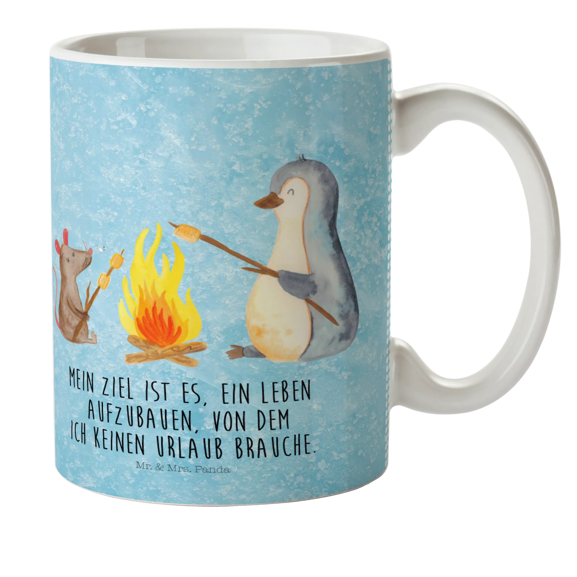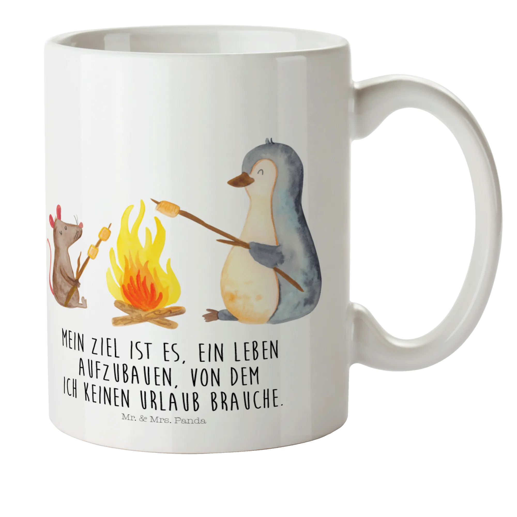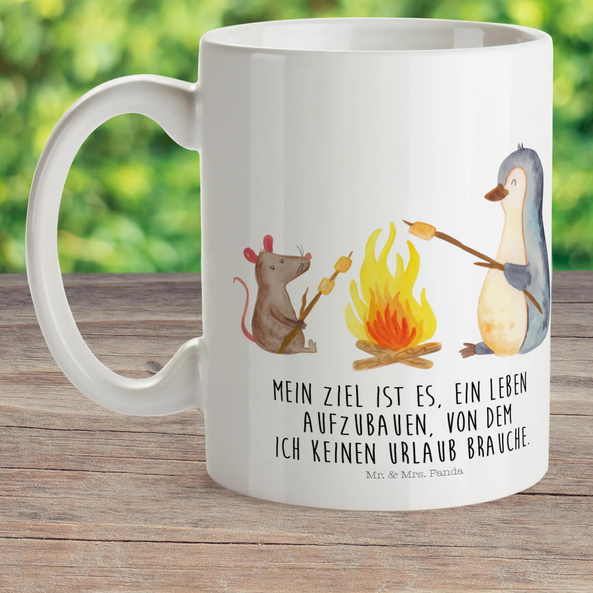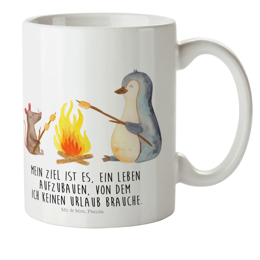 Die Tasse zeigt einen liebevoll gezeichneten Pinguin und eine Maus, die am Lagerfeuer sitzen und köstliche Marshmallows rösten. Diese zauberhaften Illustrationen von Mr. & Mrs. Panda bringen nicht nur Freude, sondern auch eine Portion Lebensmotivation ins Kinderzimmer. Der Slogan „Mein Ziel ist es, ein Leben aufzubauen, von dem ich keinen Urlaub brauche“ ziert diese besondere Tasse und inspiriert Kinder, ihre Träume zu verfolgen und Abenteuer zu erleben.