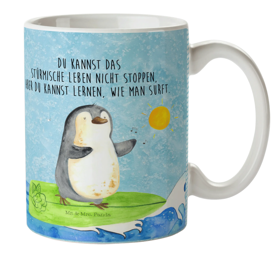 Wenn Du auf der Suche nach einem perfekten Geschenk für kleine Abenteurer bist, dann ist die Kindertasse Pinguin Surfer aus der Pinguin - Kollektion von Mr. & Mrs. Panda genau das Richtige!