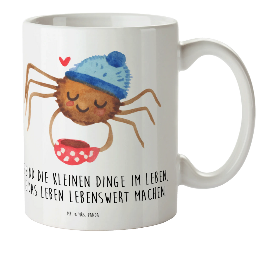 Die Tasse hat ein niedliches Motiv der kleinen Spinne Agathe, die mit einer wolligen Mütze und einem Herzchen neben sich genussvoll einen Kaffee trinkt. Dieser Anblick zaubert nicht nur Kindern ein Lächeln ins Gesicht, sondern erinnert auch Erwachsene daran, dass es die kleinen Dinge im Leben sind, die den Tag besonders machen.