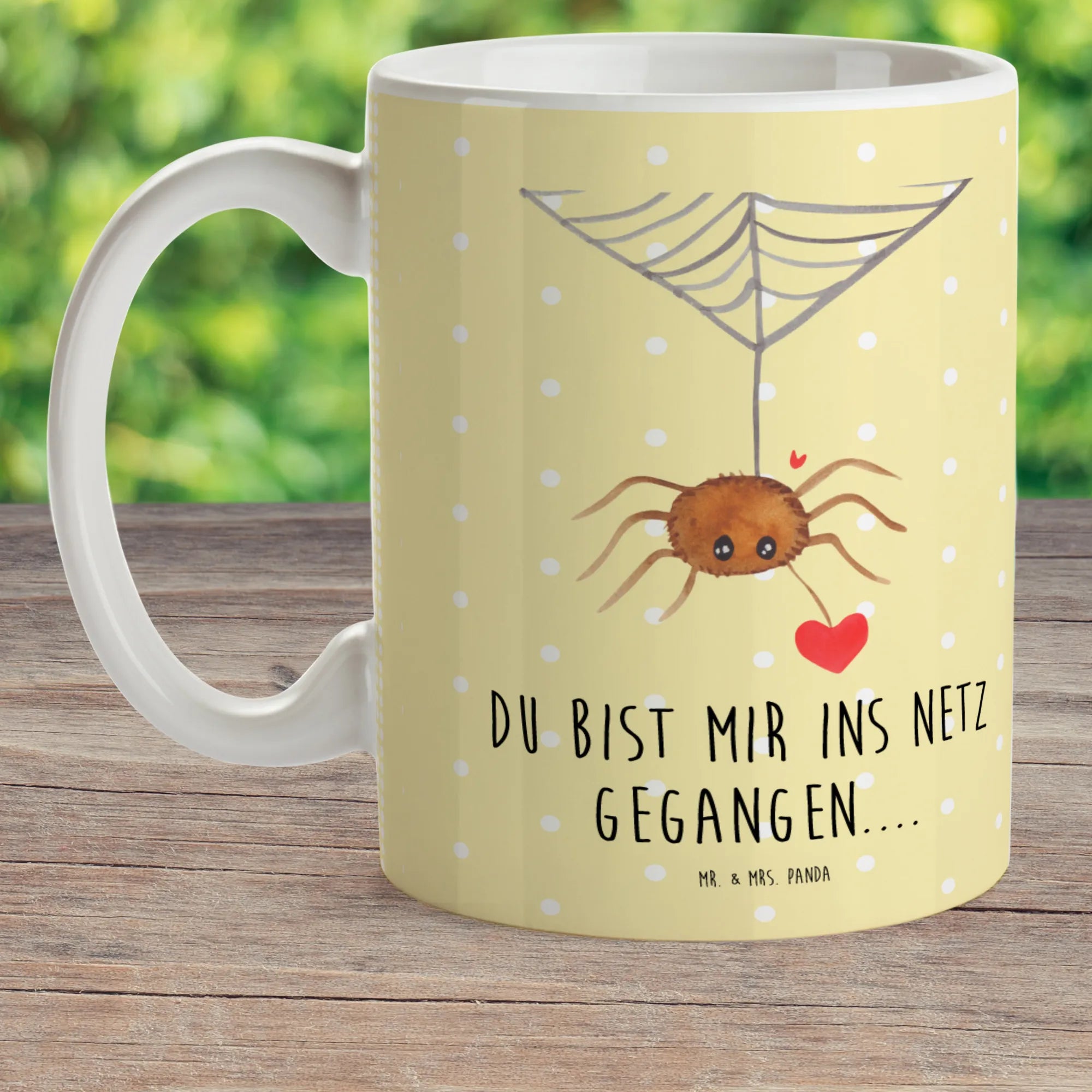 Die Kindertasse "Spinne Agathe Liebe" von Mr. & Mrs. Panda ist das perfekte Geschenk für kleine Entdecker und große Lieblingsmenschen! Mit einem bunten Design, das die süße Spinne Agathe und ihren herzlichen Spruch "Du bist mir ins Netz gegangen..." zeigt, bringt diese farbenfrohe und robuste Kunststofftasse ein Lächeln in das Gesicht jedes Kindes.