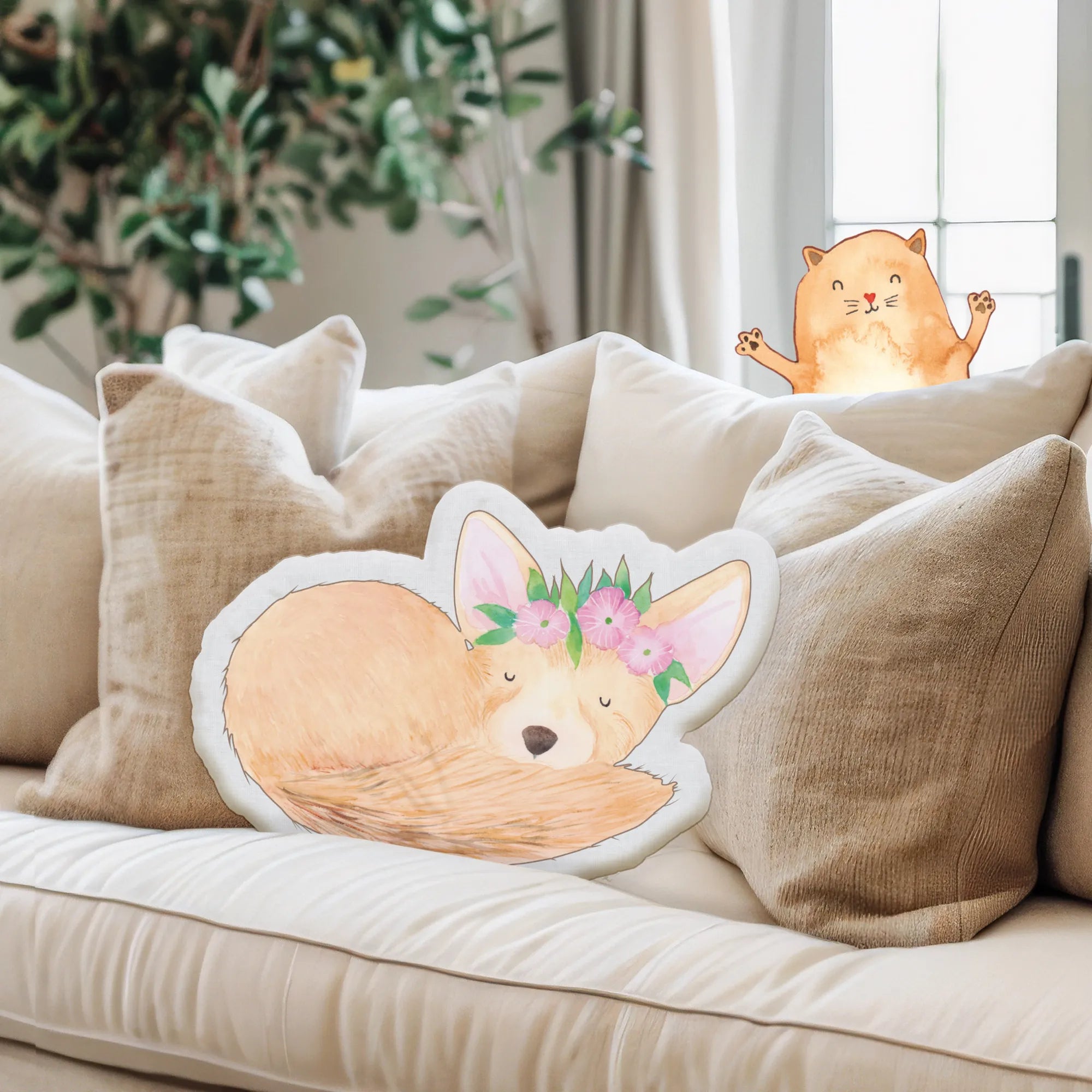 Der schlafende Wüstenfuchs mit seinem zarten Blumenkranz ist liebevoll als Aquarellmotiv gestaltet und strahlt Ruhe und Wärme aus. Durch den hellen, weißen Hintergrund kommt das Motiv besonders schön zur Geltung und passt wunderbar ins Kinderzimmer, Babybett oder auf das Sofa. Dieses Plüschkissen vereint süßes Design und hohe Funktionalität: es begleitet beim Einschlafen, tröstet bei kleinen Wehwehchen und ist ein treuer Spielgefährte auf Reisen.