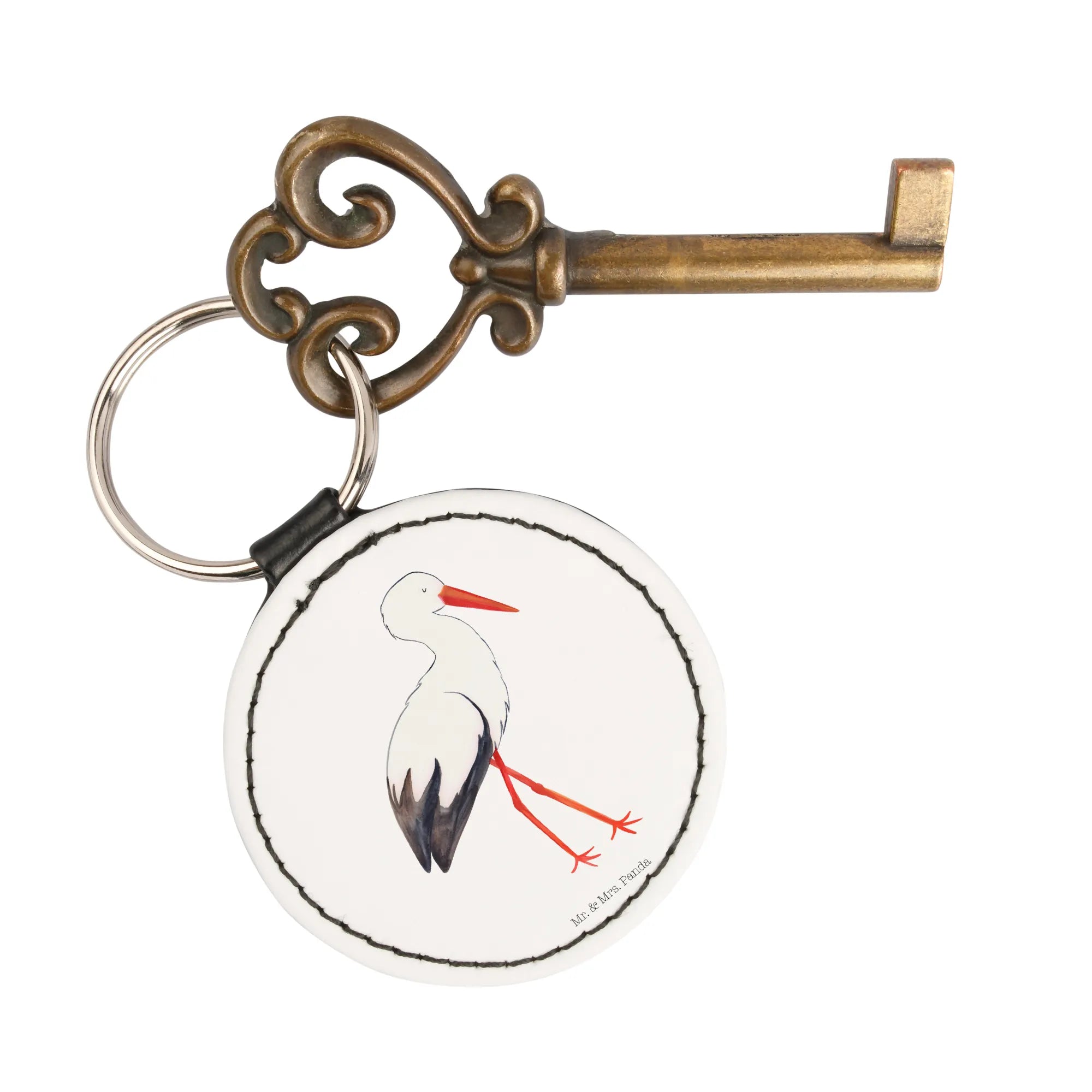 Der wunderschöne Rund Schlüsselanhänger mit dem süßen Storch-Motiv aus der Small World Kollektion von Mr. & Mrs. Panda ist der perfekte Glücksbringer für alle frischgebackenen oder werdenden Mamas! Mit einem Durchmesser von 50 mm und aus hochwertigem, premium Kunstleder gefertigt, ist dieser Schlüsselanhänger nicht nur ein toller Blickfang, sondern auch besonders langlebig und weich.