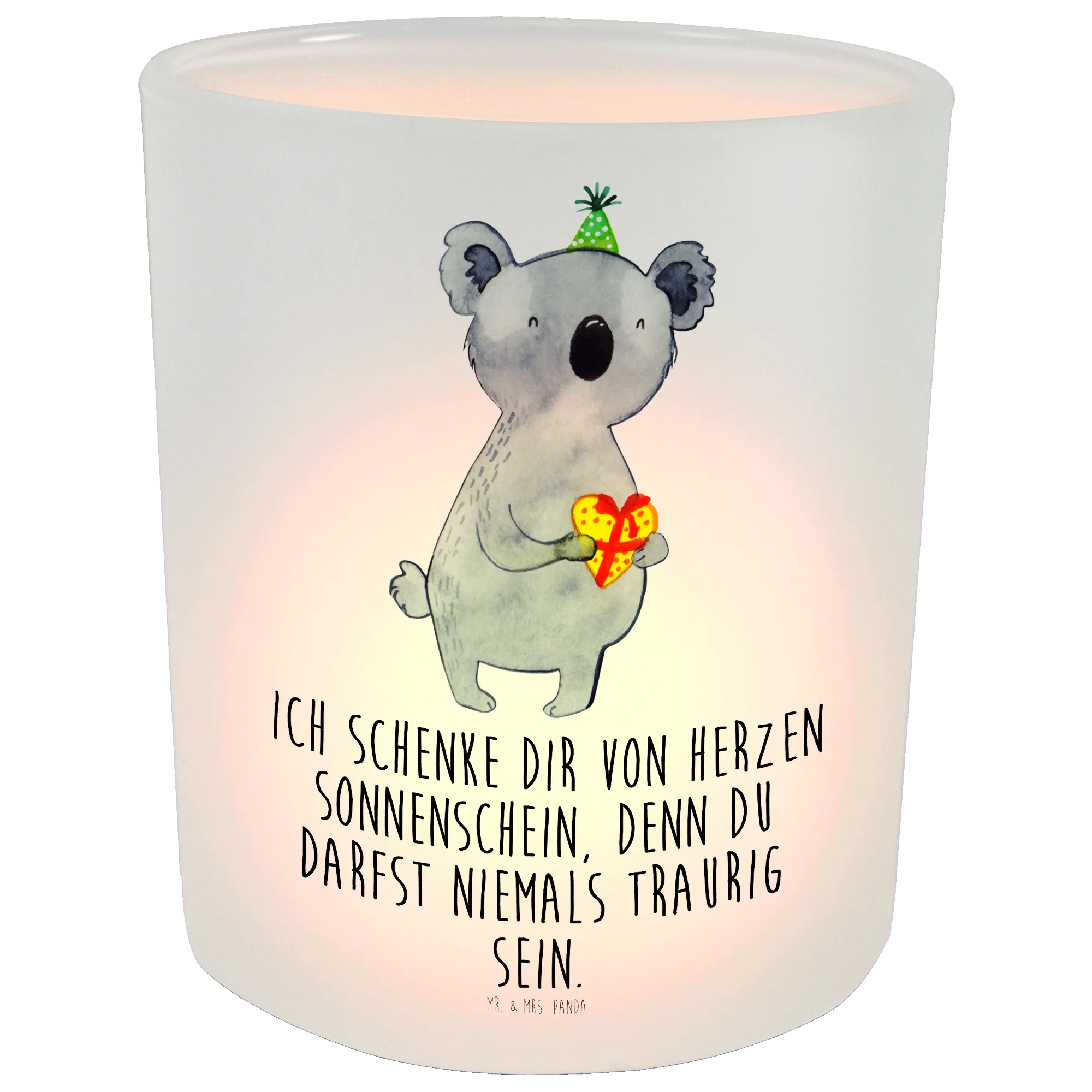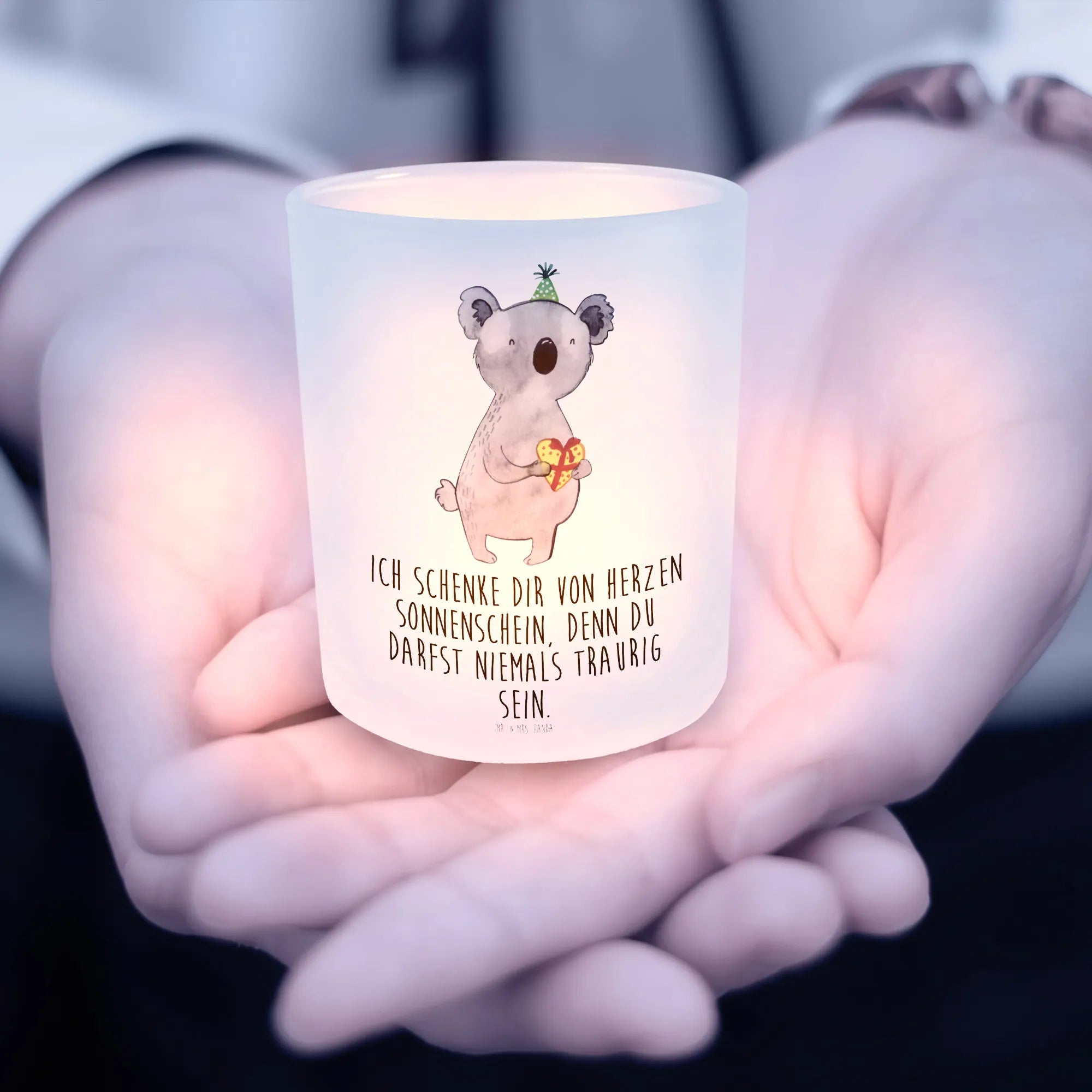 Ein wunderschönes Windlicht von Mr. & Mrs. Panda: Das Windlicht "Koala Geschenk" vereint liebevolle Illustration und praktische Funktion. Ein niedlicher Koala mit Partyhut hält ein herzförmiges Geschenk, begleitet vom herzlichen Spruch: „Ich schenke dir von Herzen Sonnenschein, denn du darfst niemals traurig sein.“ – eine Botschaft, die direkt ins Herz trifft. 💖