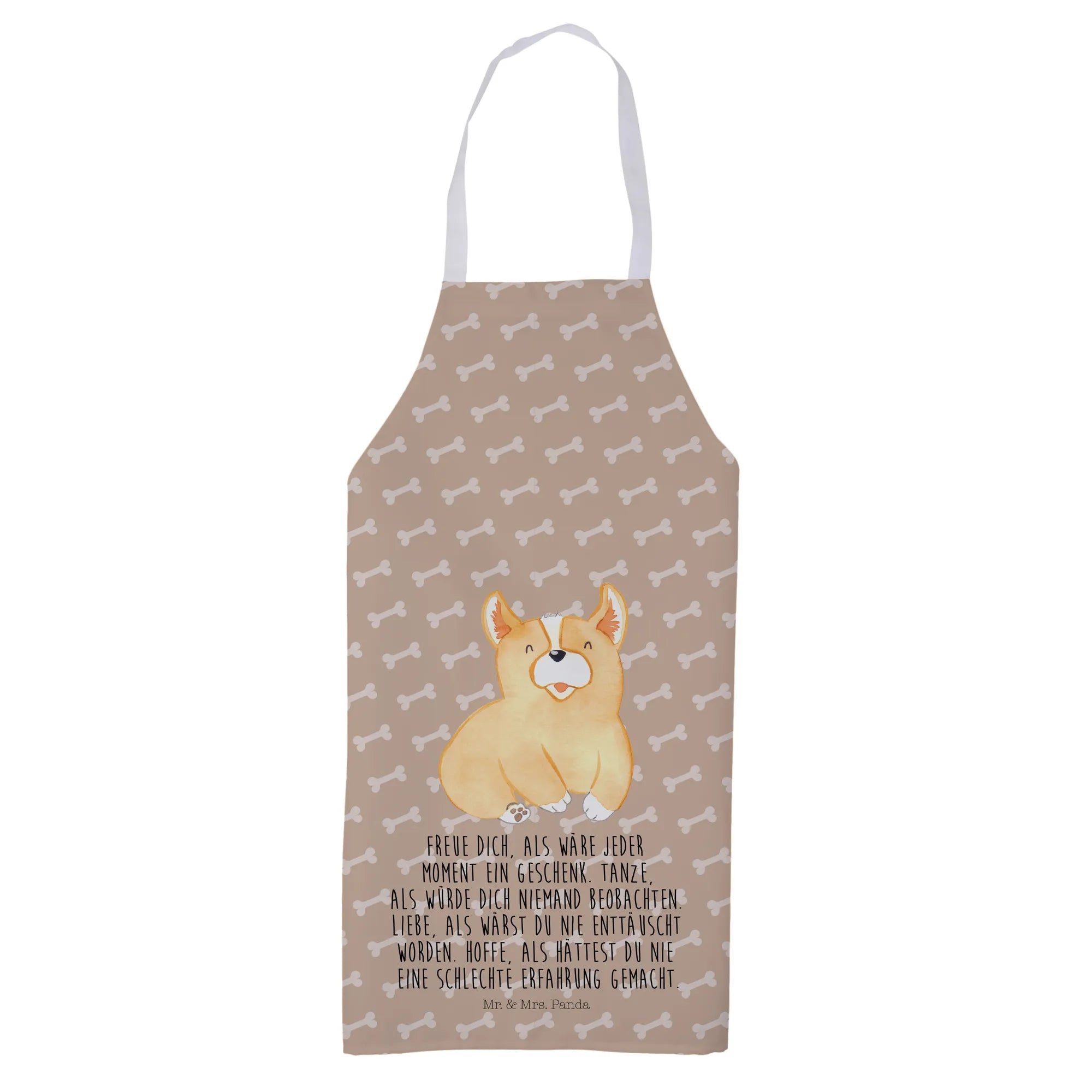 Entdecke die liebevoll gestaltete Kochschürze von Mr. & Mrs. Panda, die nicht nur praktisch ist, sondern auch das Herz eines jeden Hundeliebhabers höher schlagen lässt! Diese wunderbare Kochschürze in strahlendem Weiß ziert ein süßer Corgi und wird mit dem inspirierenden Spruch 'Freue dich, als wäre jeder Moment ein Geschenk. Tanze, als würde dich niemand beobachten. Liebe, als wärst du nie enttäuscht worden. Hoffe, als hättest du nie eine schlechte Erfahrung gemacht.' versehen.