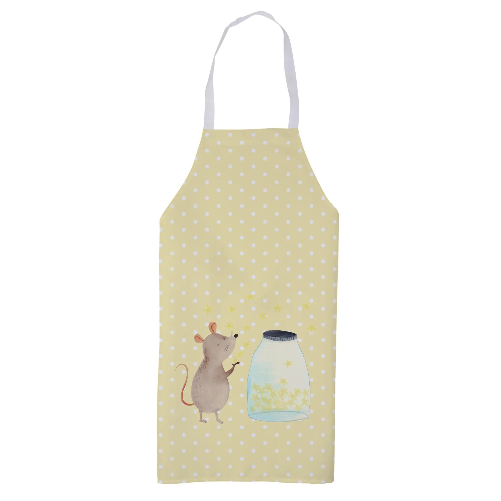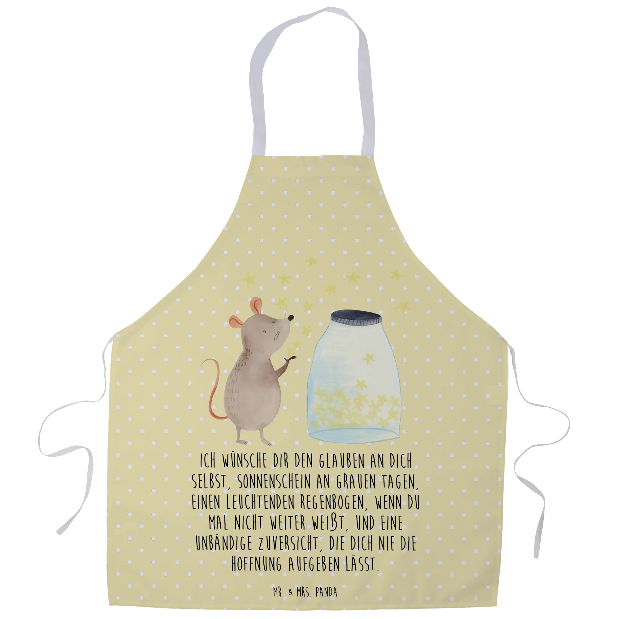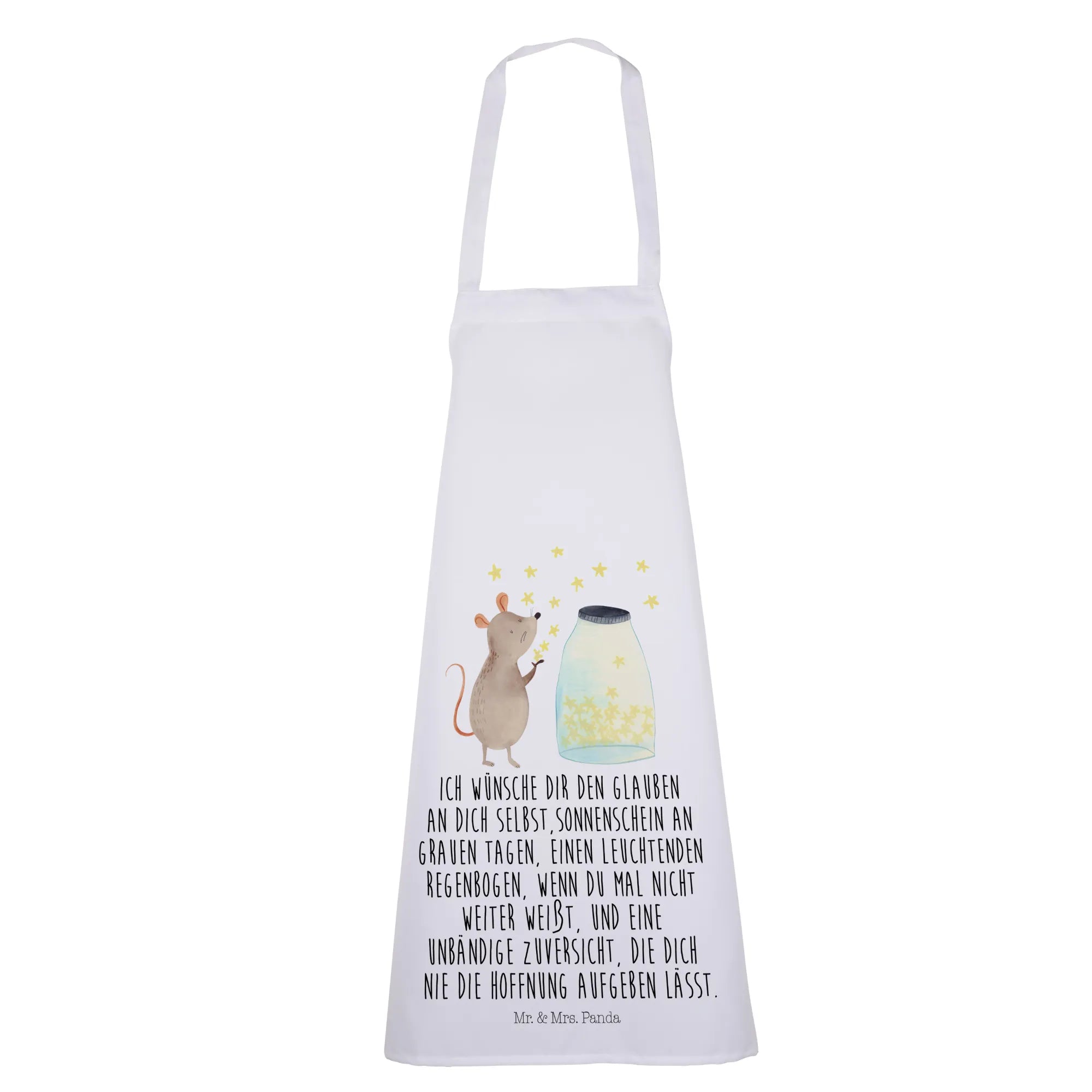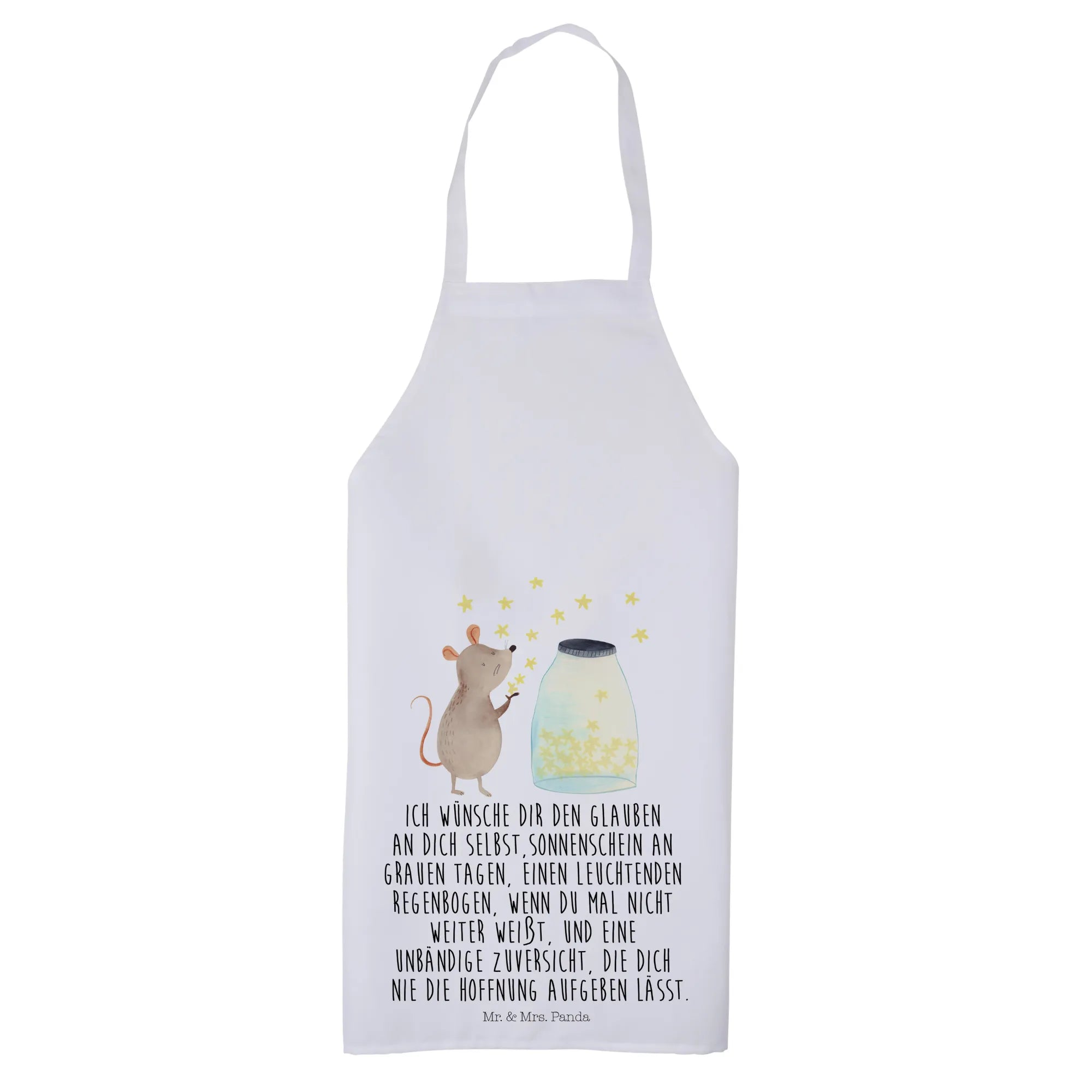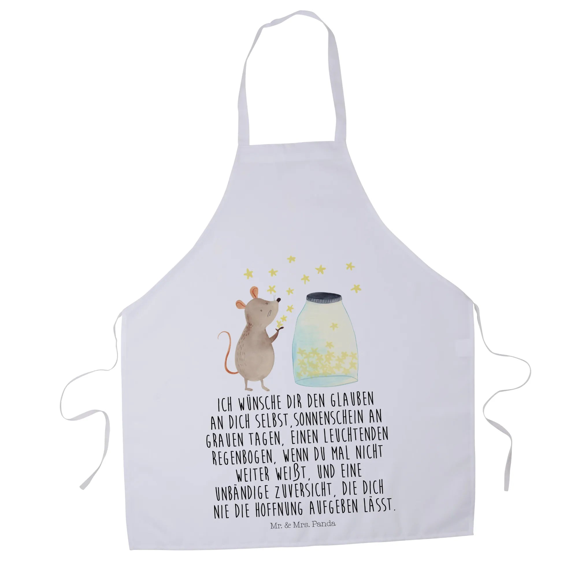 Die wunderschöne Kochschürze mit dem Motiv Maus Sterne aus der Small World Kollektion von Mr. & Mrs. Panda ist das perfekte Geschenk für kleine und große Küchenchefs. Ob beim Kochen, Backen oder Grillen – diese schicke Schürze bringt Freude und gute Laune in jede Küche. Mit ihrem süßen Design, das eine niedliche Maus vor funkelnden Sternen zeigt, zaubert sie selbst an grauen Tagen ein Lächeln ins Gesicht. Zudem sorgt der inspirierende Spruch "Ich wünsche dir den Glauben an dich selbst, Sonnenschein an grauen Tagen und eine unbändige Zuversicht, die dich nie die Hoffnung aufgeben lässt" für eine Portion Motivation beim Zubereiten Deiner Lieblingsgerichte.