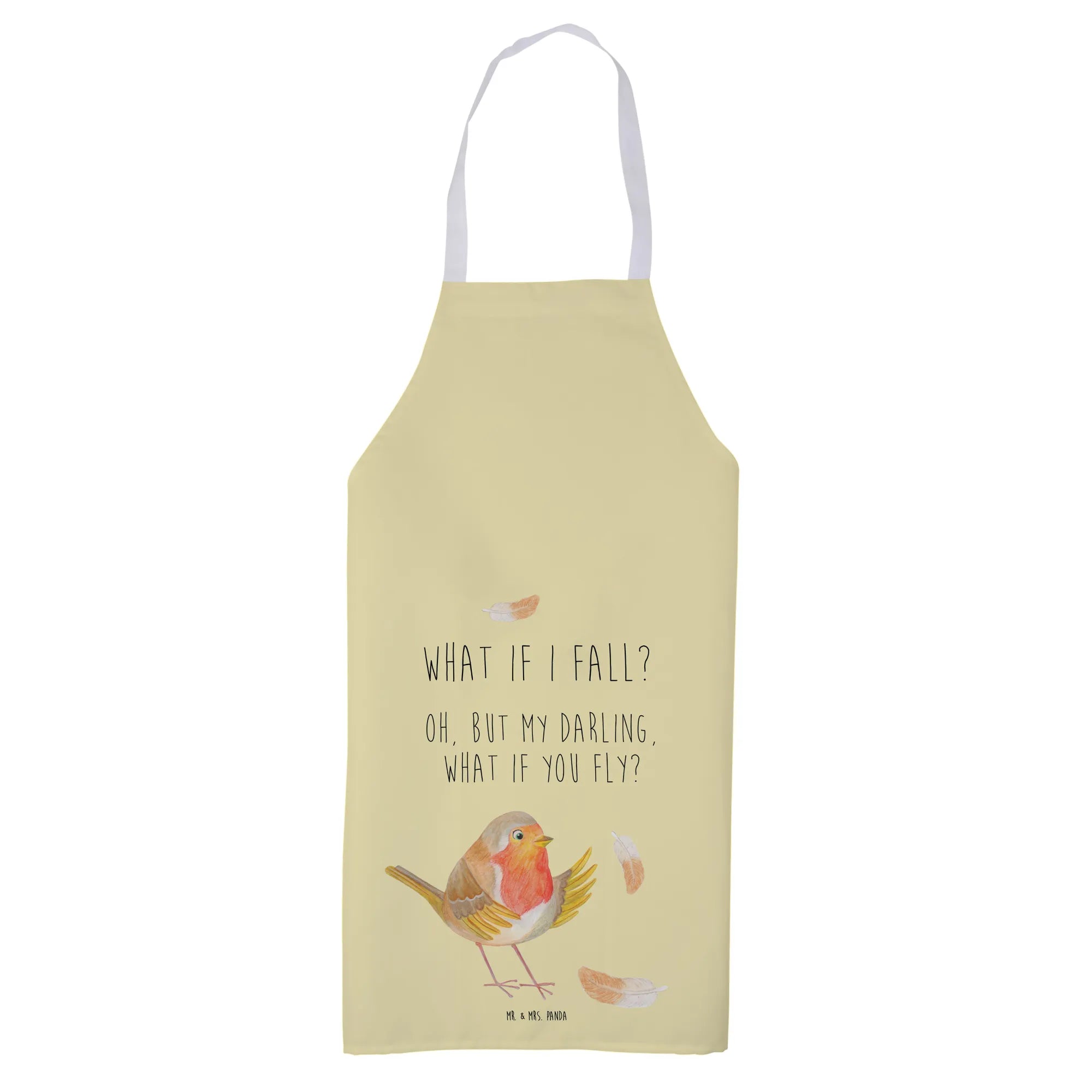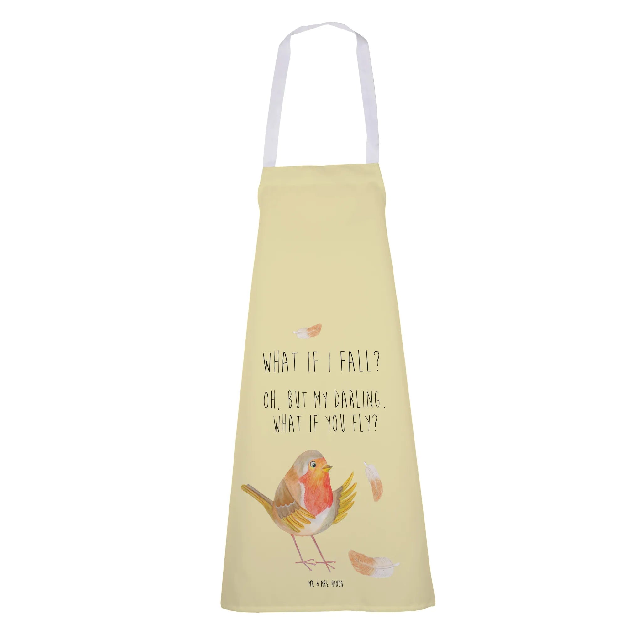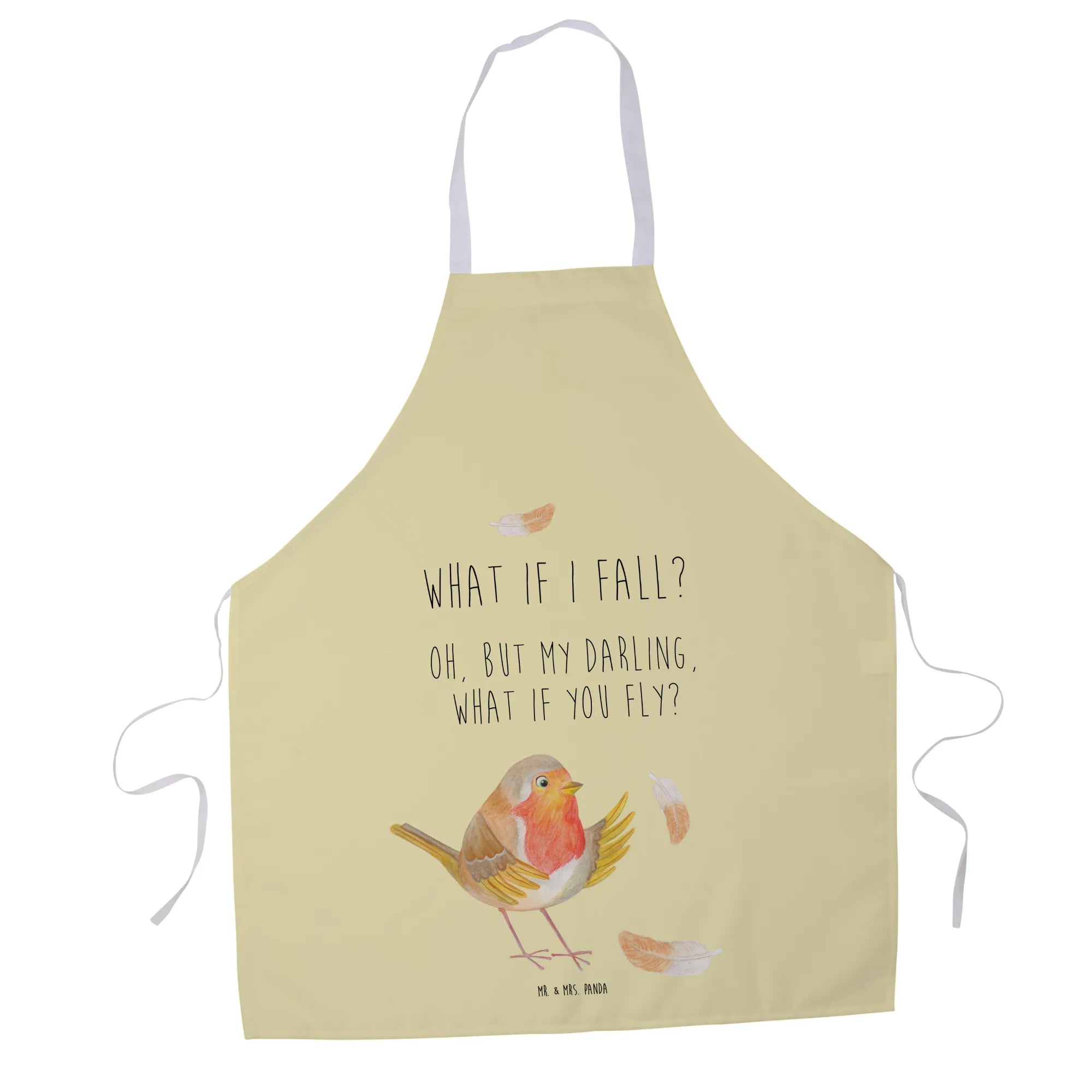 Doch das Highlight dieser Schürze ist das zauberhafte Design: Das süße Rotkehlchen, das mit so viel Liebe von Mrs. Panda gezeichnet wurde, bringt jede Küche zum Strahlen. Umgeben von bunten Federn vermittelt der kleine Vogel eine friedliche Ruhe und lässt dich beim Kochen und Backen in eine entspannende Atmosphäre eintauchen. Es ist, als würde das Rotkehlchen dir zuflüstern: „Was wäre, wenn ich falle? Oh, aber mein Schatz, was wäre, wenn du fliegst?“ Diese Motivationsbotschaft begleitet dich beim Zubereiten deiner Lieblingsgerichte und sorgt stets für gute Laune.