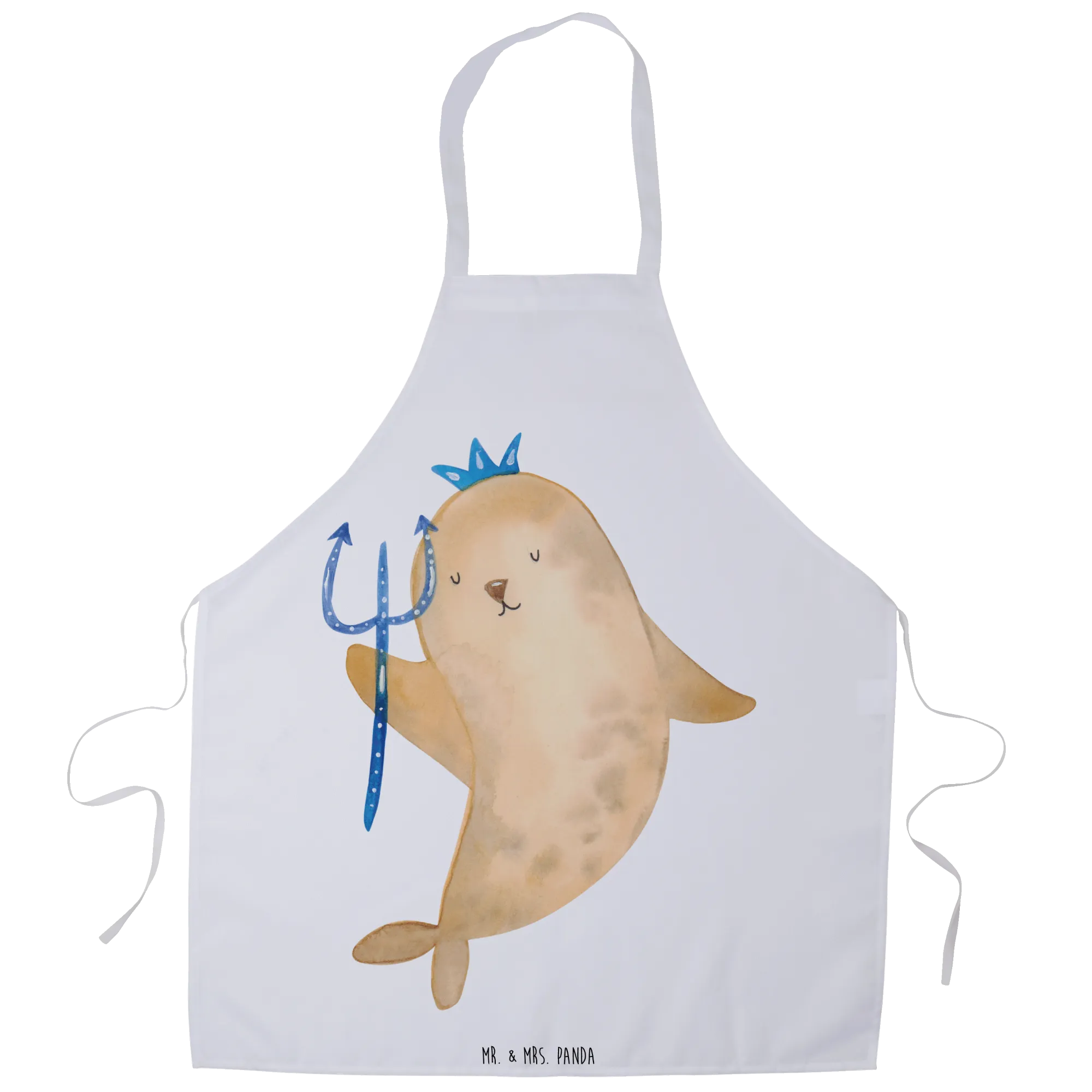 Diese Kochschürze, hochwertig gefertigt aus feiner Premium Kunstfaser in strahlendem Weiß, bringt nicht nur Stil in die Küche, sondern auch eine Portion Humor und Lebensfreude. Das süße Motiv zeigt einen schimmernden Wassermann mit einer Robbe, die eine Krone trägt und einen Zepter in der Hand hält - spontan und grandios, so beschrieben wir unseren Wassermann ideal.