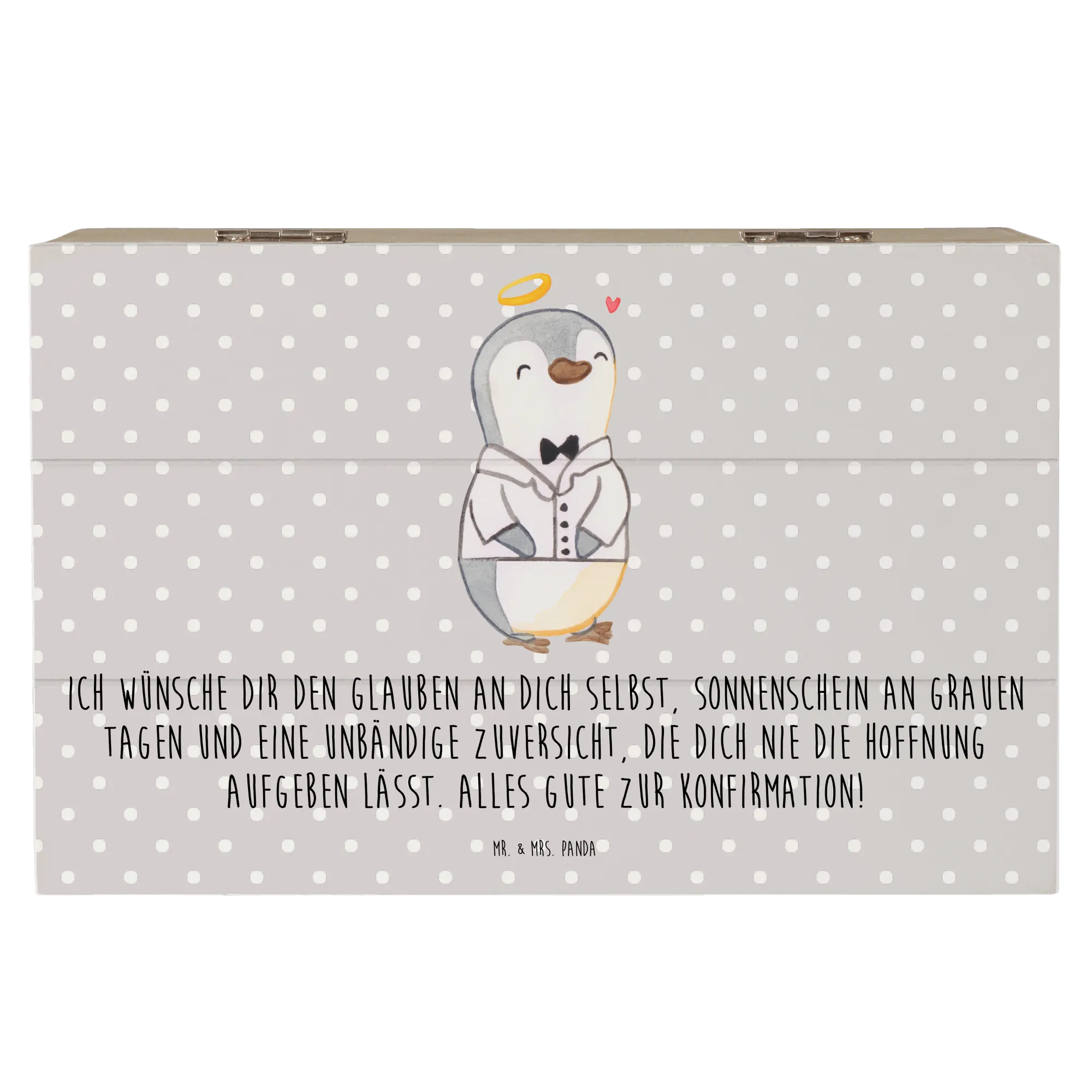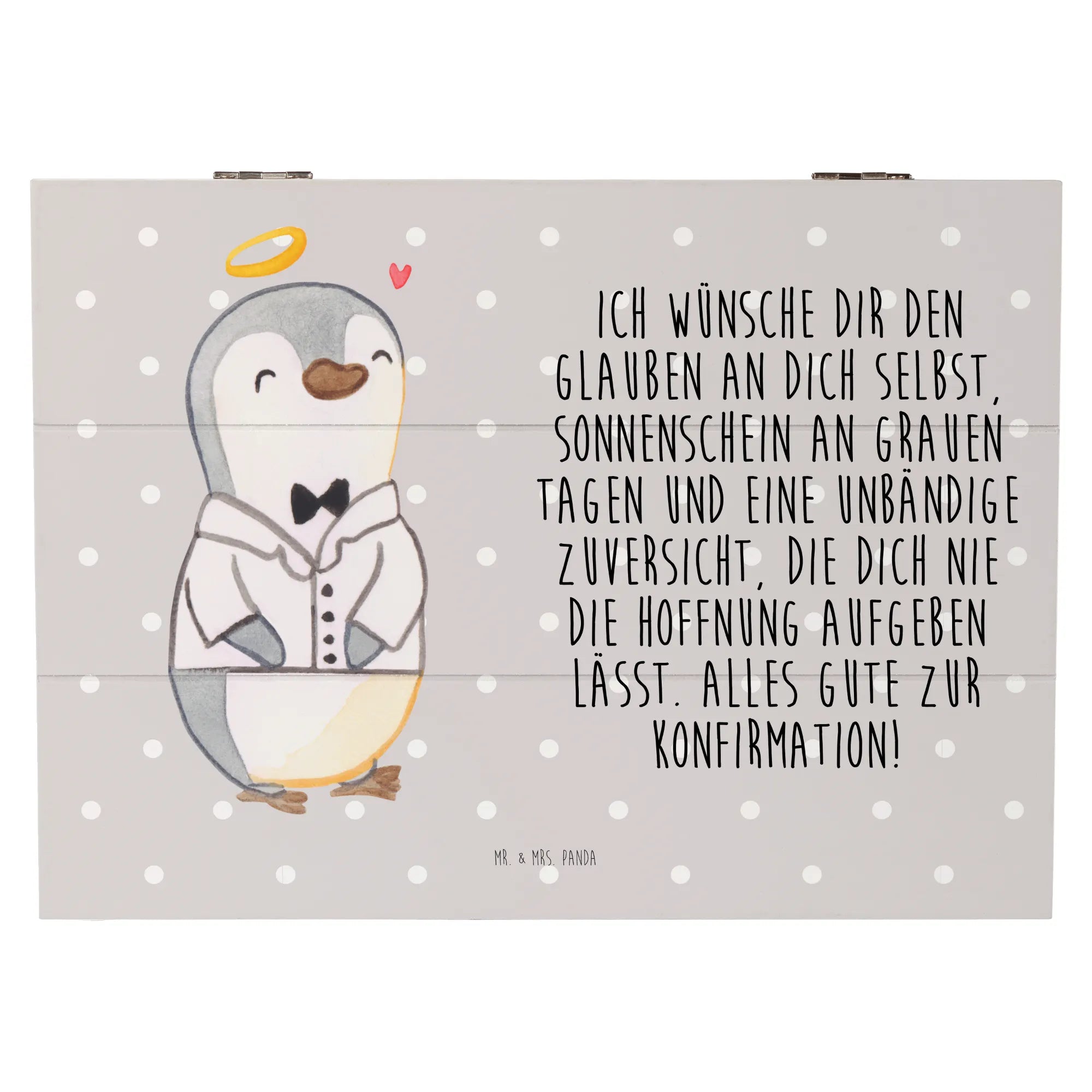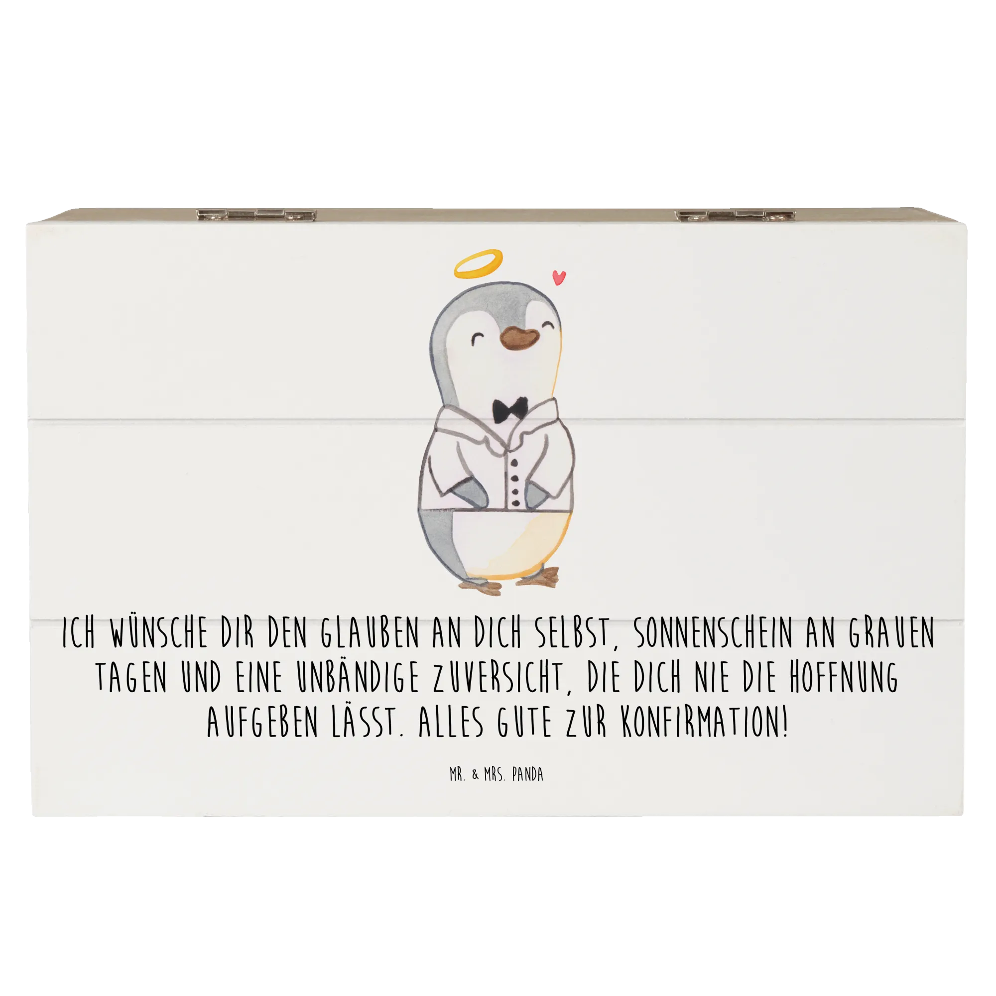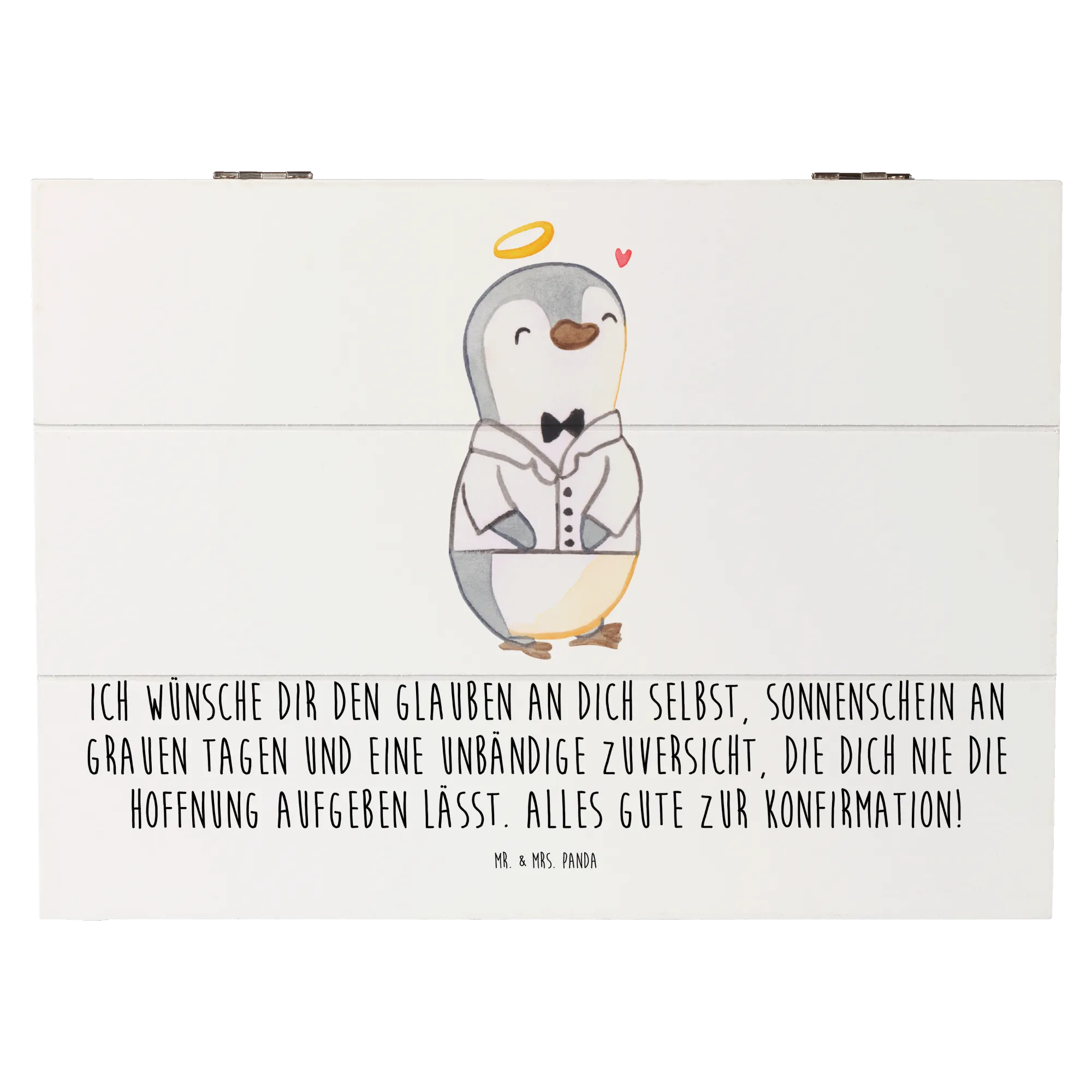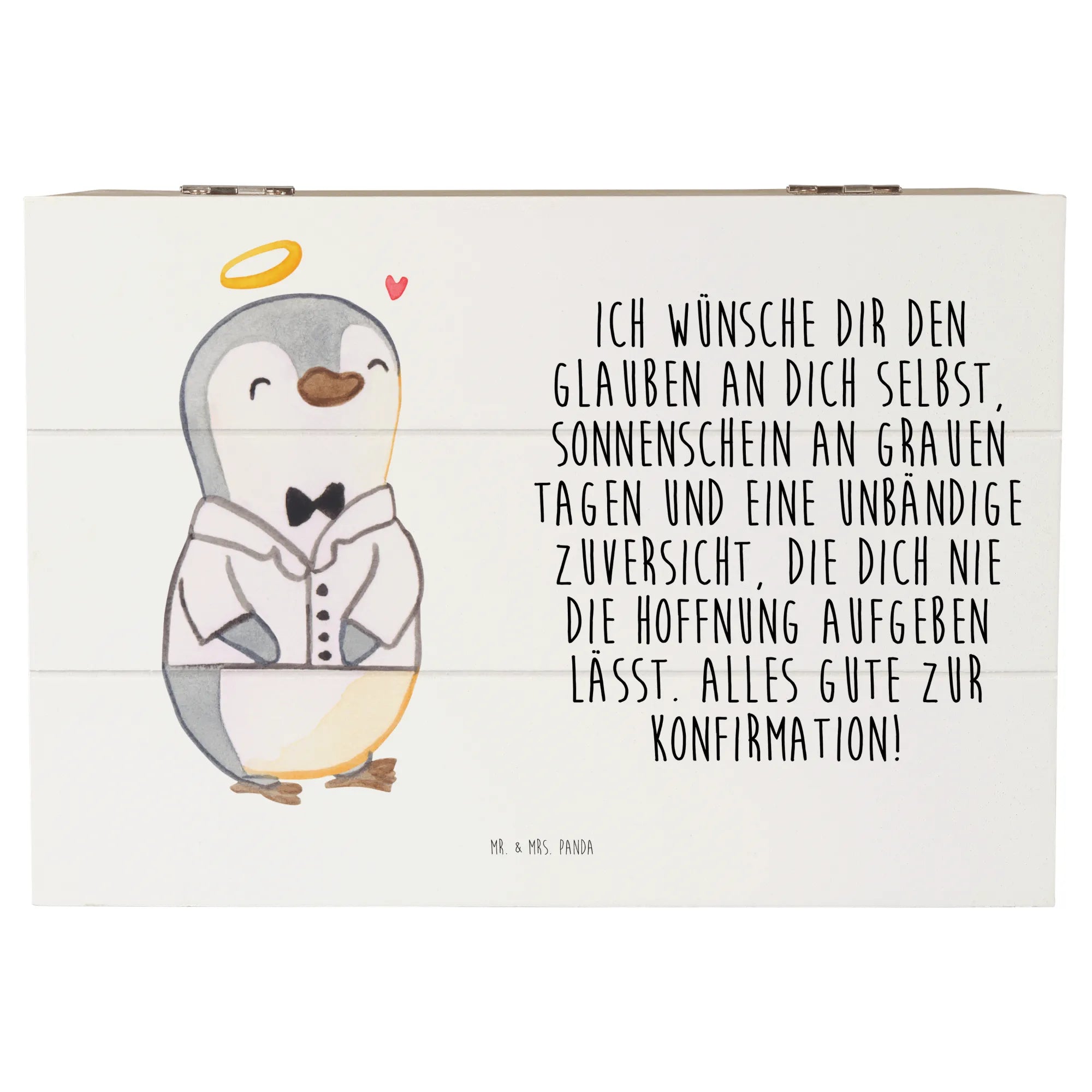 Die wunderschöne Holzkiste mit dem süßen Pinguin Motiv "Konfirmation Hemd" von Mr. & Mrs. Panda ist das perfekte Geschenk zur Konfirmation, Kommunion oder Jugendweihe! Diese liebevoll gestaltete Schatzkiste bietet nicht nur einen stilvollen Aufbewahrungsort für all die wertvollen Erinnerungen und kleinen Schätze, die man im Laufe der Jahre ansammelt, sondern leistet auch einen Beitrag zur Nachhaltigkeit, da sie immer wieder verwendet werden kann.