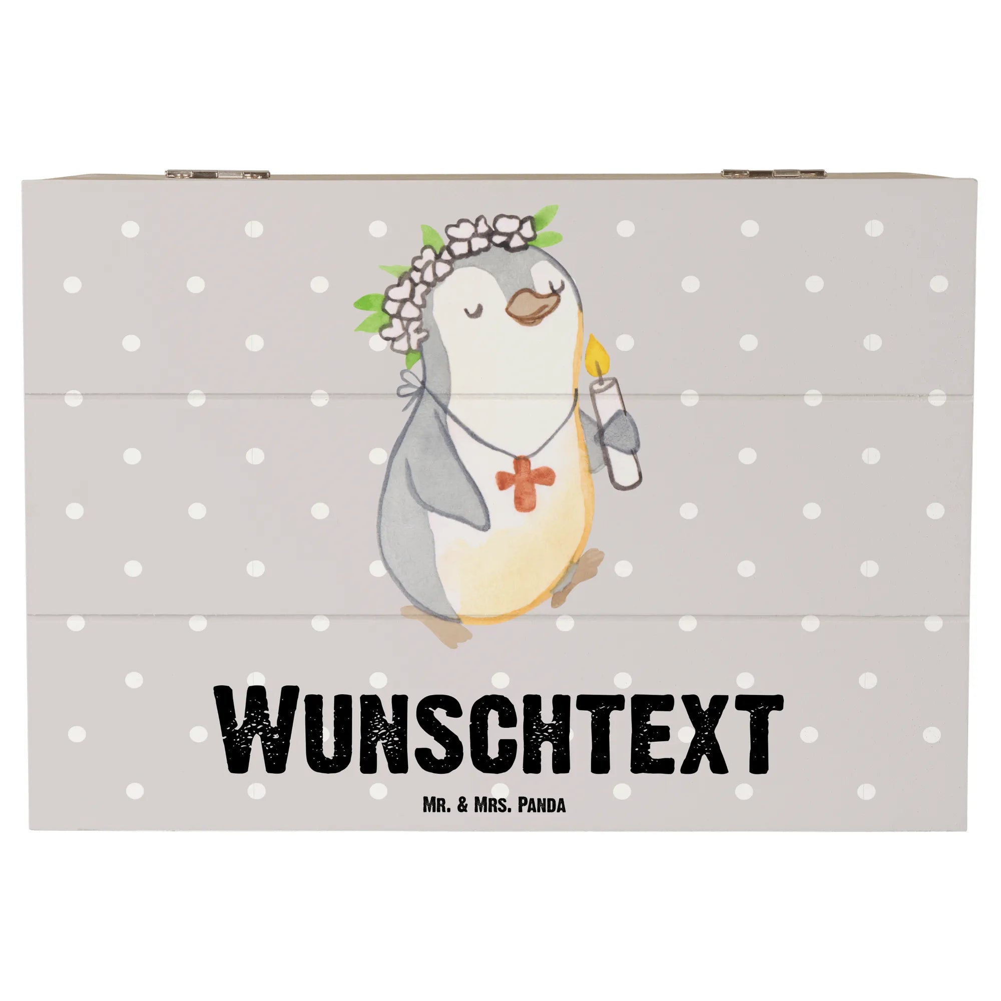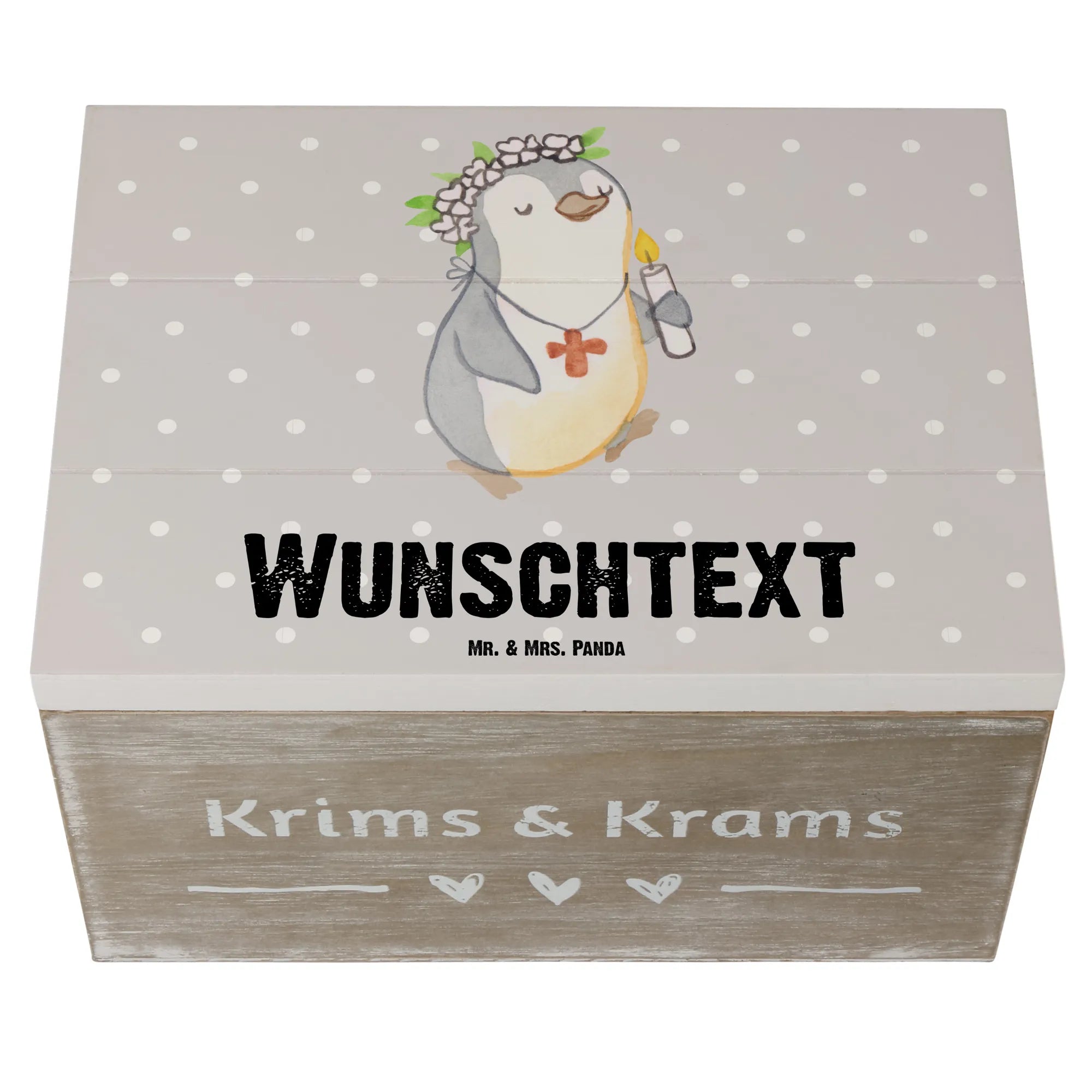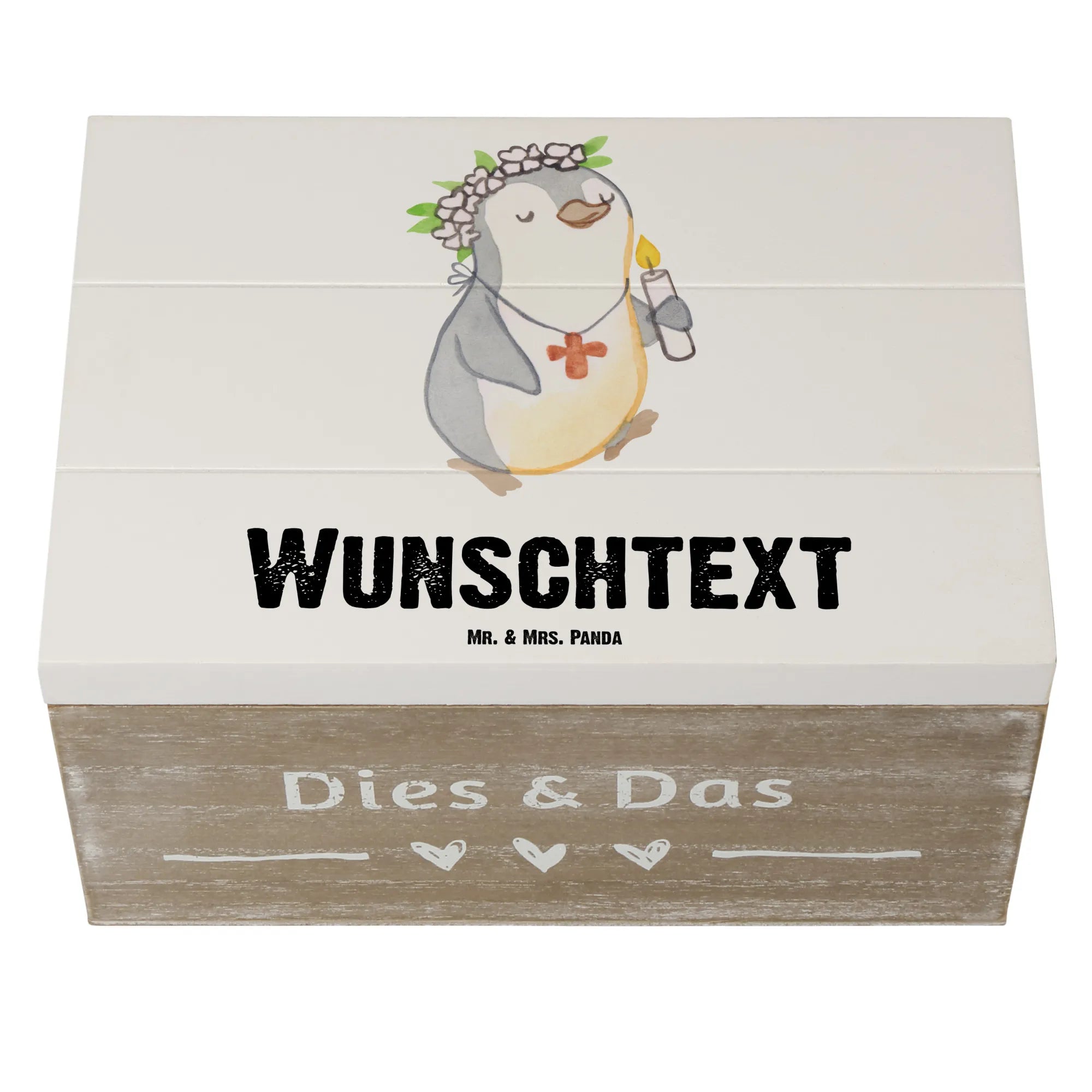 Die personalisierte Holzkiste "Pinguin Kommunion Mädchen" von Mr. & Mrs. Panda ist das perfekte Geschenk zur Kommunion oder Konfirmation für kleine Mädchen. Diese bezaubernde Kiste, gefertigt aus hochwertiger Premium Hartfaser, misst 19 x 12 cm und hat die ideale Größe, um all die kleinen Schätze und Erinnerungen zu verstauen.