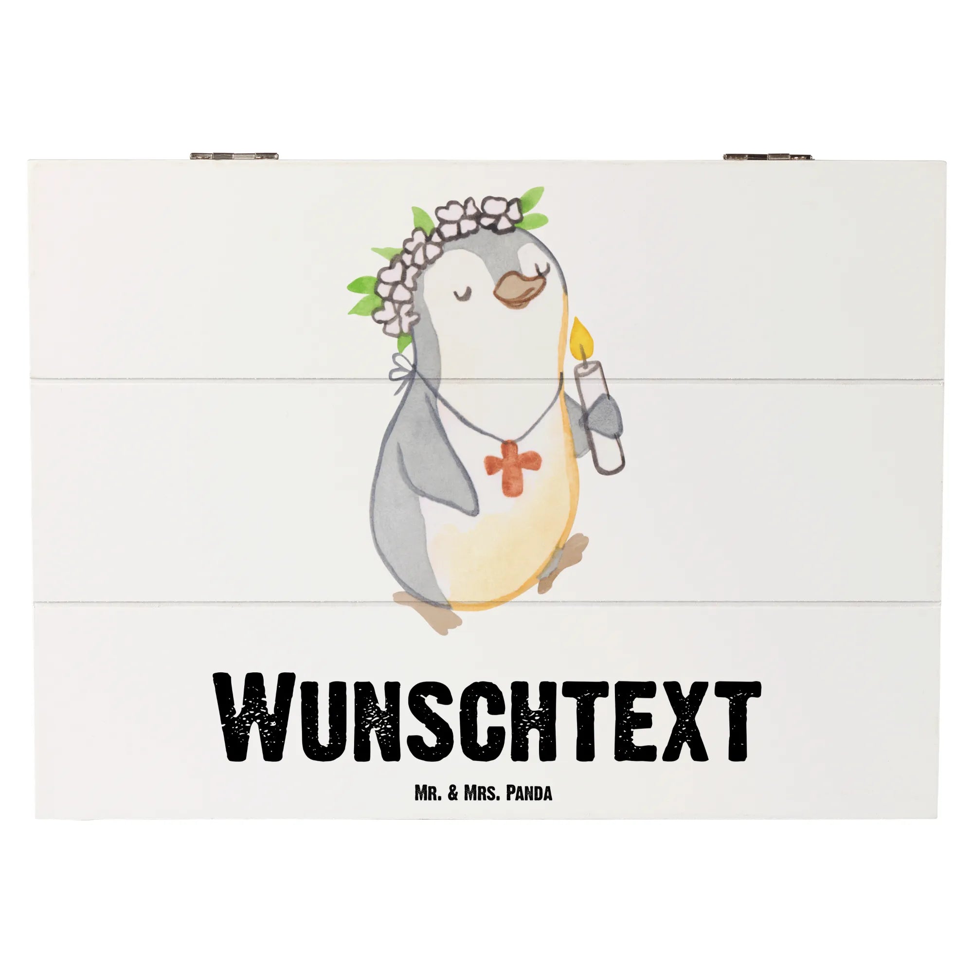 Die personalisierte Holzkiste 'Pinguin Kommunion Mädchen' von Mr. & Mrs. Panda ist ein ganz besonderes Geschenk zur Kommunion oder Konfirmation. Diese entzückende Kiste begeistert durch ihr tolles Design mit einem süßen Pinguin-Mädchen, das stolz eine Kerze in der Hand hält. Gleichzeitig trägt sie eine Halskette mit einem Kreuz und Blumen auf dem Kopf - einfach zauberhaft!