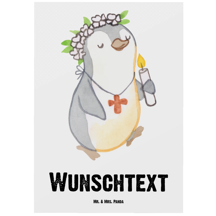 Die personalisierte Postkarte "Pinguin Kommunion Mädchen" aus der liebevollen Kollektion von Mr. & Mrs. Panda ist der perfekte Begleiter für diesen besonderen Anlass. Mit einem niedlichen Pinguin-Mädchen, das stolz mit einer Kerze in der Hand, einer Halskette mit einem Kreuz und Blumen auf dem Kopf marschiert, sendest du nicht nur Glückwünsche, sondern auch eine liebevolle Botschaft.