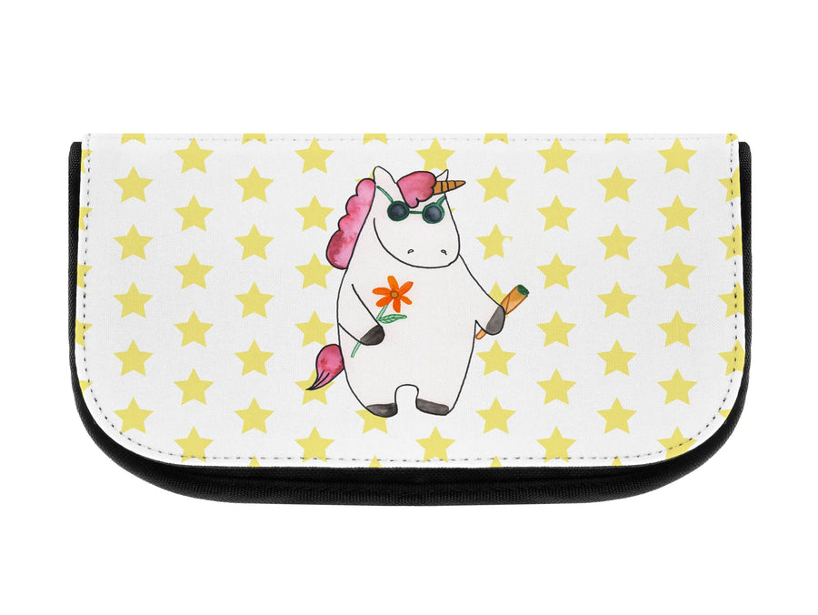 Die Kosmetiktasche Einhorn Woodstock von Mr. & Mrs. Panda ist das perfekte Geschenk für alle Einhornliebhaber! Mit einem liebevoll gestalteten Motiv, das ein cooles Einhorn mit Sonnenbrille und Joint zeigt, zaubert sie jedem ein Lächeln ins Gesicht.