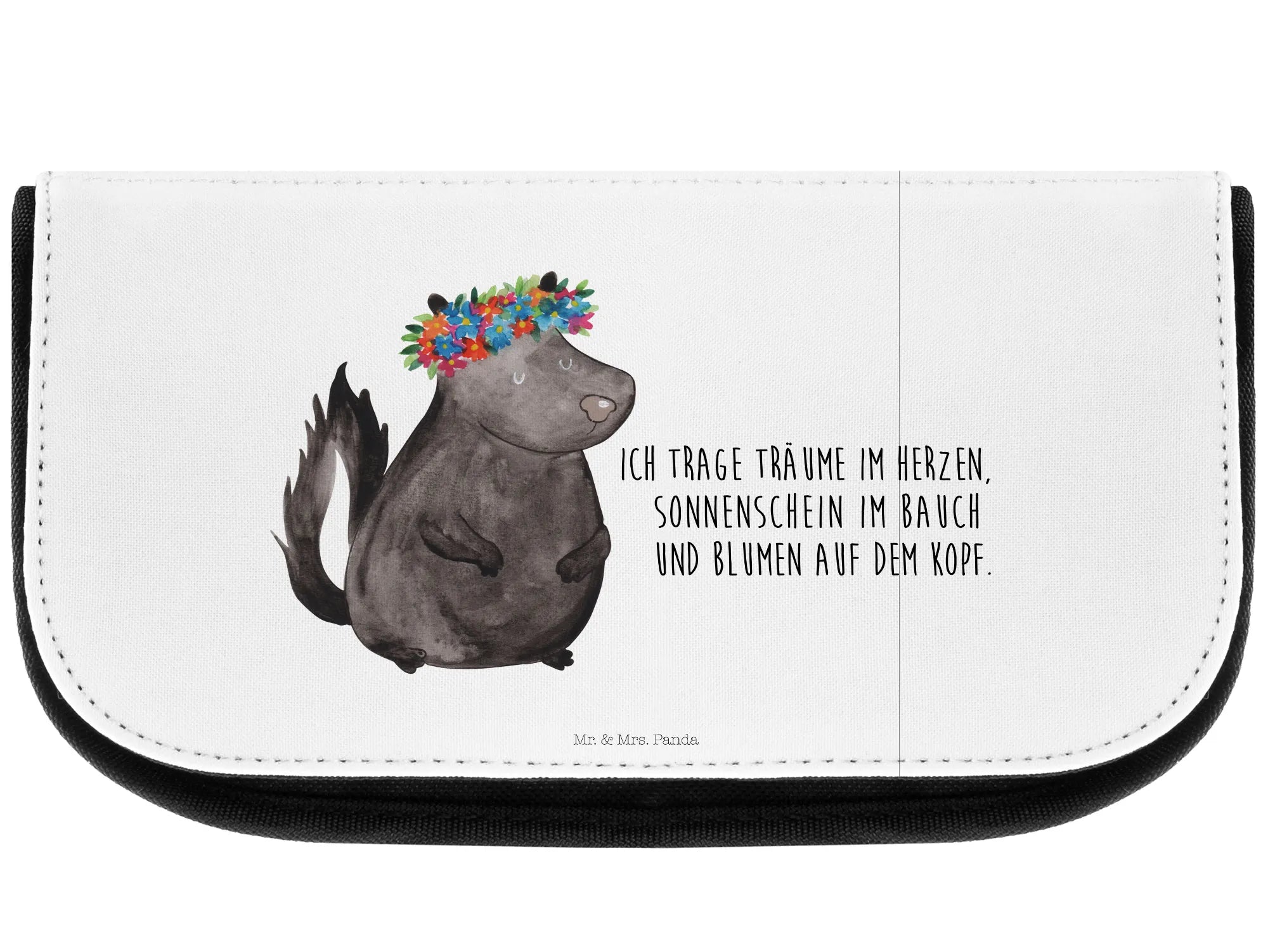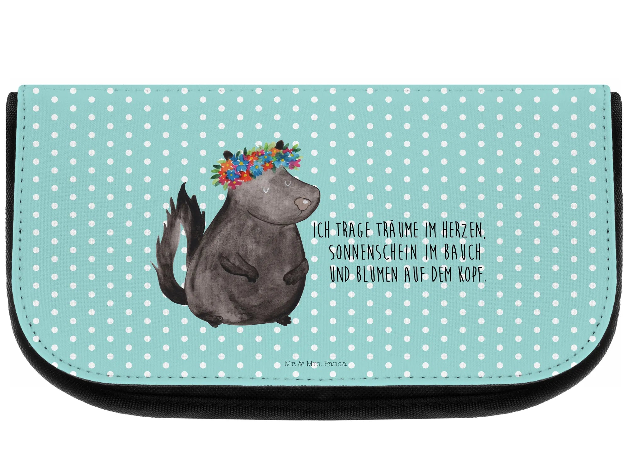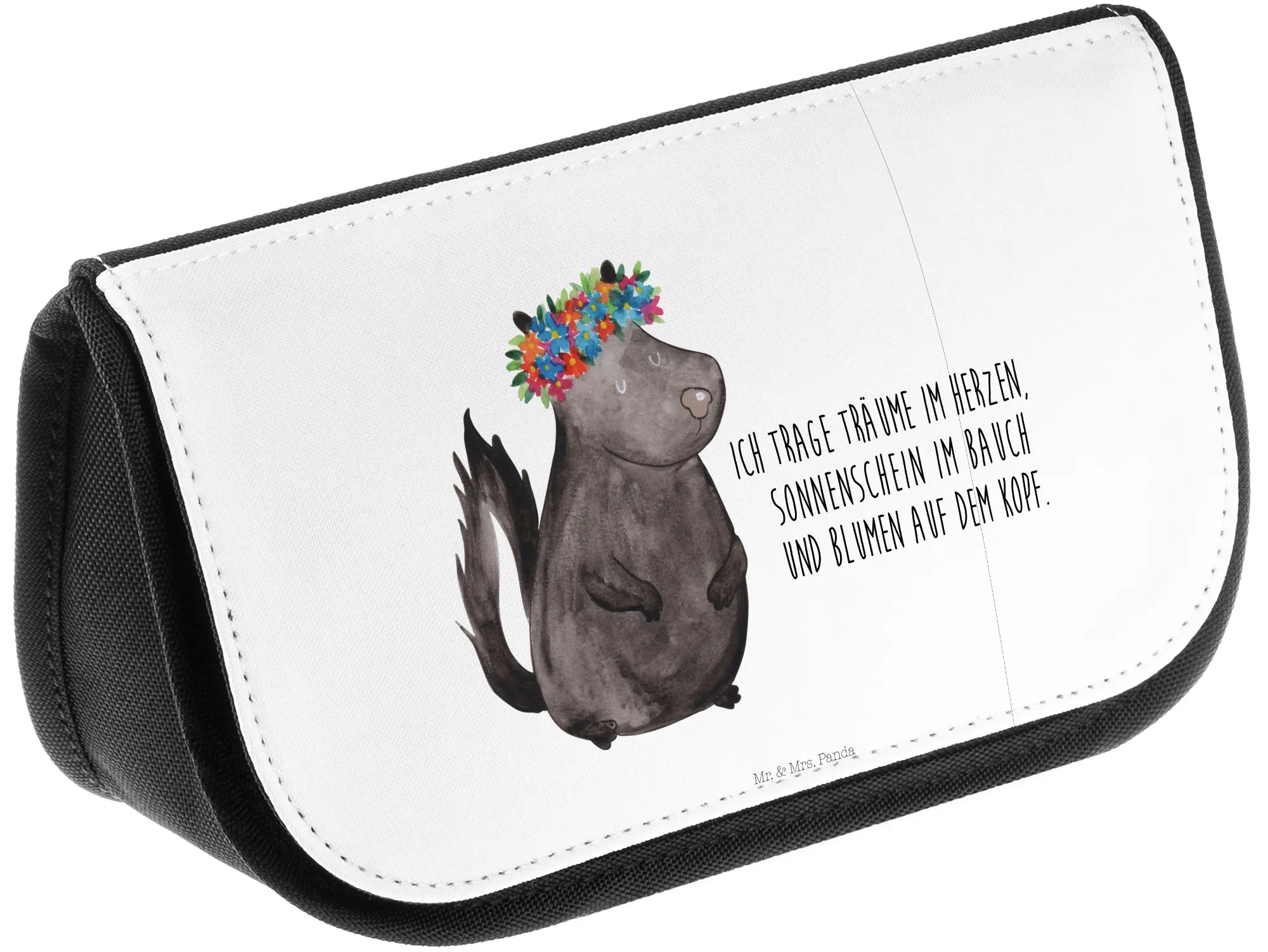Die Kosmetiktasche Stinktier Blumenmädchen von Mr. & Mrs. Panda ist das perfekte Geschenk für alle, die die Schönheit der Natur und etwas Einzigartiges schätzen. Diese superpraktische Kosmetiktasche ist nicht nur ein funktionales Accessoire, sondern auch ein fantastisches Kunstwerk, das mit viel Liebe gestaltet wurde. Das zauberhafte Motiv des Stinktiers mit einem bunten Blumenkranz auf dem Kopf versetzt Dich in eine Welt voller Freude und Lebendigkeit. Sie ist ideal für Damen, die ihre Make-Up Essenzen, Pflegeprodukte oder andere Beauty-Items übersichtlich verstauen möchten.