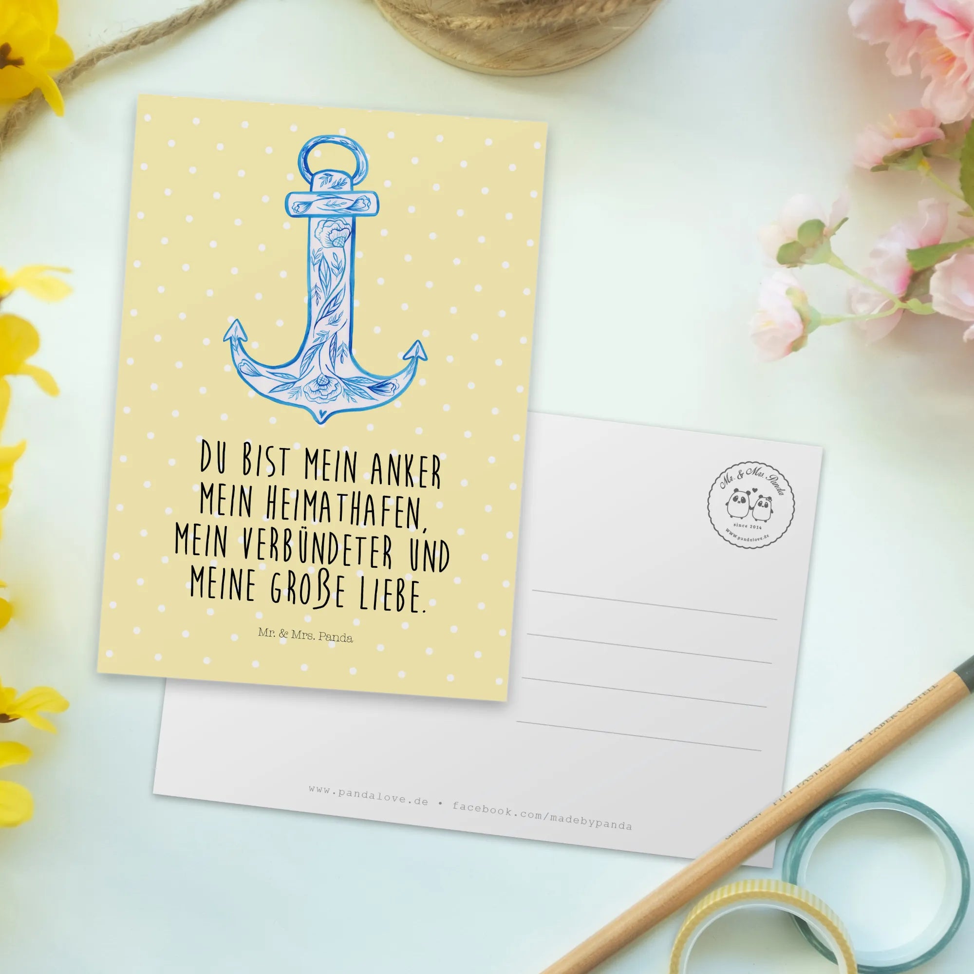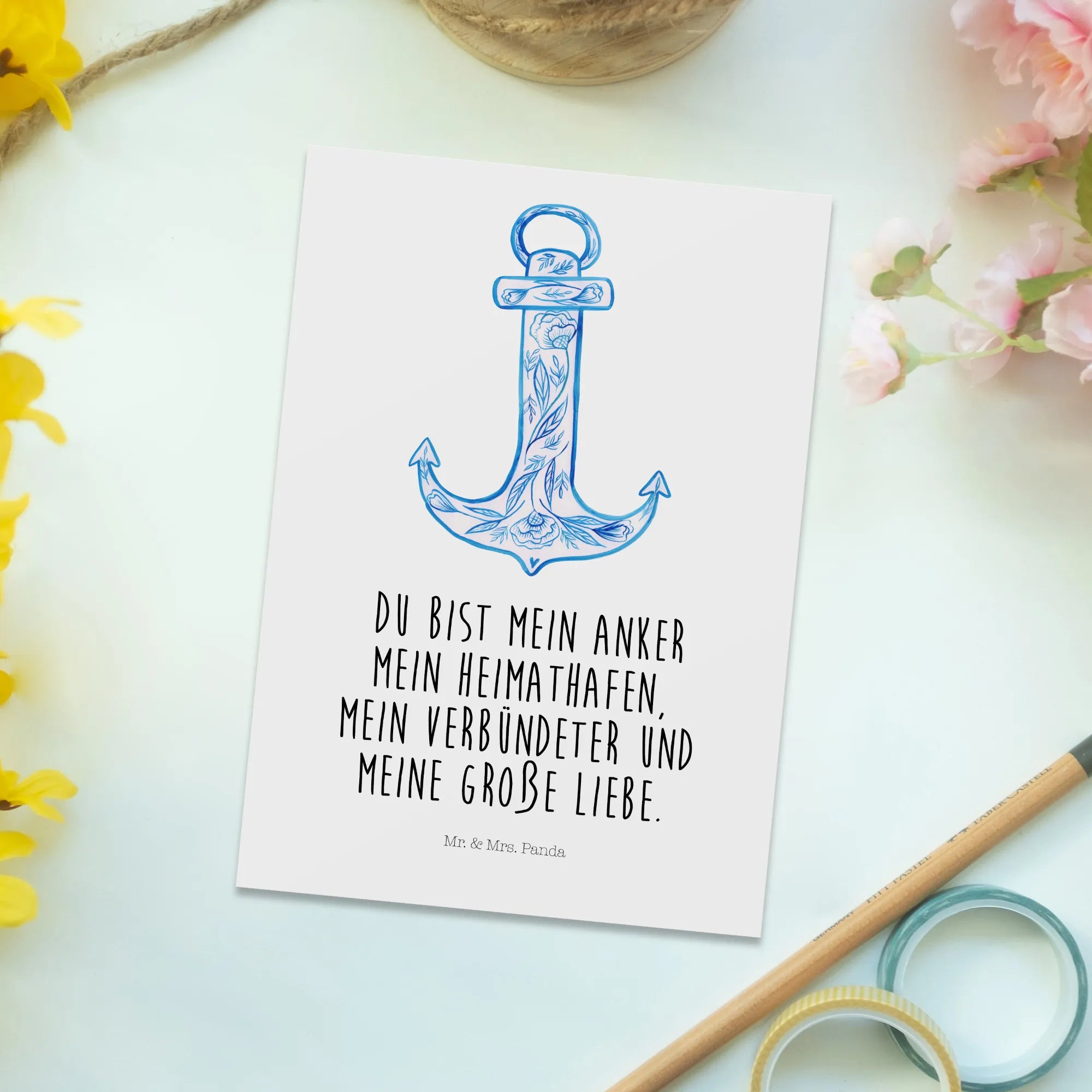 Entdecke die wunderschöne Postkarte "Anker Blau" aus der besonderen Kollektion Small World von Mr. & Mrs. Panda! Diese einzigartige Postkarte ist mehr als nur ein Stück Karton – sie ist ein kleiner Lichtblick für jeden Tag. Mit dem liebevoll gestalteten Anker in einem tiefen Blauton bringt sie Ruhe und Gelassenheit in dein Zuhause. Der Slogan "Du bist mein Anker, mein Heimathafen, mein Verbündeter und meine große Liebe" verleiht der Karte eine emotionale Note, die jede Botschaft zu etwas ganz Besonderem macht.