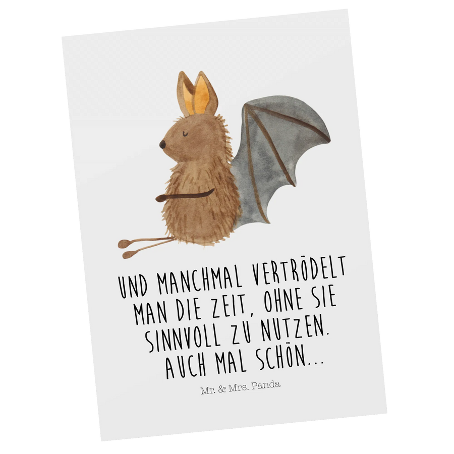 Mit dem Spruch "Und manchmal vertrödelt man die Zeit, ohne sie sinnvoll zu nutzen. Auch mal schön..." lädt diese Fledermaus dazu ein, die kleinen, glücklichen Momente im Leben anzunehmen. Diese Postkarte hat eine blanko Rückseite, sodass du sie ganz persönlich gestalten und deinen eigenen Worten Ausdruck verleihen kannst.