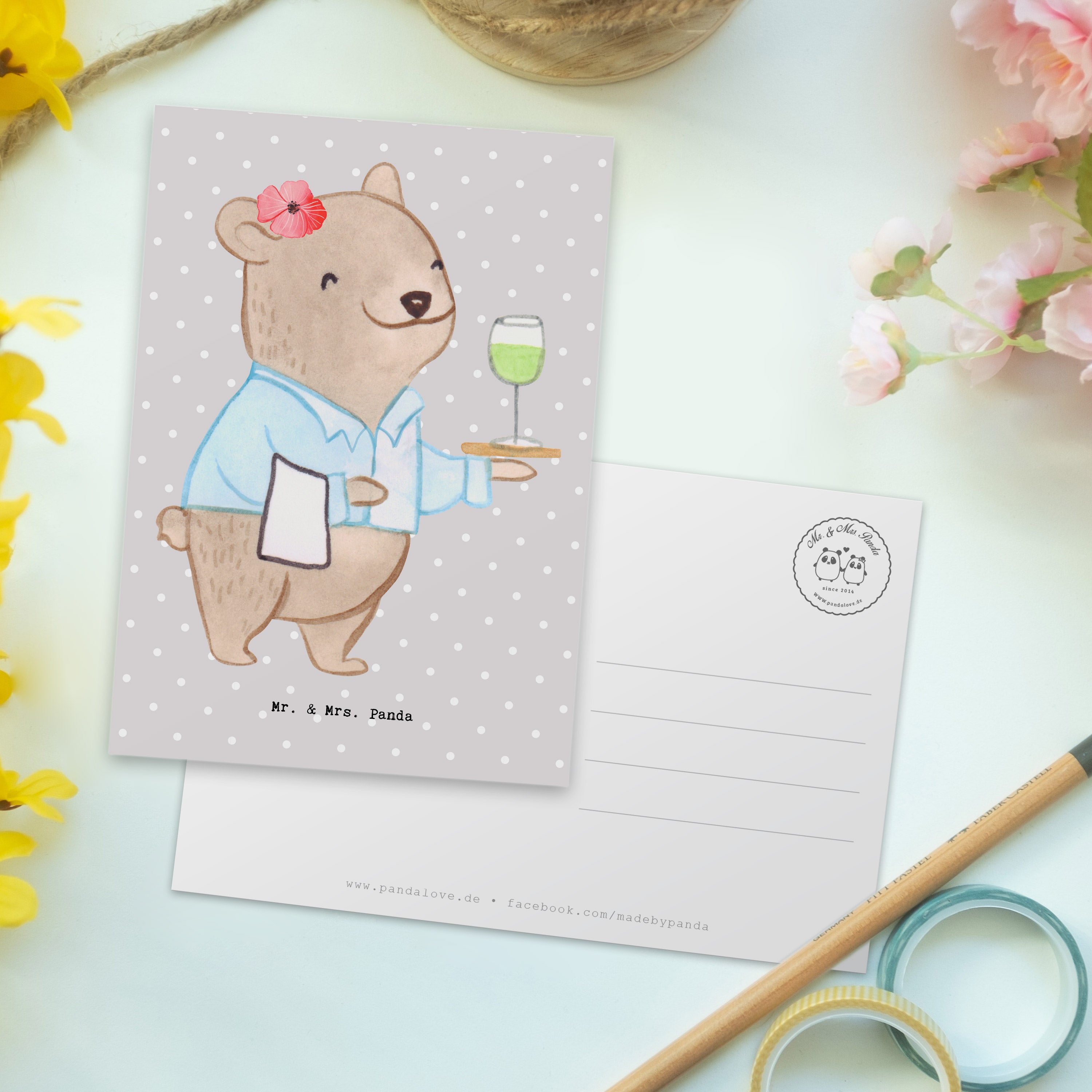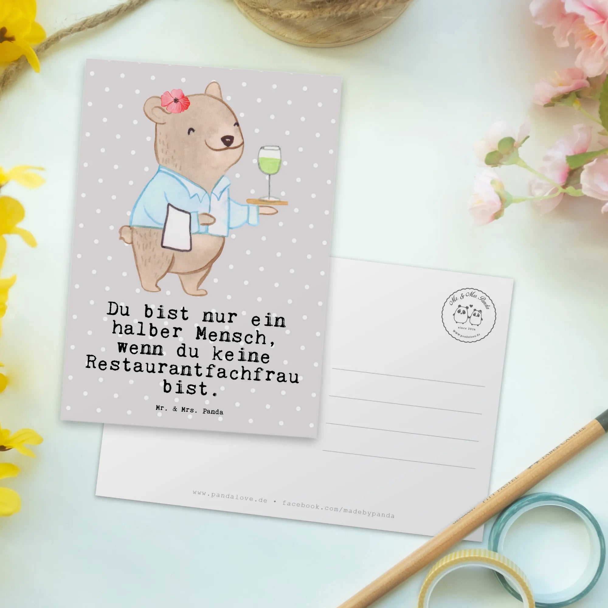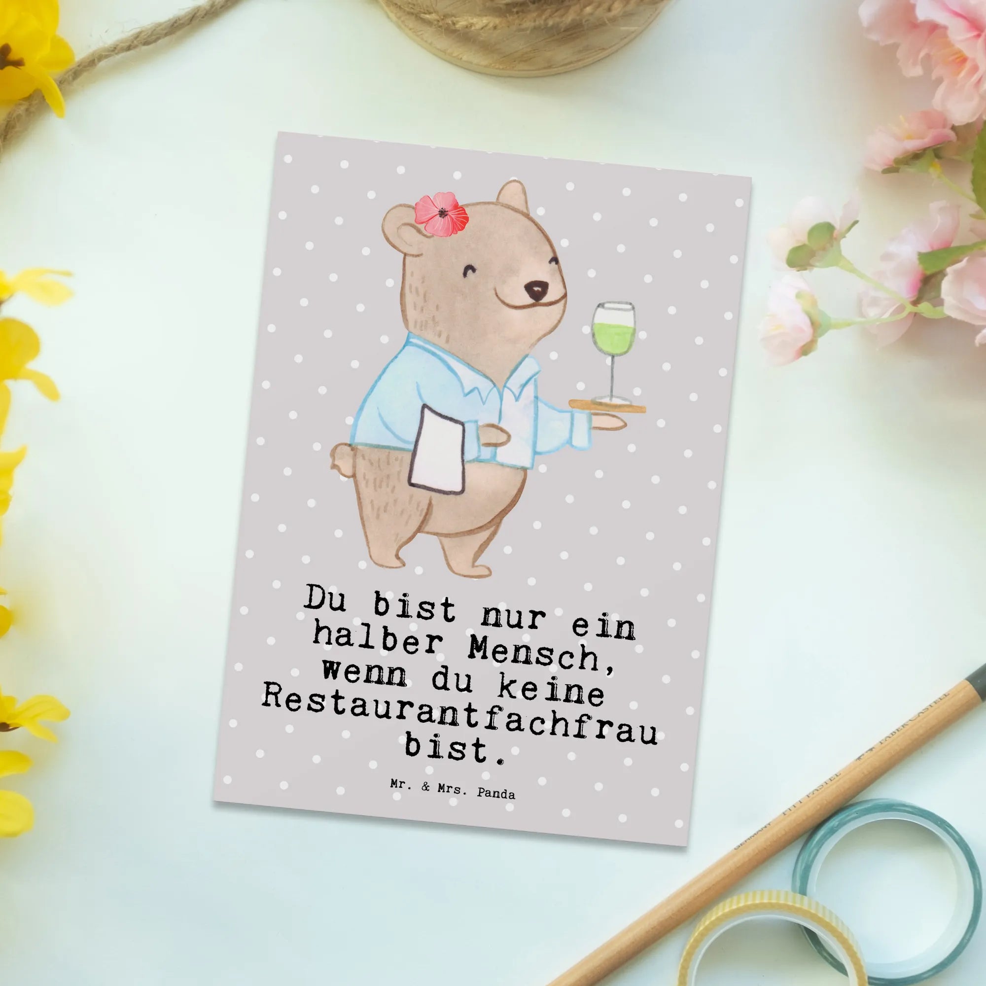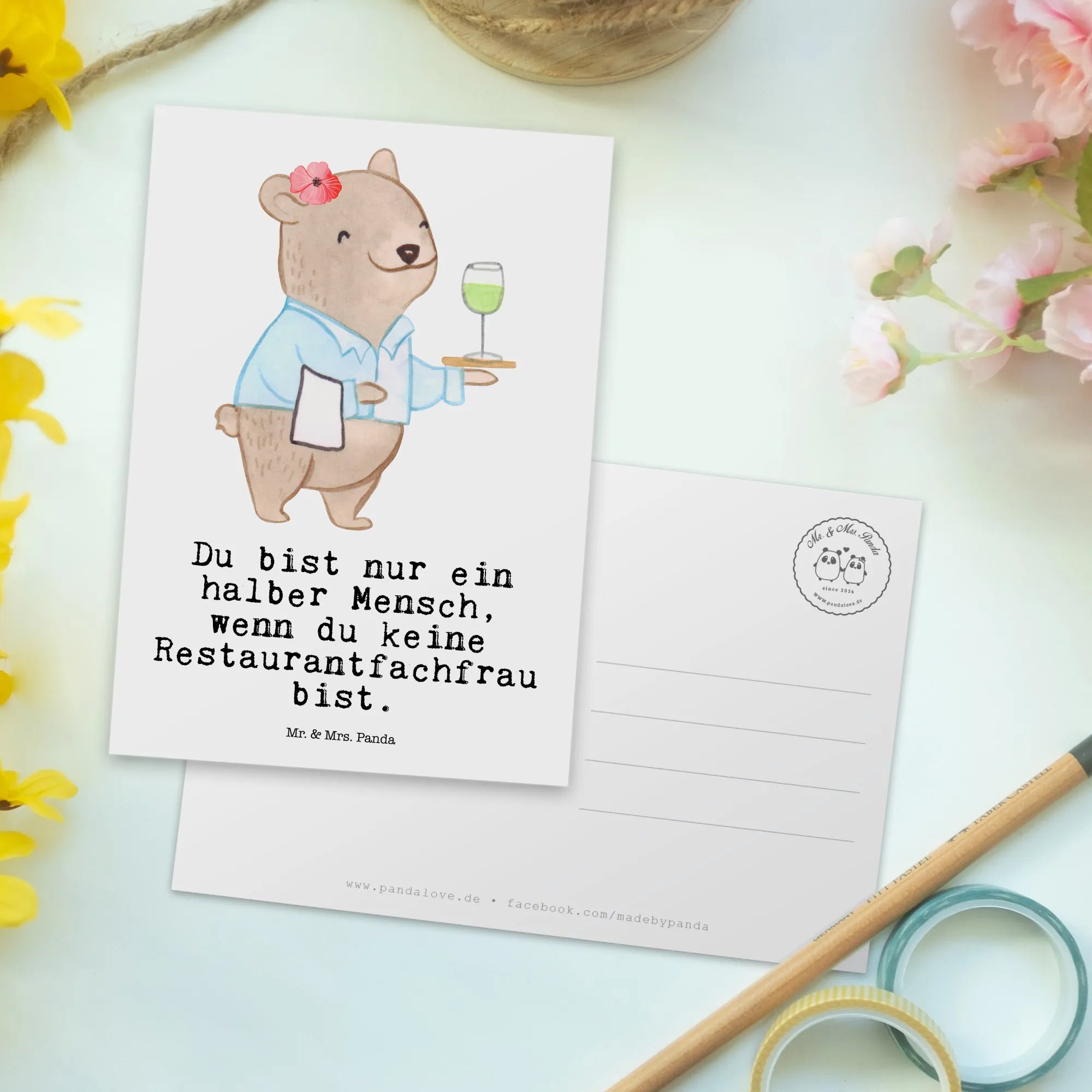 Gerade für Restaurantfachleute ist es wichtig, sich in einem so anspruchsvollen Beruf geschätzt und anerkannt zu fühlen. Mit dieser Postkarte gibst du der Person durch deine persönliche Botschaft die Möglichkeit, diese Wertschätzung zu empfinden. In der Berufe Kollektion von Mr. & Mrs. Panda findest du viele weitere tolle Motive, die perfekt für alle Berufsleute sind.