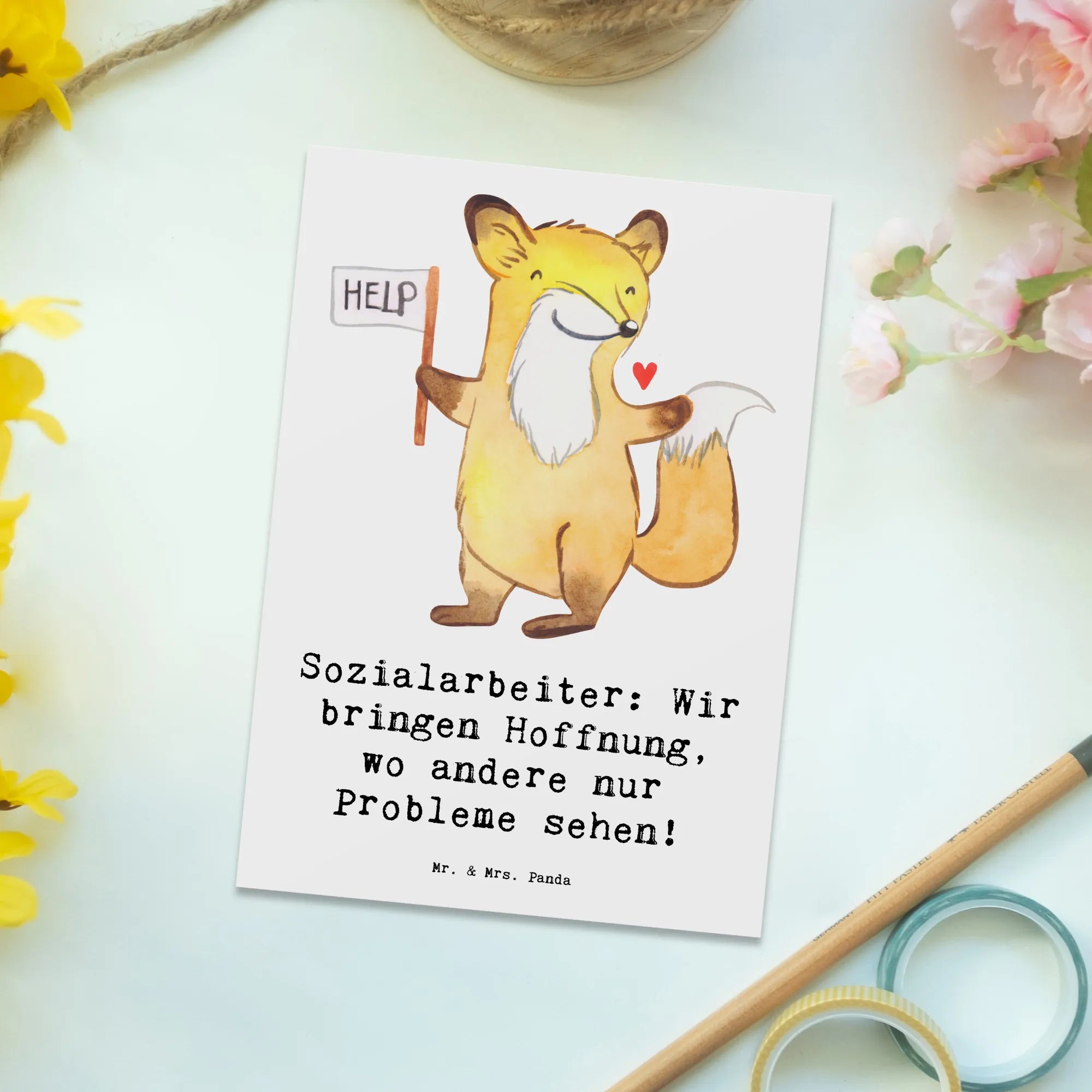 Entdecke die bezaubernde Postkarte für Sozialarbeiterinnen von Mr. & Mrs. Panda! Diese einzigartige Postkarte mit dem witzigen Spruch „Sozialarbeiter: Wir bringen Hoffnung, wo andere nur Probleme sehen!“ ist das perfekte Geschenk für alle, die in diesem wertvollen Beruf tätig sind.