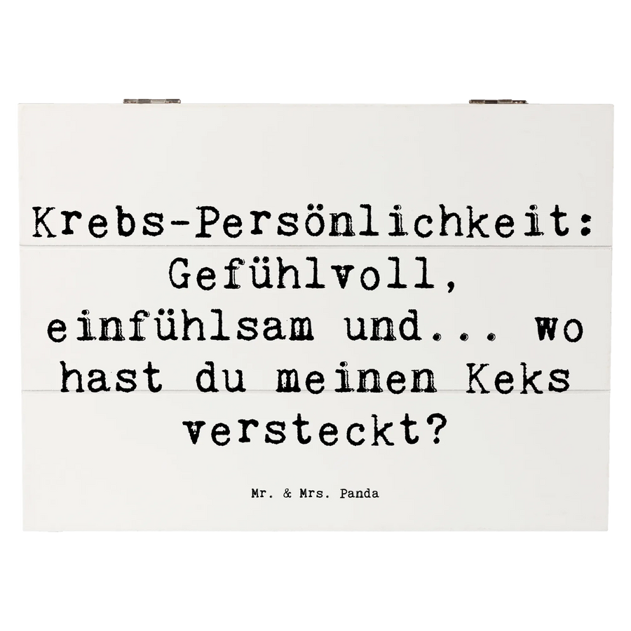 Eine liebevolle Holzkiste für Herzmenschen: Die Holzkiste Krebs von Mr. & Mrs. Panda ist die perfekte Kombination aus Funktion und Persönlichkeit. Mit dem charmanten Spruch „Krebs-Persönlichkeit: Gefühlvoll, einfühlsam und... wo hast du meinen Keks versteckt?“ bringt diese dekorative Schachtel ein Lächeln in jeden Raum und passt ideal zu Menschen, die ihr Sternzeichen mit Stolz und Humor tragen.